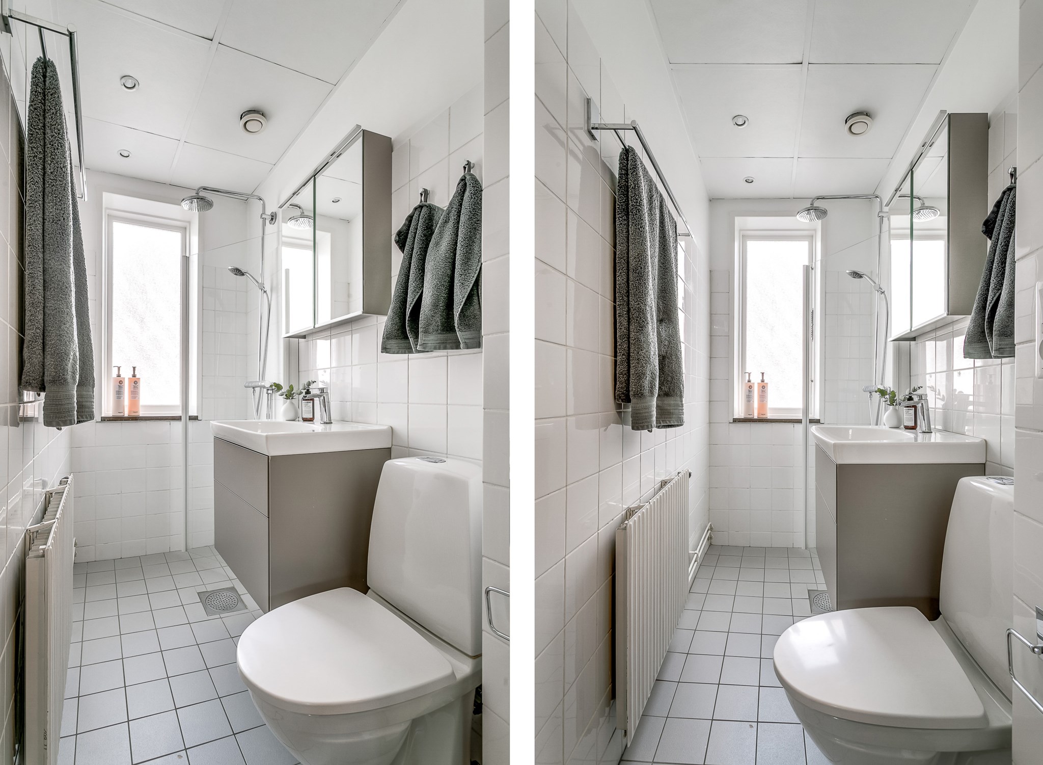 Fräscht badrum med grått klinkergolv och vita kaklade väggar. Utrustat med WC, handfat ovan kommod, dusch och spegelskåp. Praktiskt med vädringsfönster.
