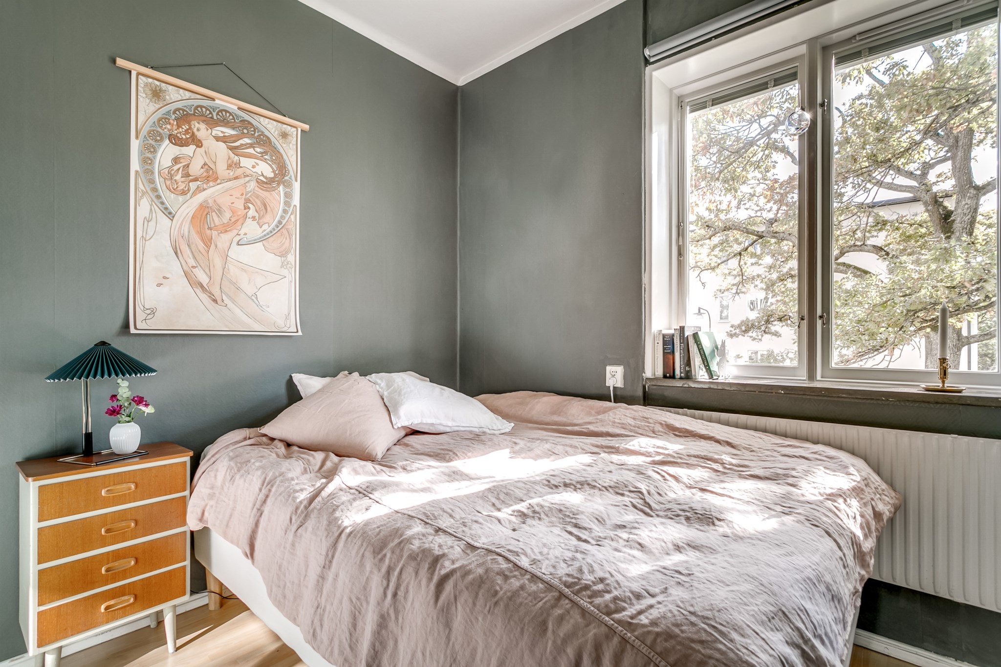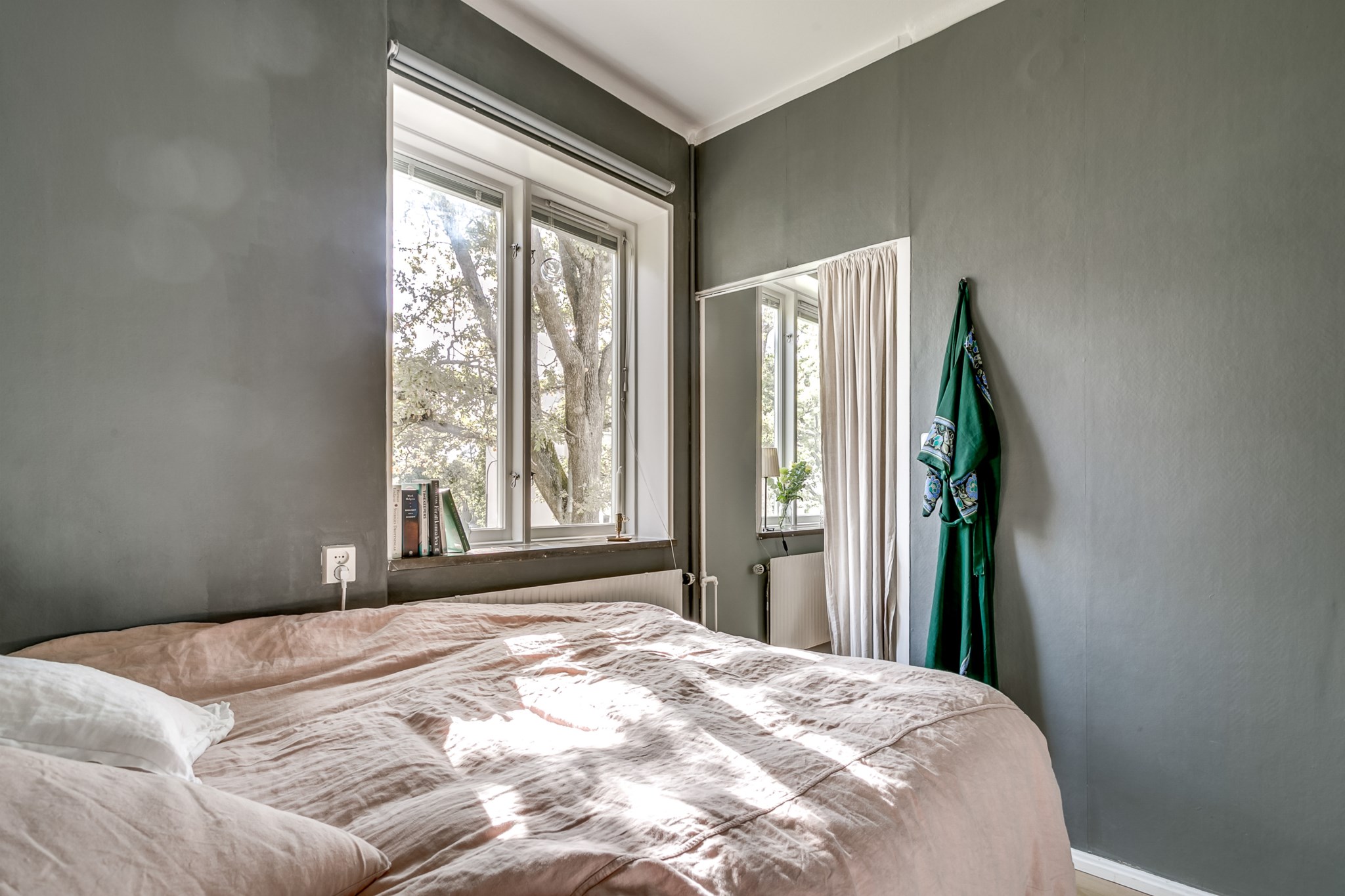 Harmoniskt sovrum med ljust golv och mörka väggar. Plats för dubbelsäng och goda förvaringsmöjligheter. Fönster ut mot grönska.