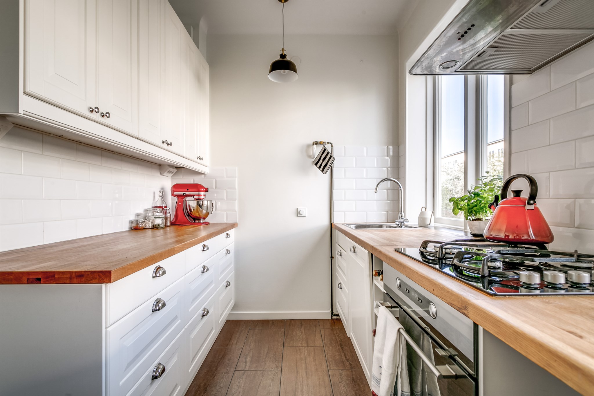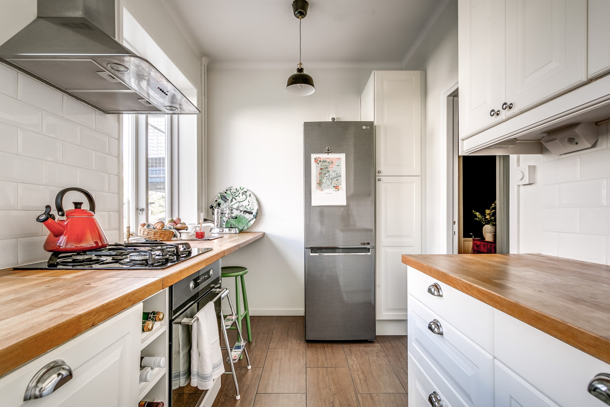 Modernt kök med ljust golv och ljust målade väggar. Utrustat med kyl/frys, gasspis, ugn, fläkt och diskmaskin. Förvaring i över- och underskåp bakom vita fronter med fina beslag. Arbetsyta ovan fin bänkskiva. Fönster med utsikt mot grönska.