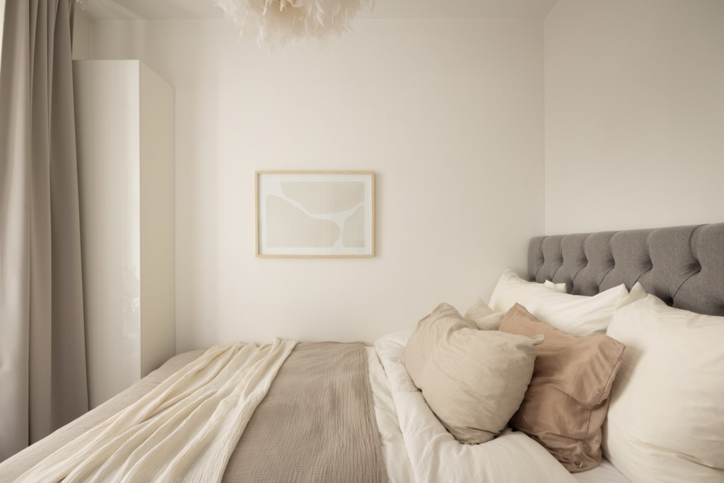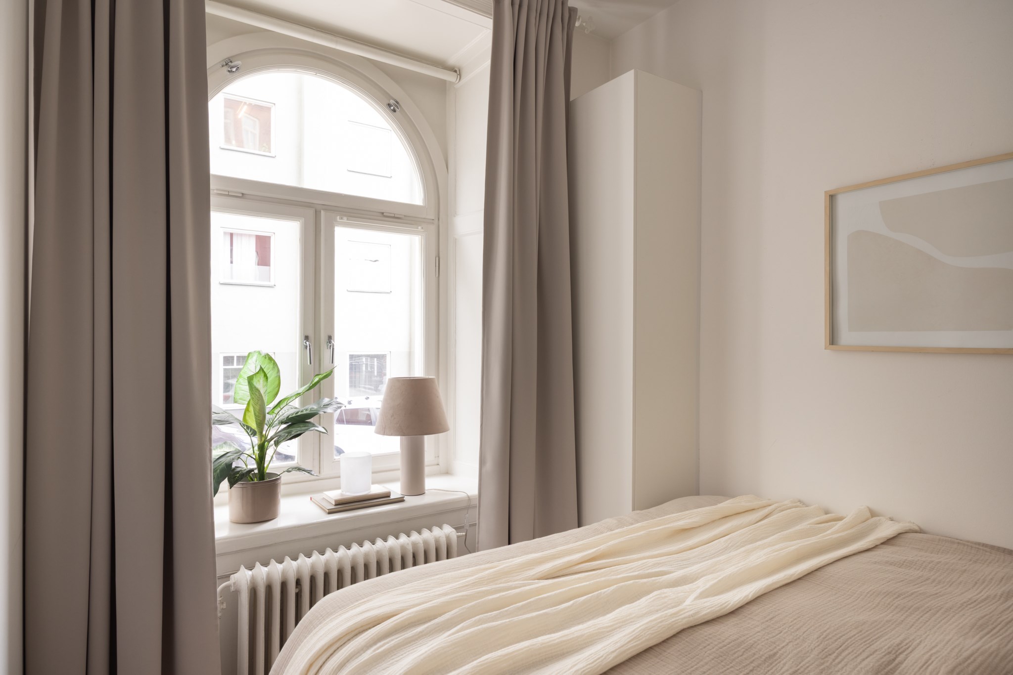 Rofyllt sovrum med ljusa väggar och fint ljusinsläpp från fönster med vacker utsikt över Barnhusviken. Här finns plats för säng, nattduksbord och mindre förvaring.
