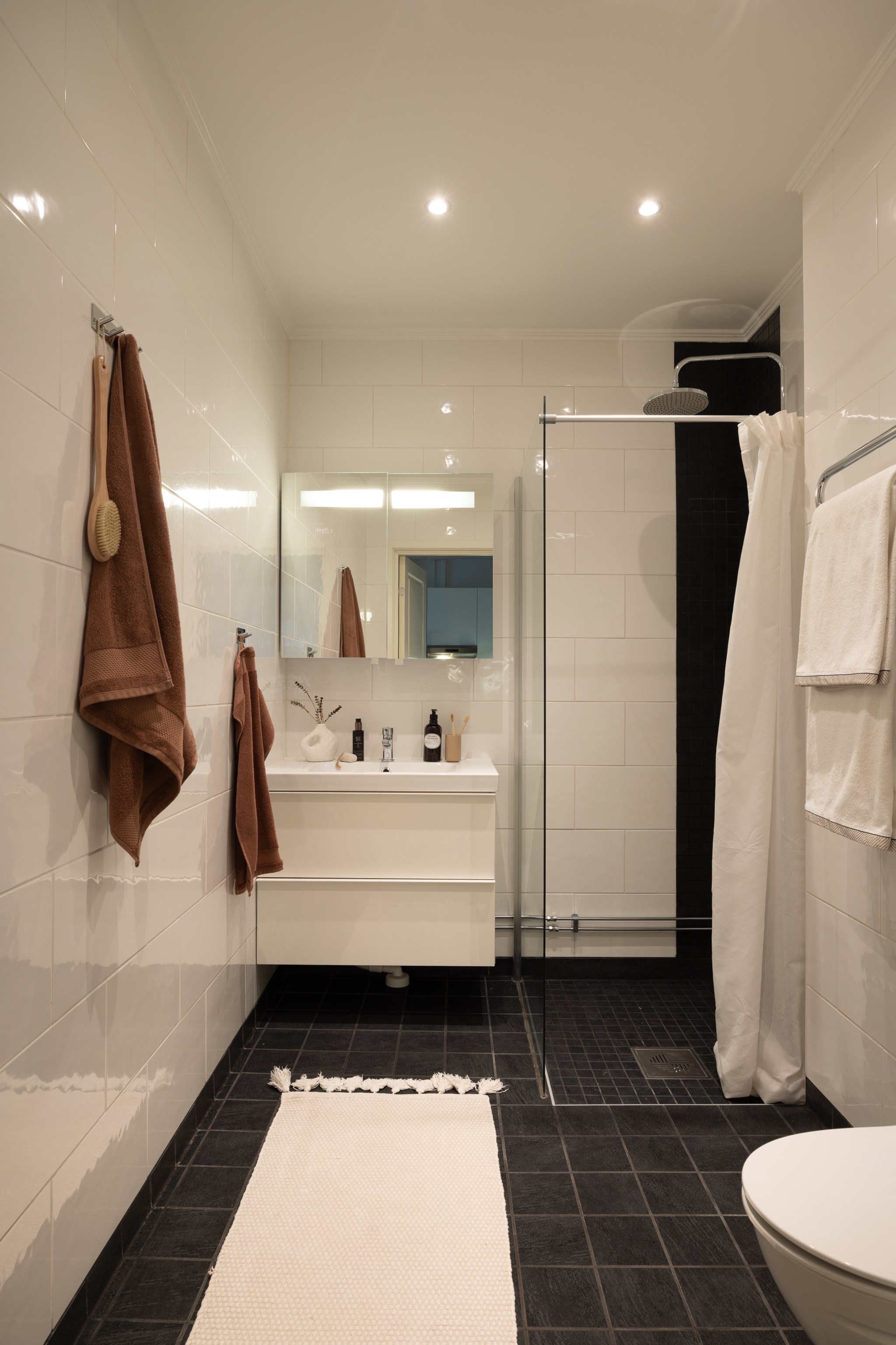 Rymligt och stilrent badrum med vitt kakel och mörkt golv som skapar en modern kontrast. Här finns en generös duschplats som bidrar till både komfort och bekvämlighet.