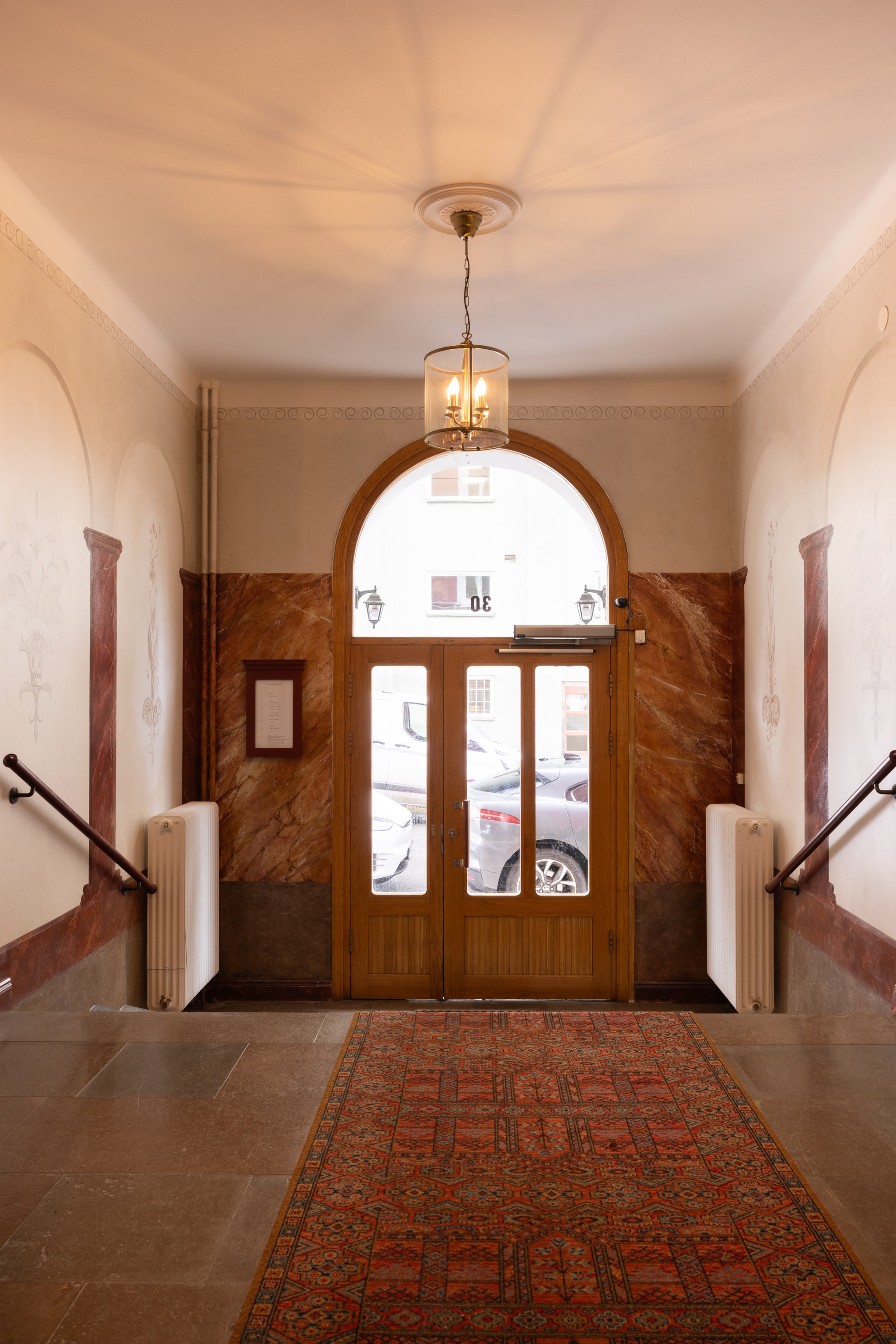 Välkomnande hall med två generösa garderober utrustade med stilrena skjutdörrar. Här erbjuds gott om plats för avhängning, skoförvaring och extra förvaring på ett både praktiskt och elegant sätt.