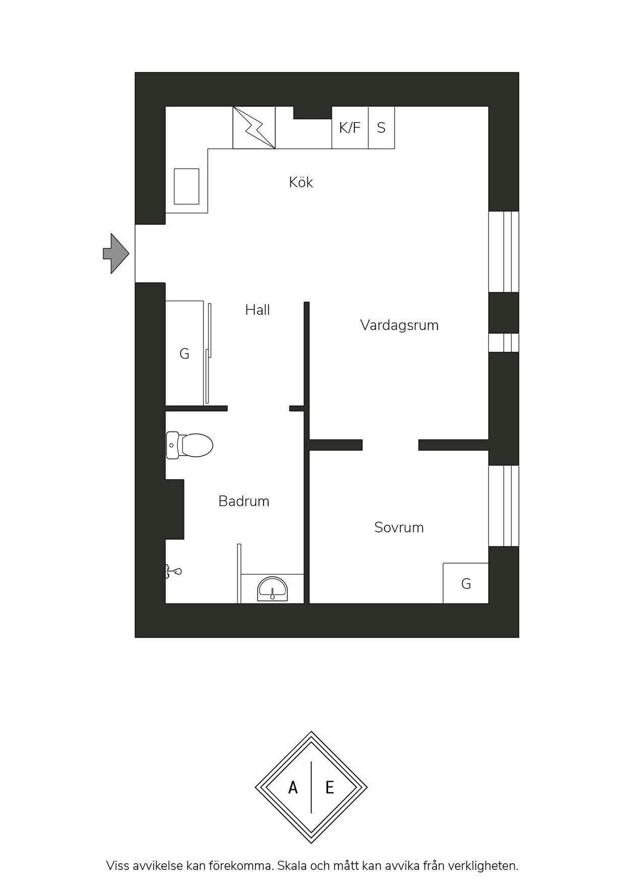 Köket är ljust och funktionellt med vita skåpsluckor, vitt kakel och en elegant bänkskiva i valnöt. Här finns allt du behöver för vardagens matlagning med full maskinell utrustning inklusive häll, fläkt, ugn, diskmaskin samt kyl och frys. Vardagsrummet är rymligt och ljust med vackert trägolv och stora fönster som släpper in generöst ljus. Här finns gott om plats för både soffgrupp, soffbord och matbord, vilket gör rummet till hemmets naturliga samlingspunkt. Sovrummet är rofyllt och ljust, med plats för säng och förvaring, och badrummet är smakfullt inrett med vitt kakel, mörkt golv och en generös duschplats.