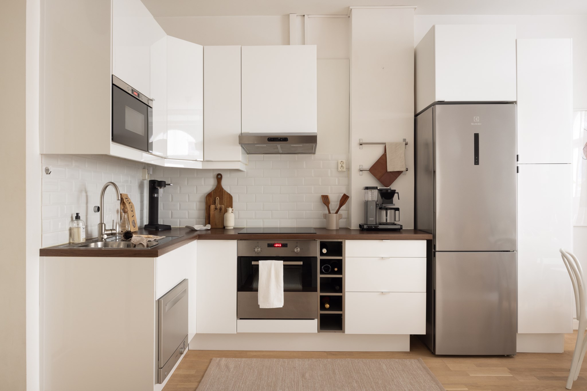 Ljust kök med vitt kakel ovanför den stilfulla bänkskivan i valnöt. Förvaring bakom vita skåpsluckor. Här finns häll, fläkt, ugn, diskmaskin, kyl och frys.