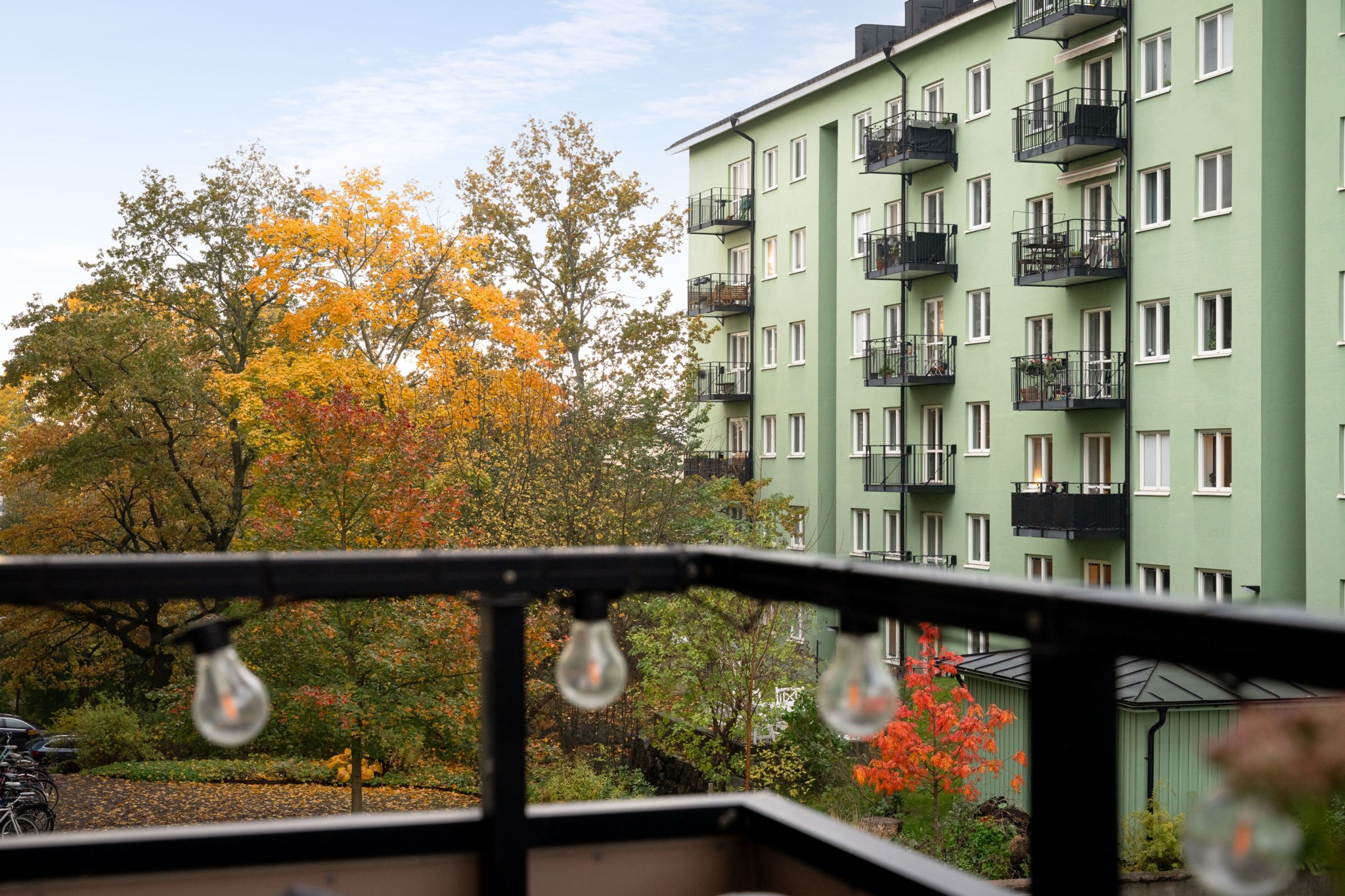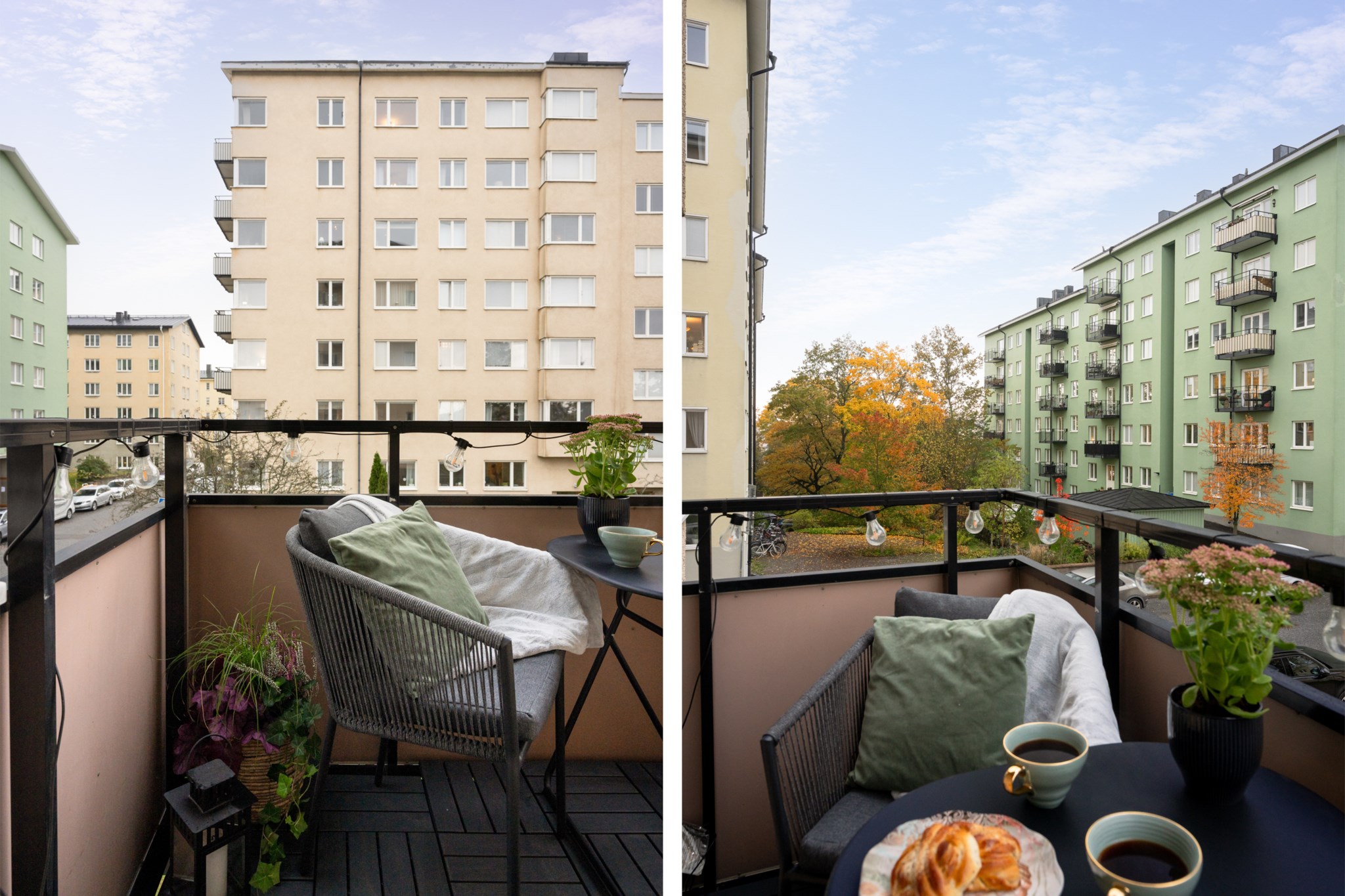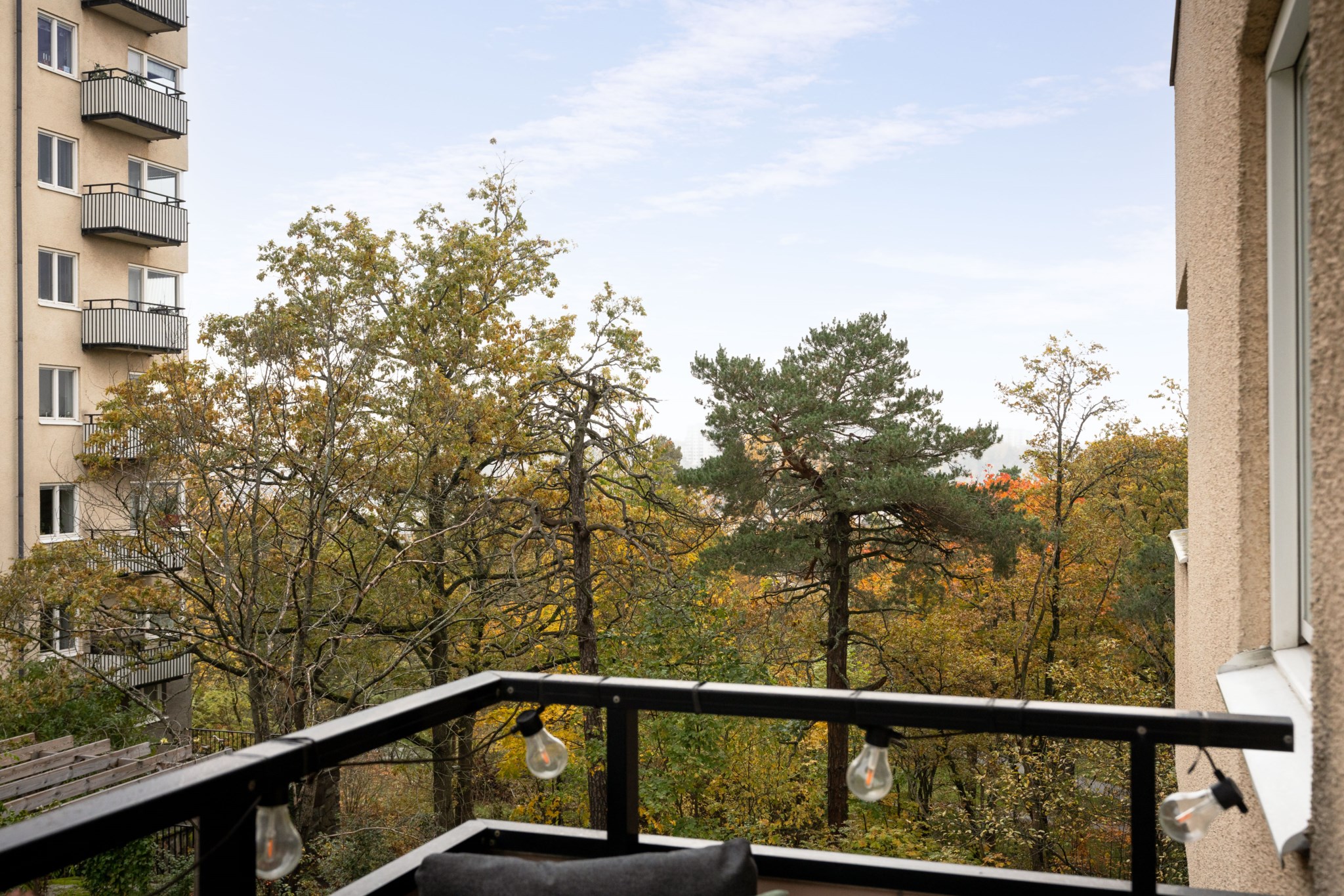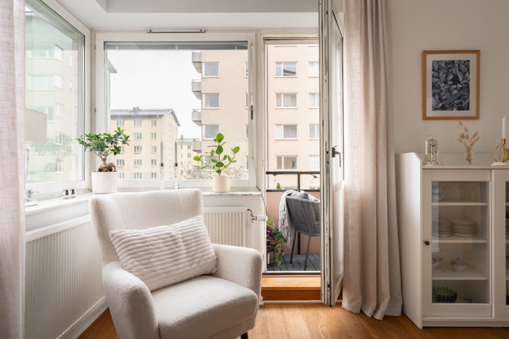 Till bostaden hör en trevlig balkong med plats för balkongmöbler. Härifrån har man utsikt mot den lugna innergården med goda möjligheter att skapa en trivsam utomhusmiljö. Utsikt mot den lugna innergården med natur och havsglimt.