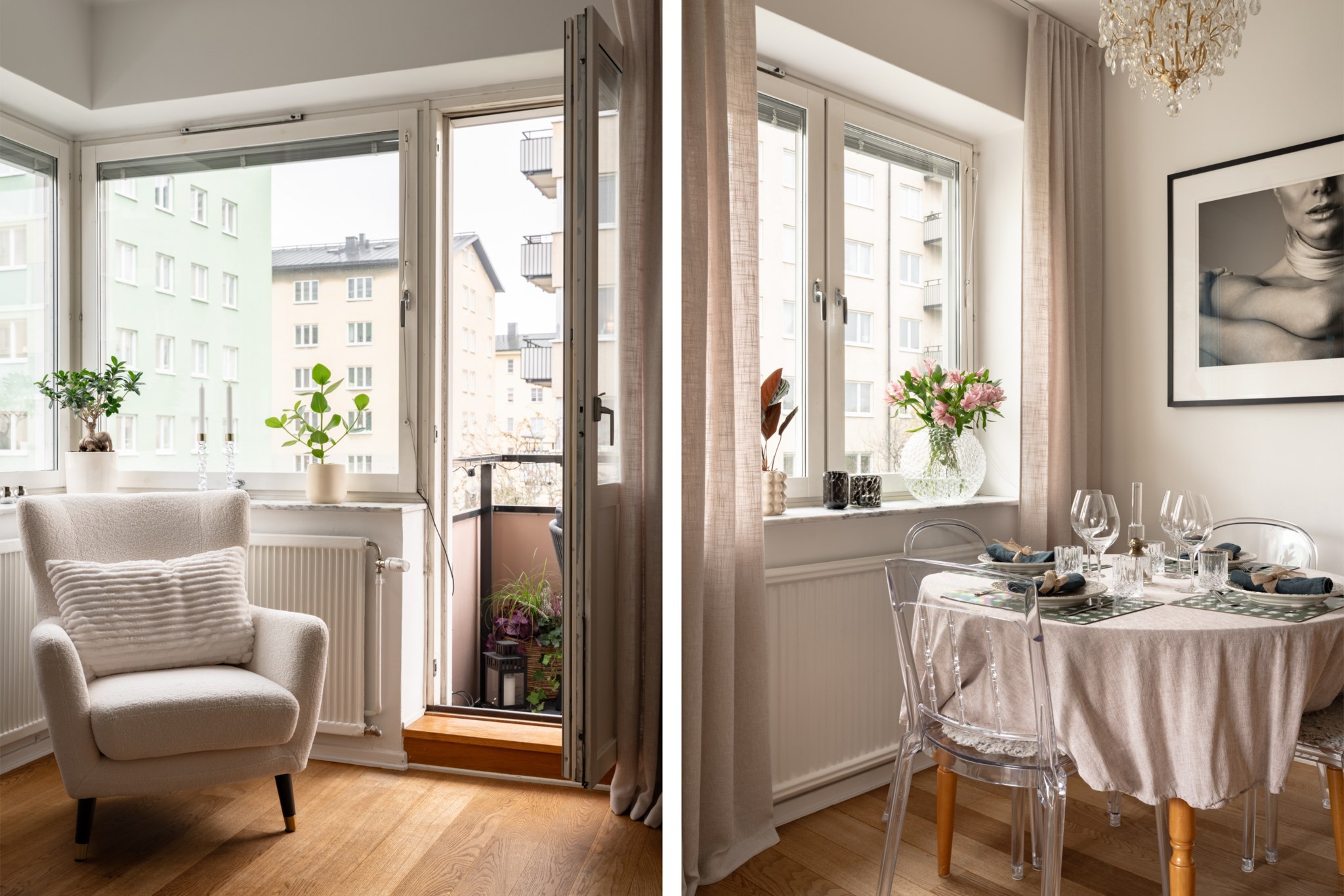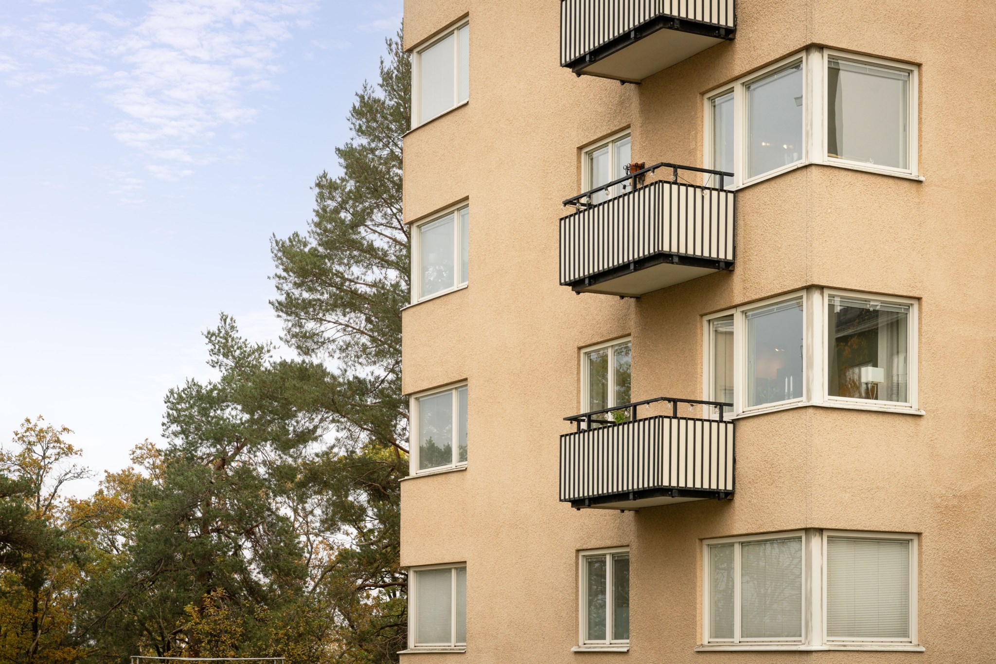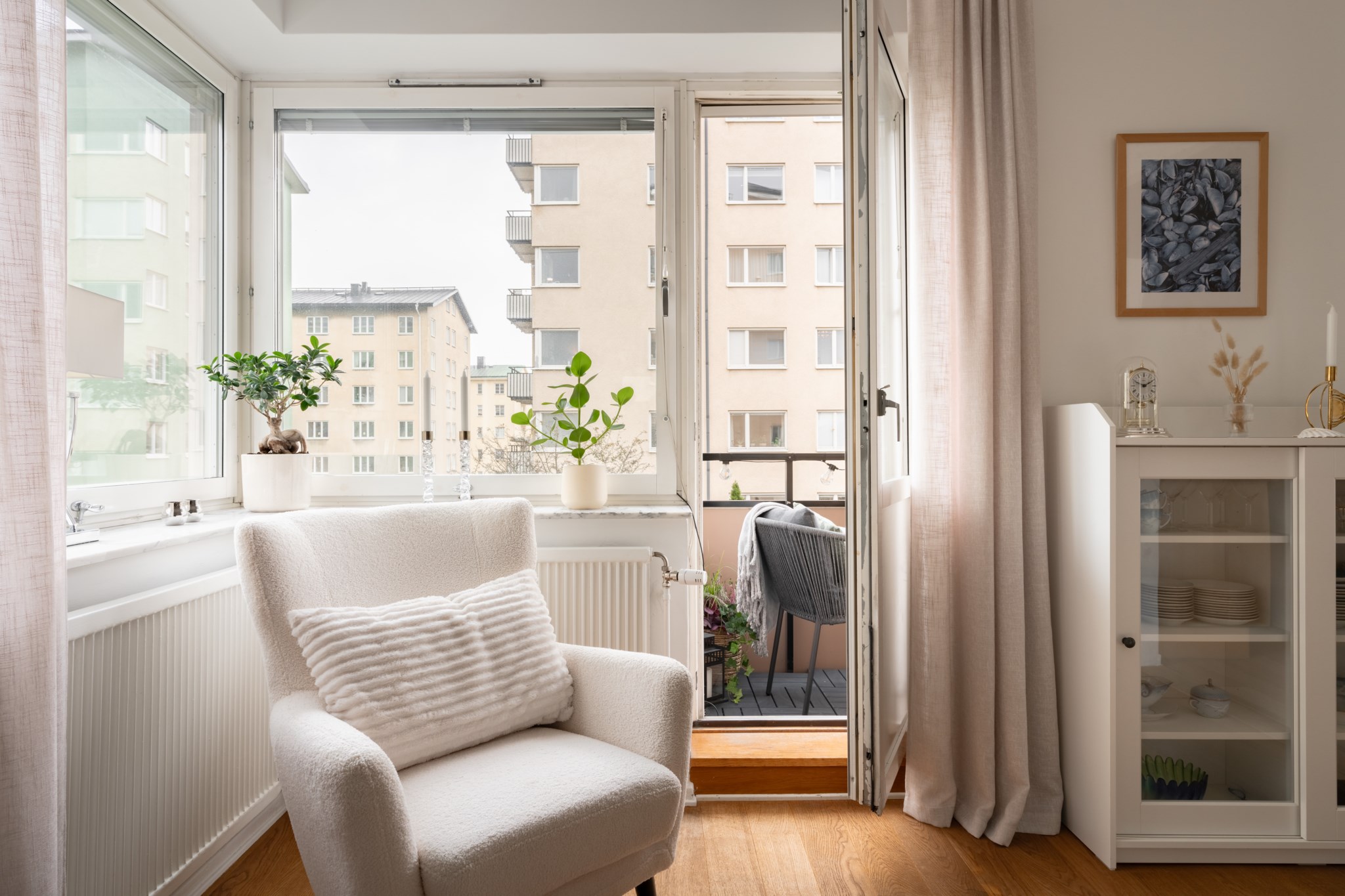 Till bostaden hör en trevlig balkong med plats för balkongmöbler. Härifrån har man utsikt mot den lugna innergården med goda möjligheter att skapa en trivsam utomhusmiljö. Utsikt mot den lugna innergården med natur och havsglimt.