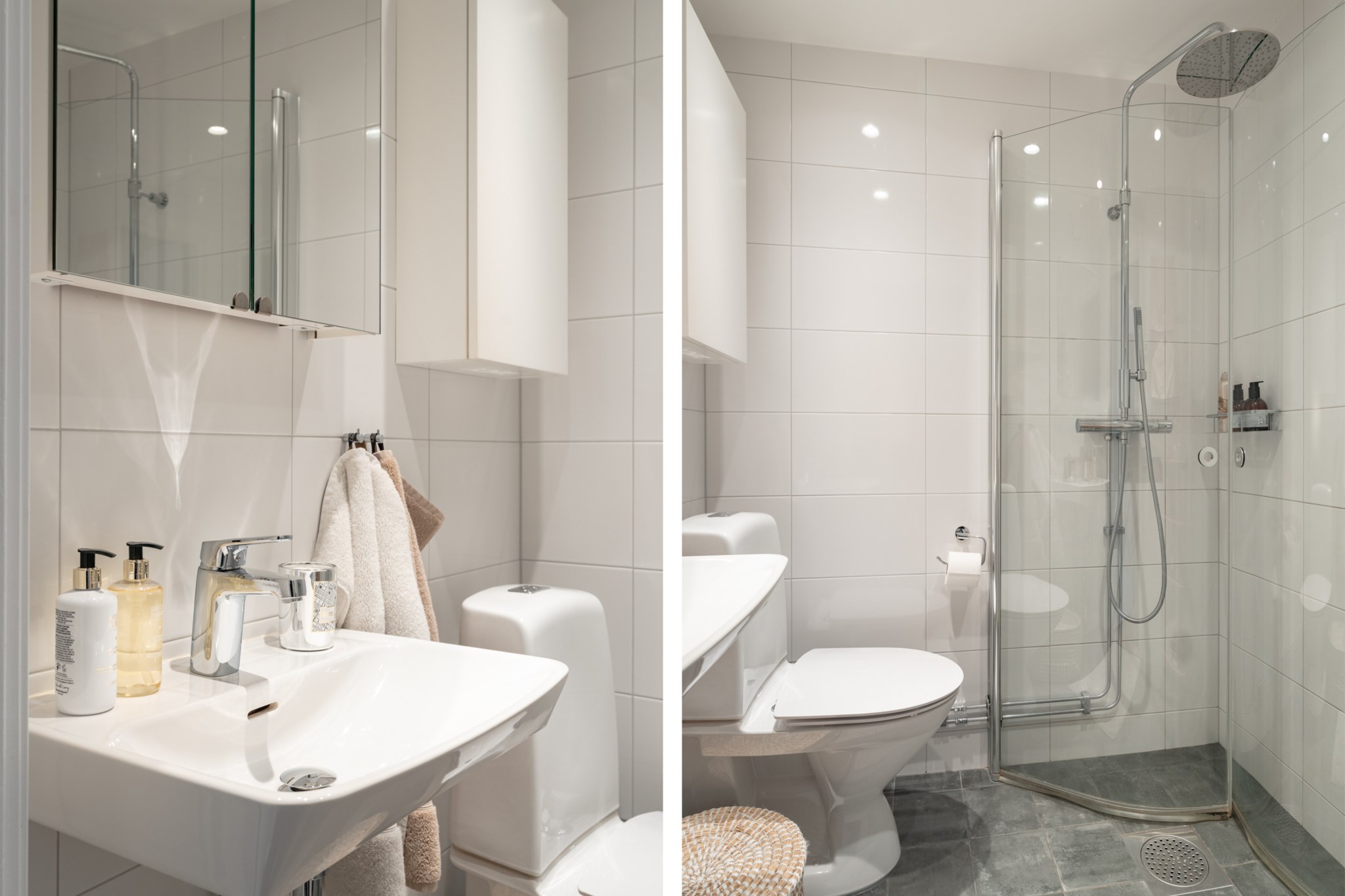 Fräscht badrum med ljust kakel och grått klinkergolv med golvvärme. Badrummet är inrett med WC, handfat, spegel, badrumsskåp, handdukstork samt en lyxig takdusch med infällbara duschväggar i klarglas.