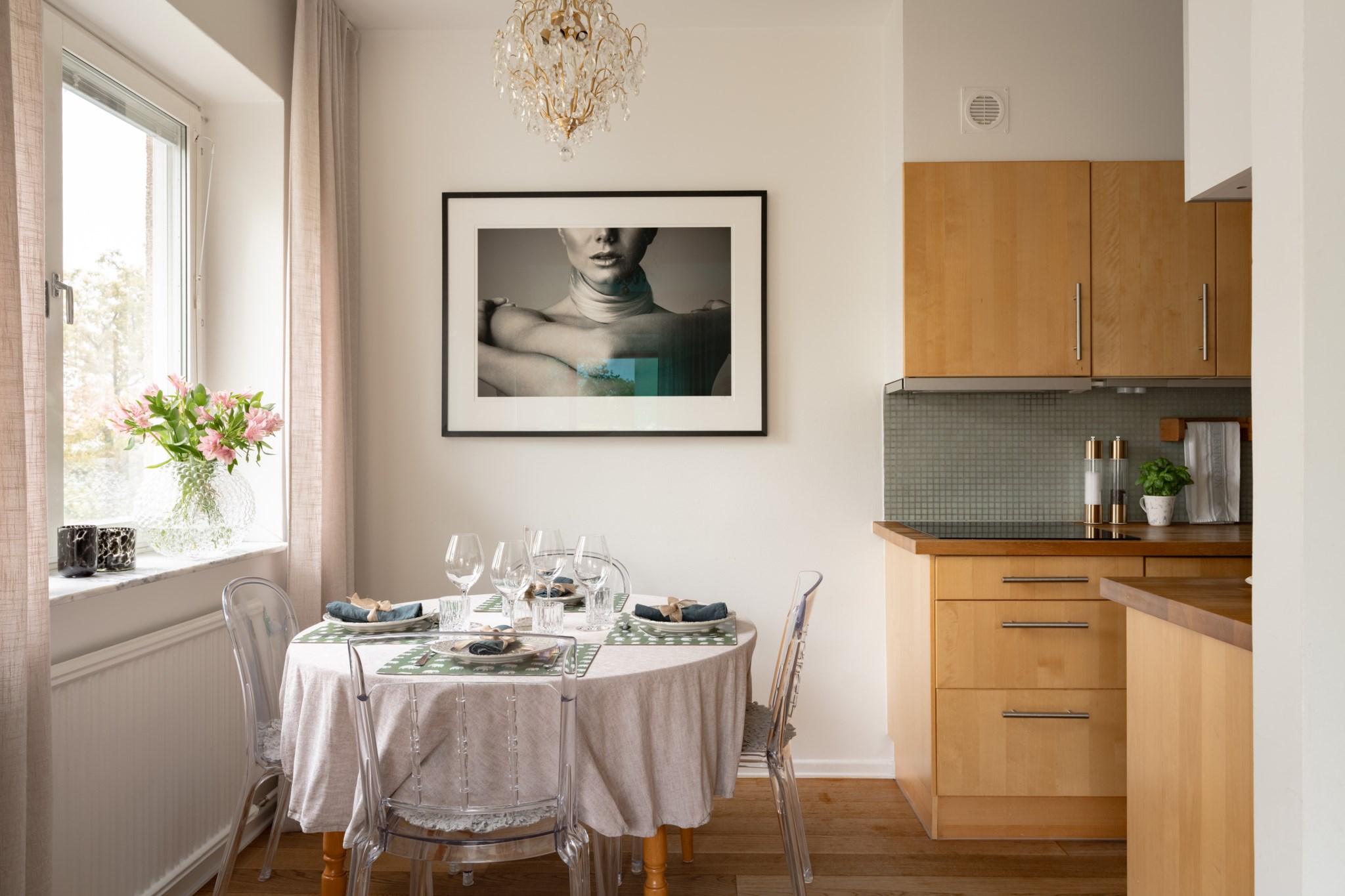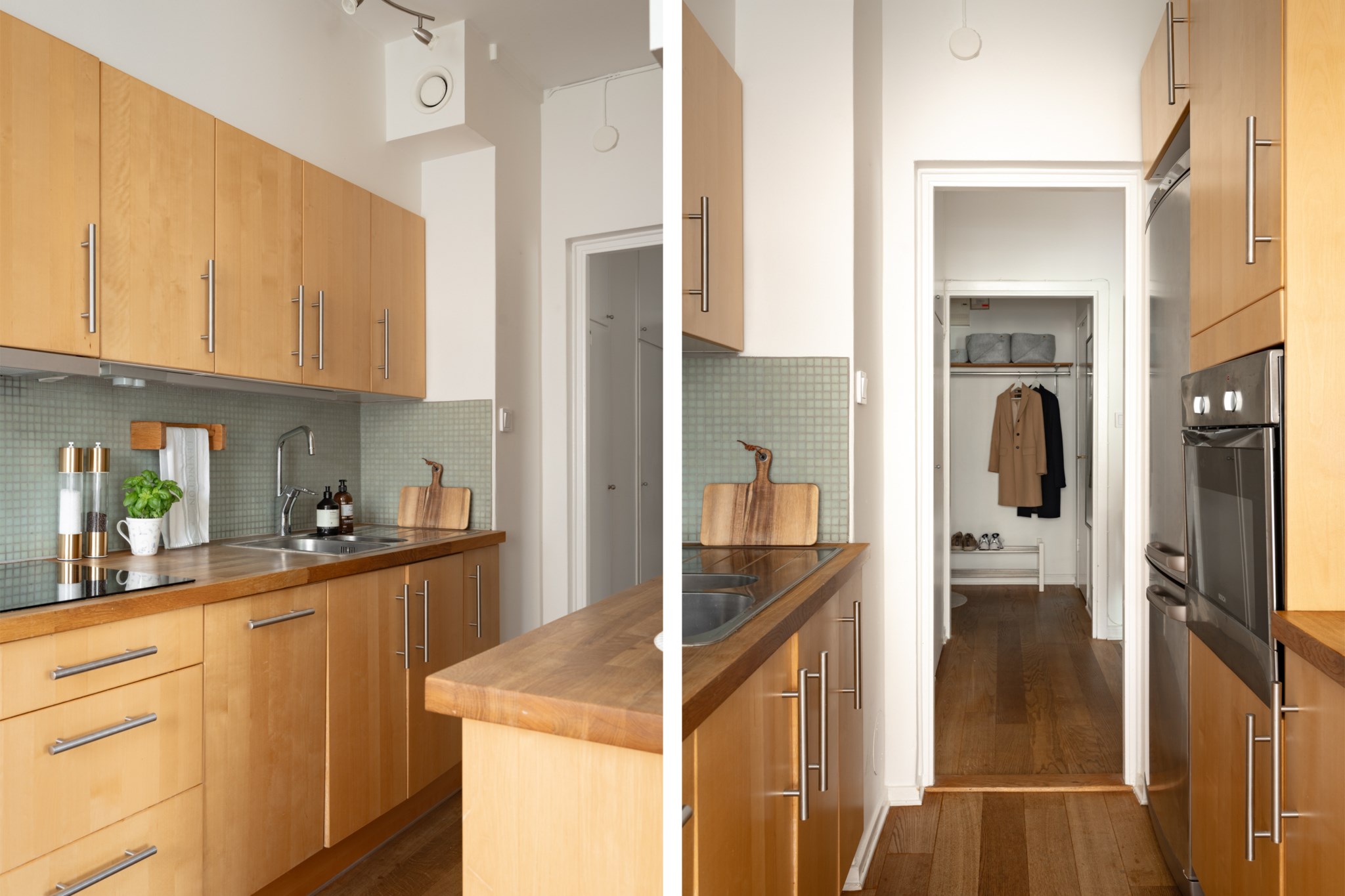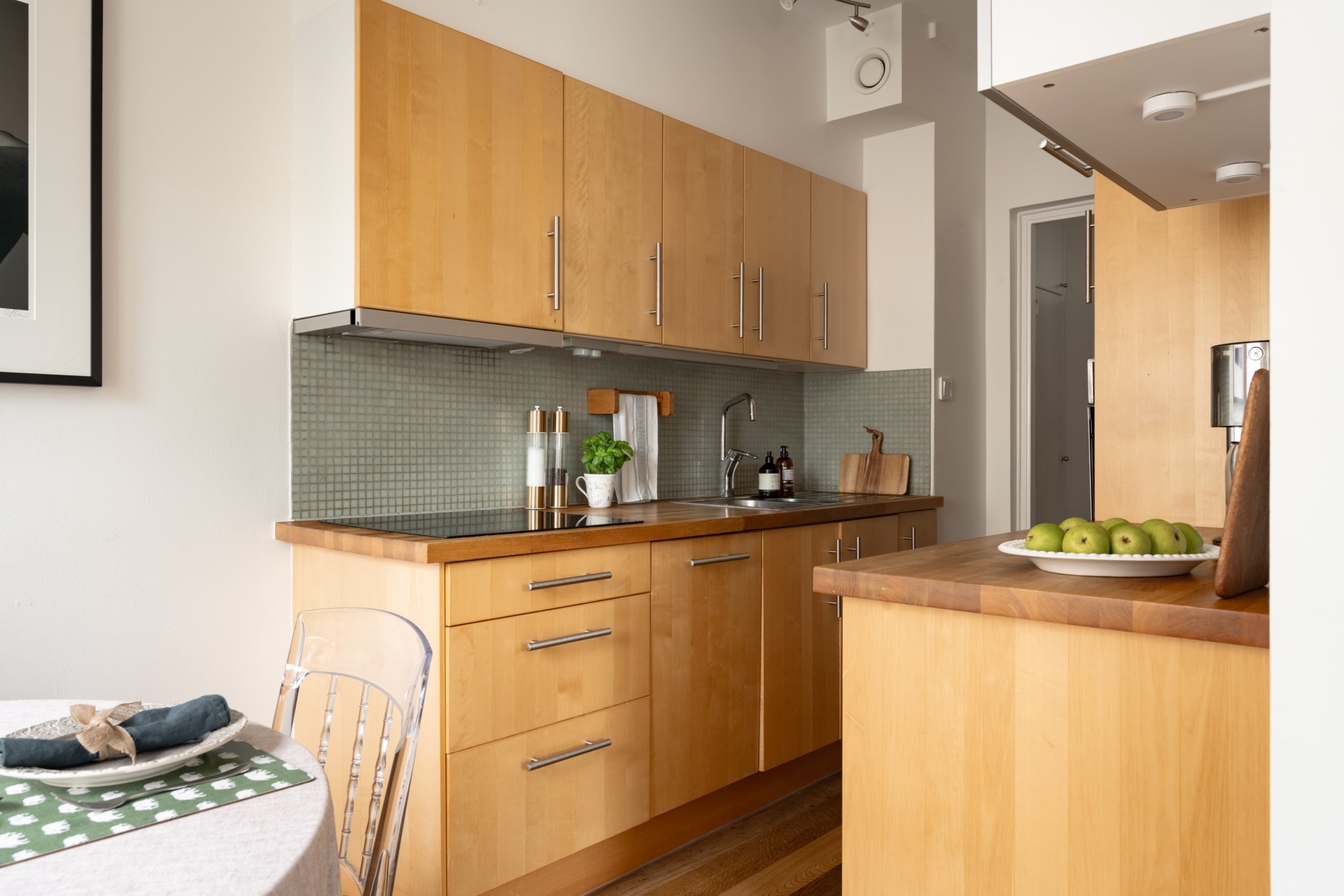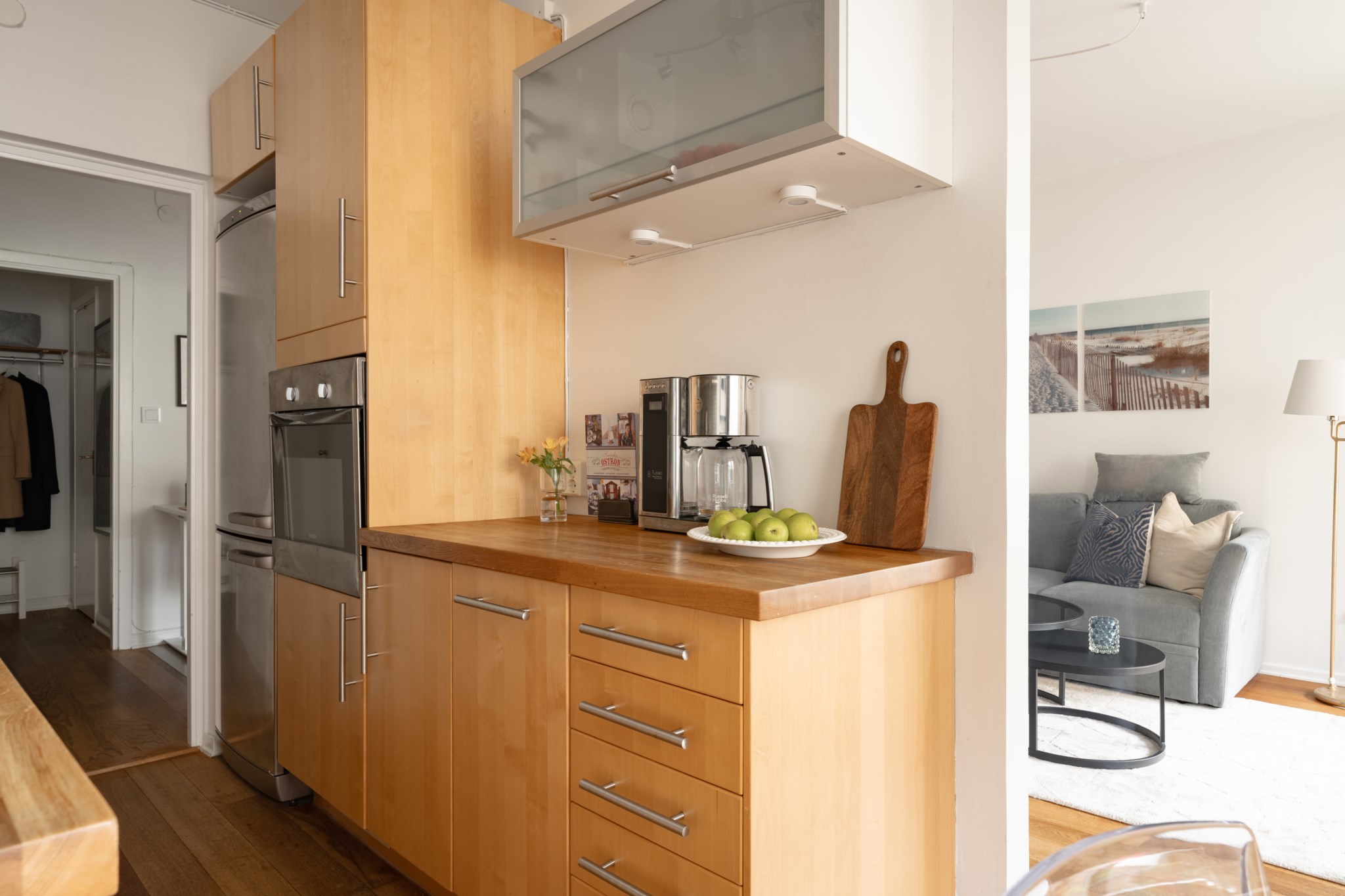 Välutrustat kök med köksluckor och bänkskiva i trä samt kaklad väggpanel. Matplatsen är placerad intill ett stort fönsterparti som släpper in rikligt med ljus samtidigt som den öppna planlösningen mot vardagsrummet skapar en social och trivsam helhet. Köket är utrustat med kyl/frys, spishäll, fläkt, ugn och diskmaskin. Ljusmålade ytskikt och mörkt golv.