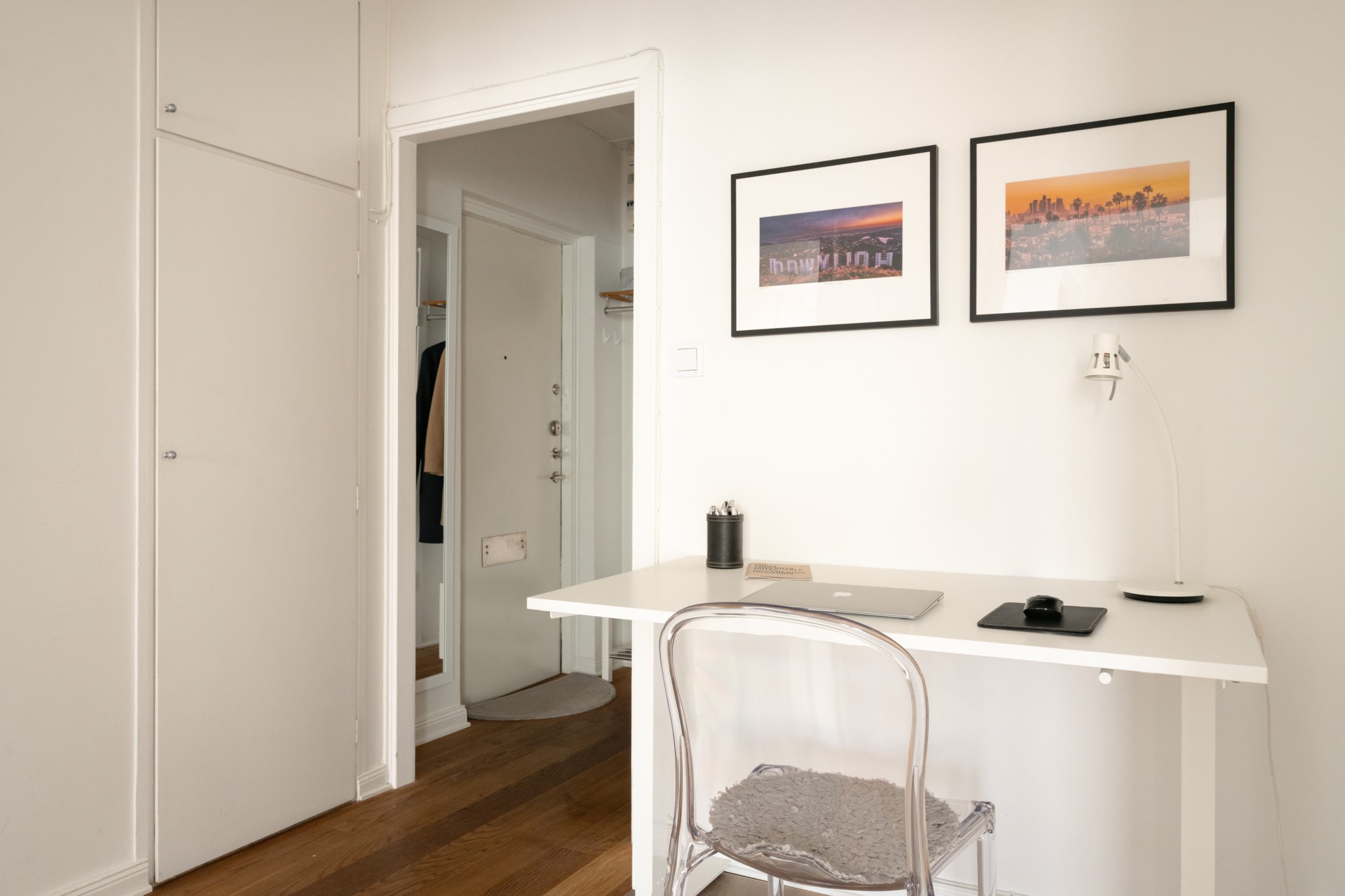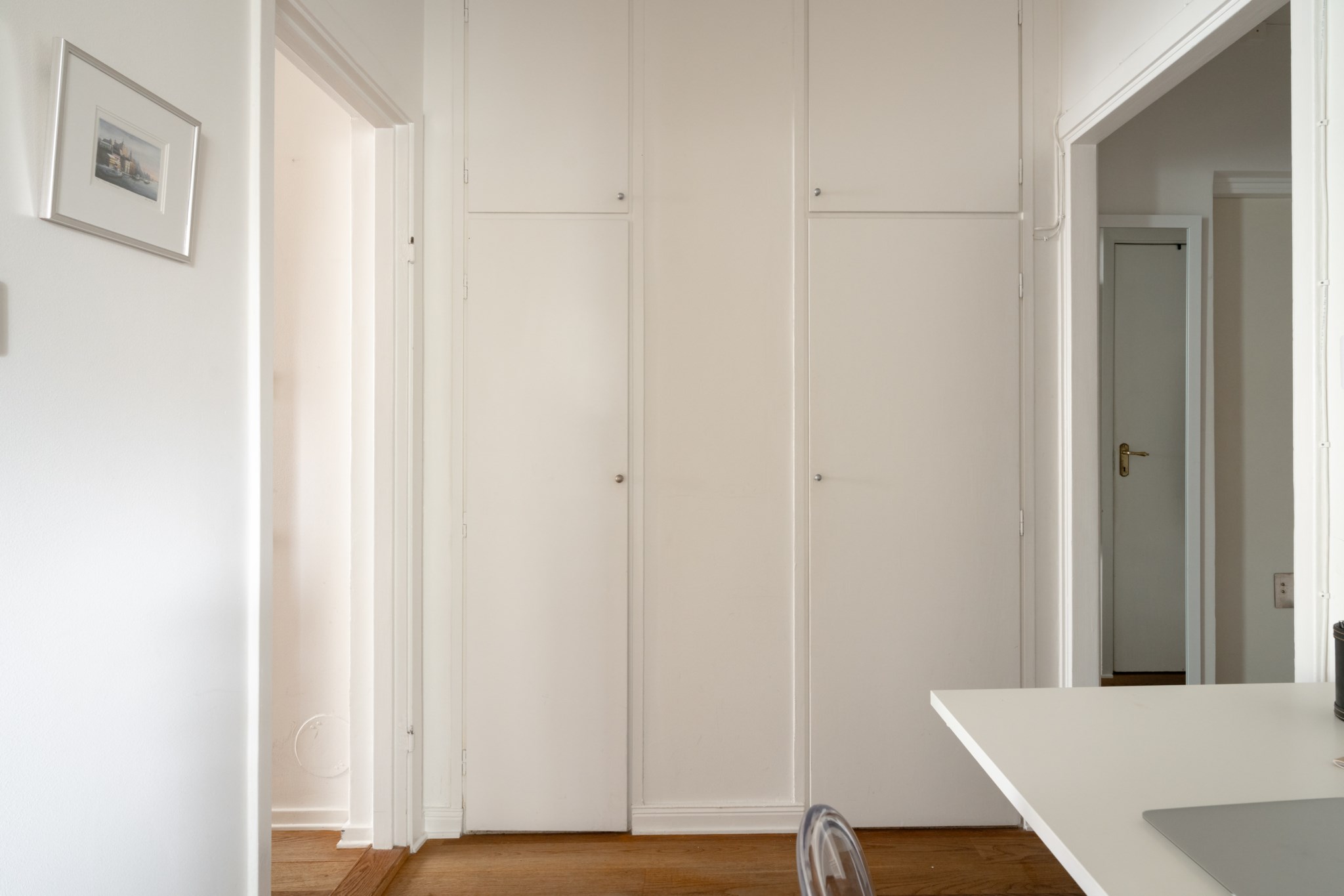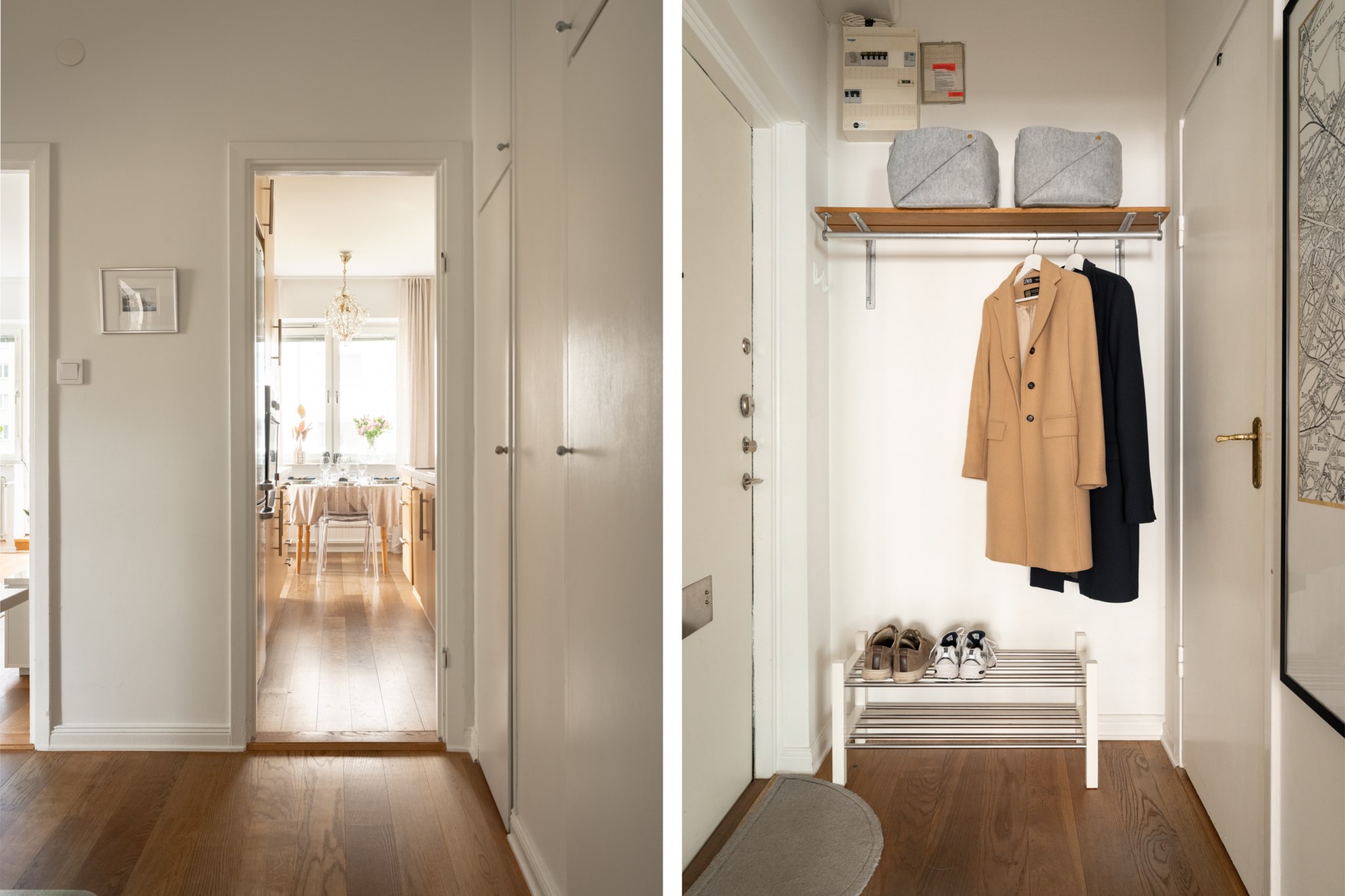 Välkomnande hall med ljusmålade ytskikt och mörkt golv som skapar en fin kontrast. Direkt innanför ytterdörren finns plats för hatthylla och skoställ för enkel avhängning av ytterkläder och skor. Förvaringen är god med flera inbyggda garderober försedda med praktiska överskåp.