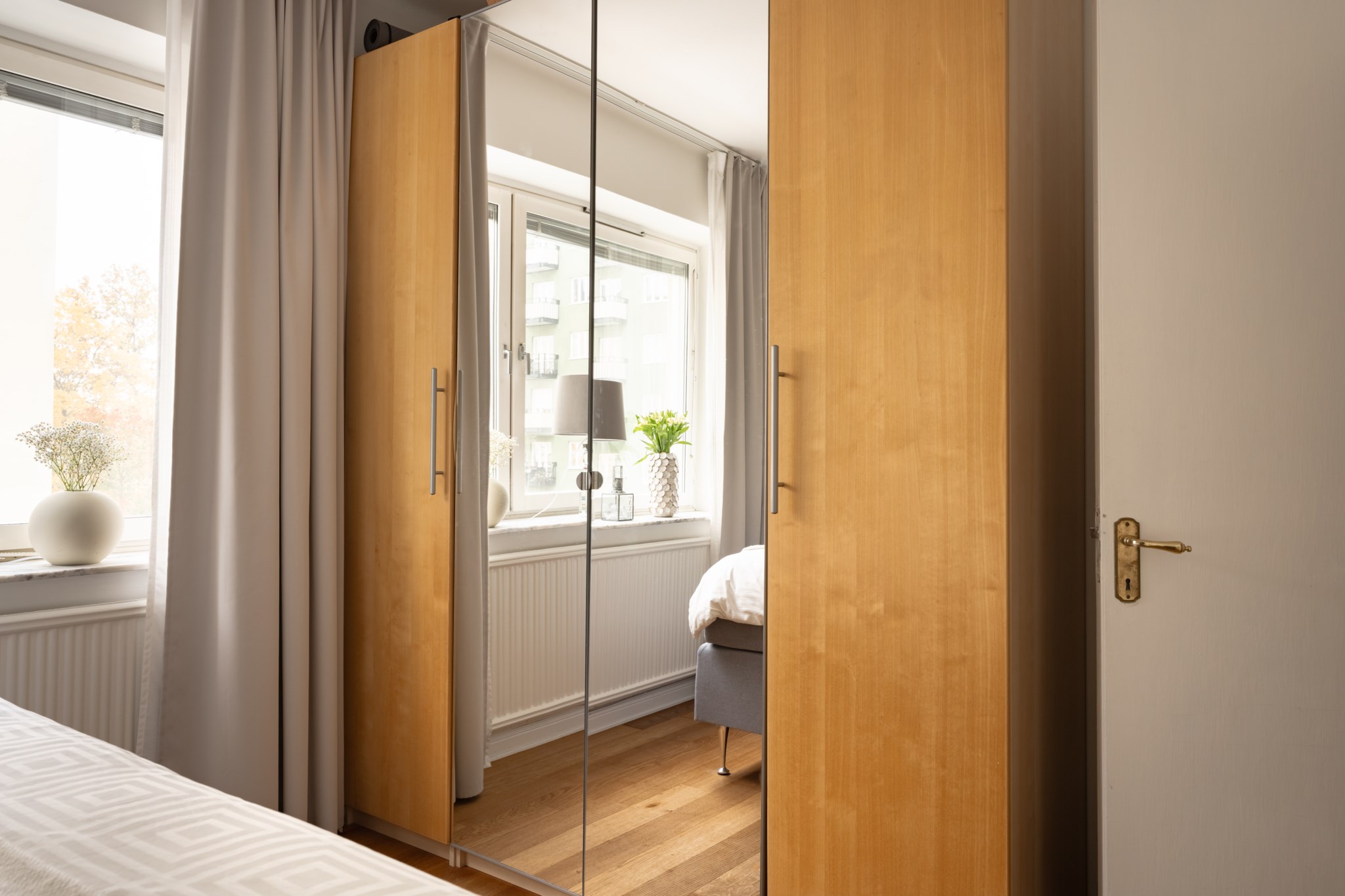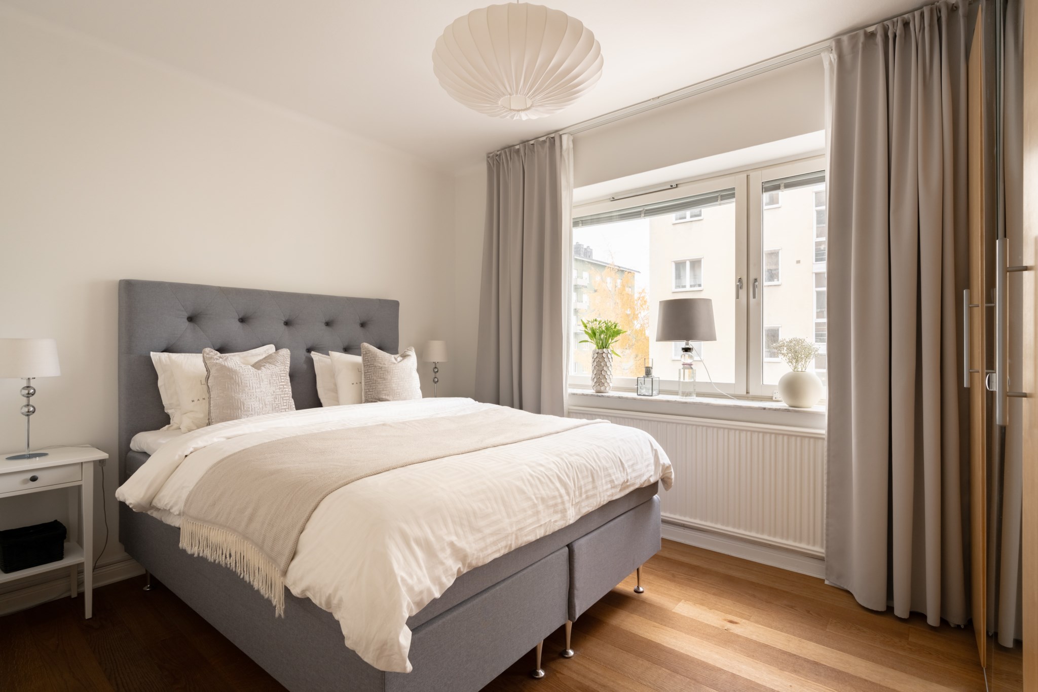 Rogivande sovrum med plats för dubbelsäng och tillhörande sängbord. Det stora fönsterpartiet ger ett fint ljusinsläpp och goda förvaringsmöjligheter erbjuds i rummets garderob. Ljusmålade ytskikt och mörkt golv.