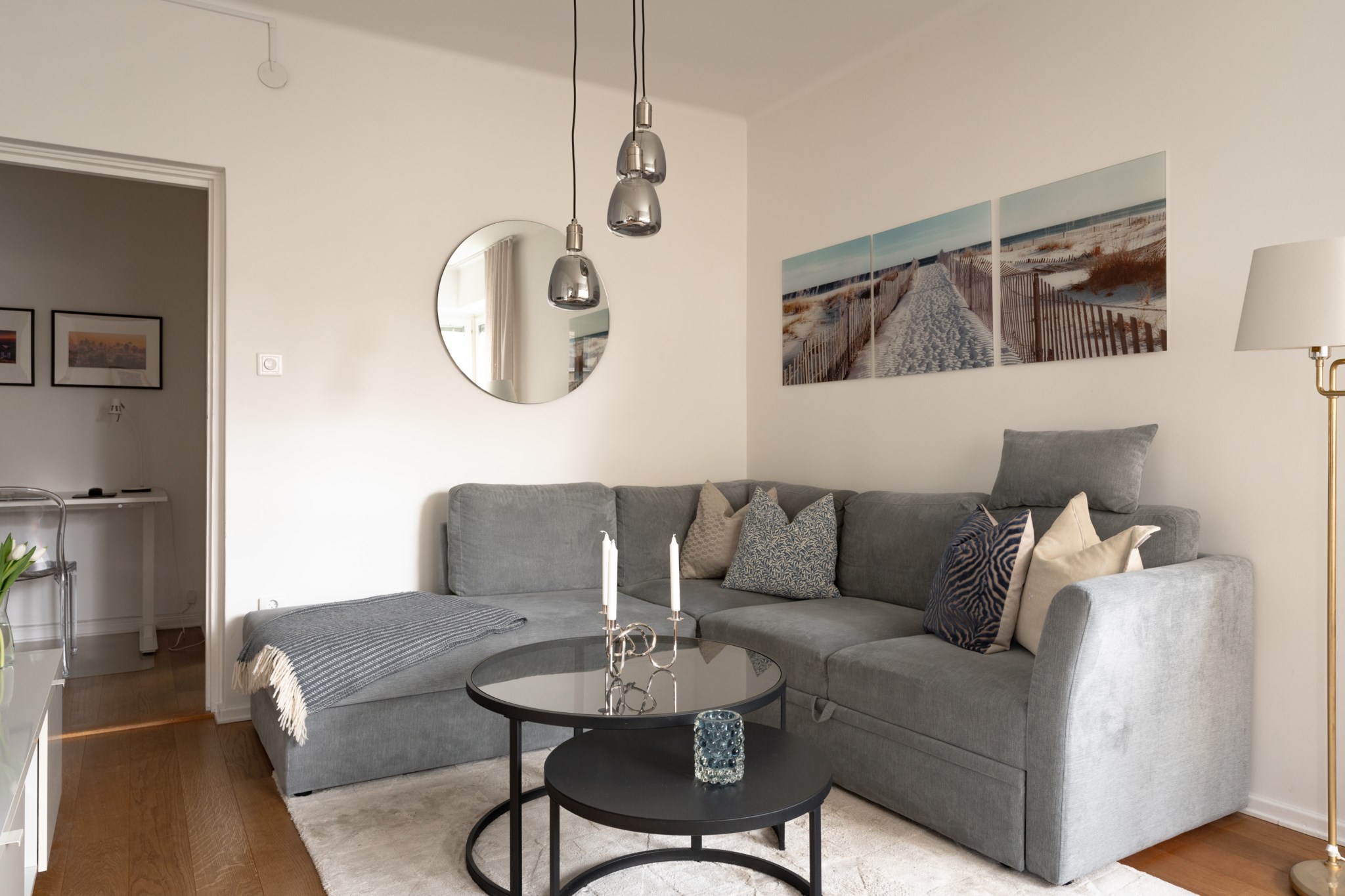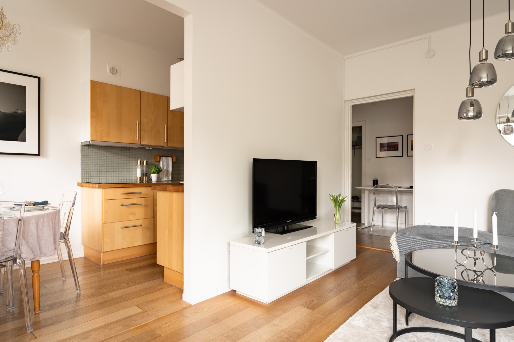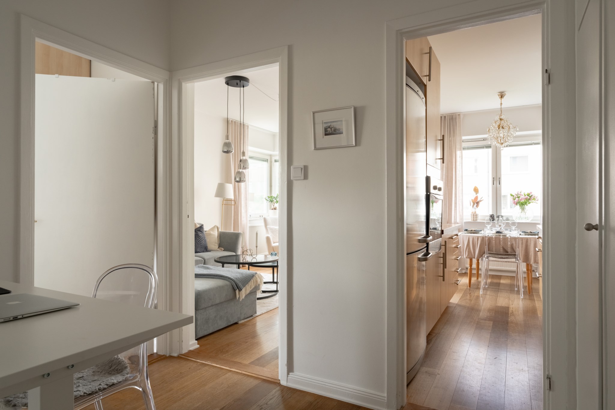 Bostaden är genomgående i bra skick med ljusa väggar och vackra golv vilket ger ett ljust och fräscht intryck. Ett rymligt separat sovrum med plats för stor dubbelsäng. Perfekt inre hall som idag disponeras som hemmakontor. Trevligt helkaklat badrum. Bra förvaring och trevliga öppna ytor.