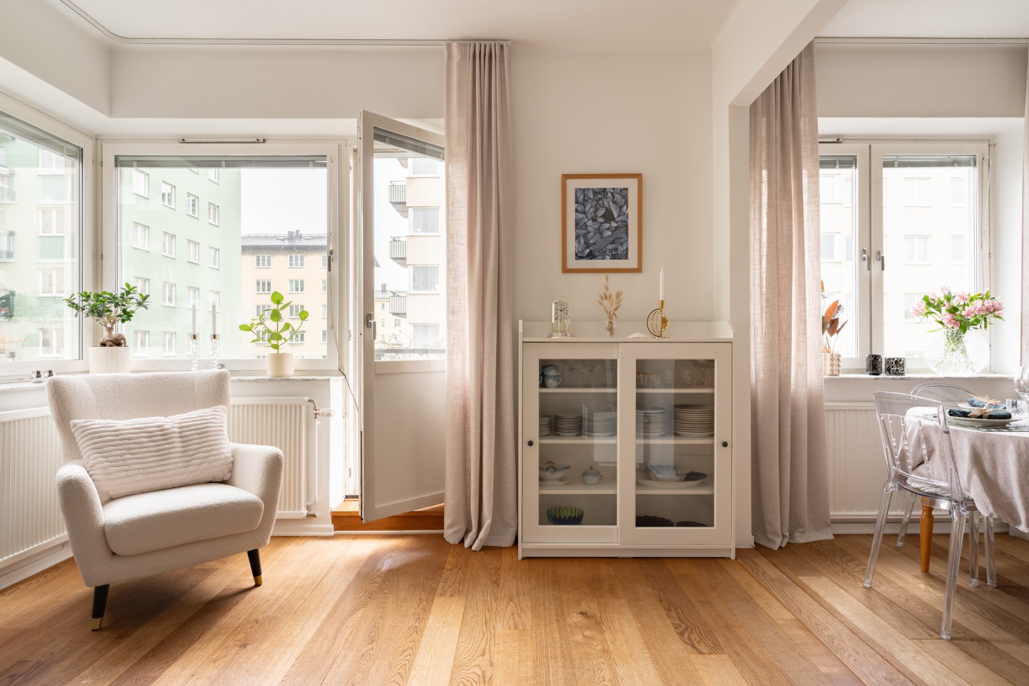Trivsamt vardagsrum med fina fönsterpartier i kombination med balkongdörrar som ger ett generöst och naturligt ljusinsläpp. Rummet erbjuder gott om plats för soffa och annan inredning efter behov och smak. Ljusmålade ytskikt och mörkt golv.