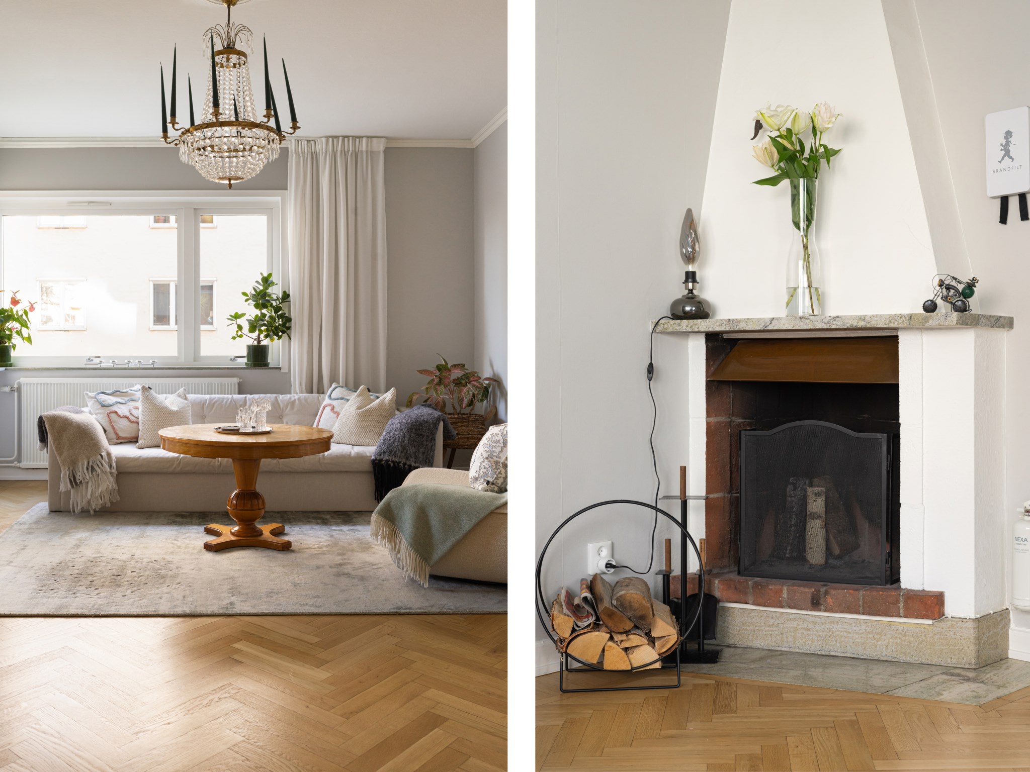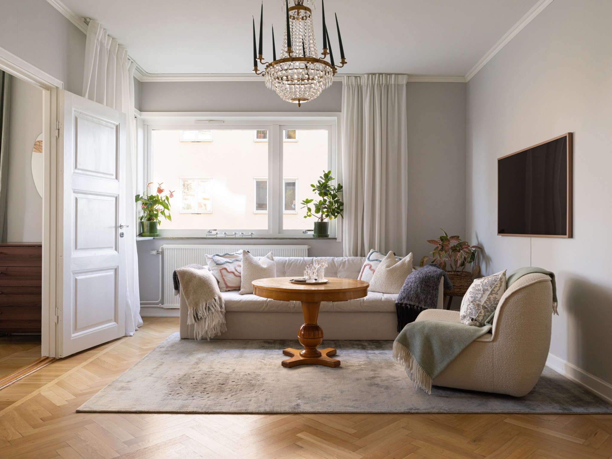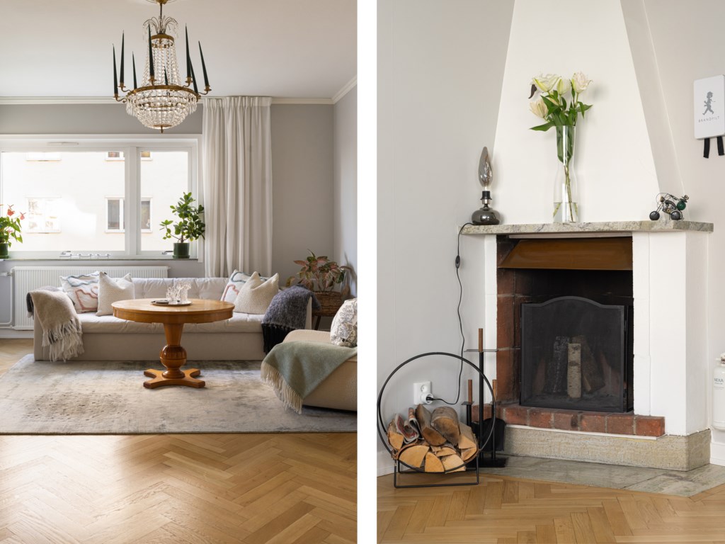 Trivsamt vardagsrum med ljusmålade ytskikt och vackert golv belagt med fiskbensparkett. Här finns gott om plats för både soffgrupp och andra personliga möbler och inredningsdetaljer. Det stora fönstret släpper in ett fint naturligt ljus som skapar ett inbjudande sällskapsrum.