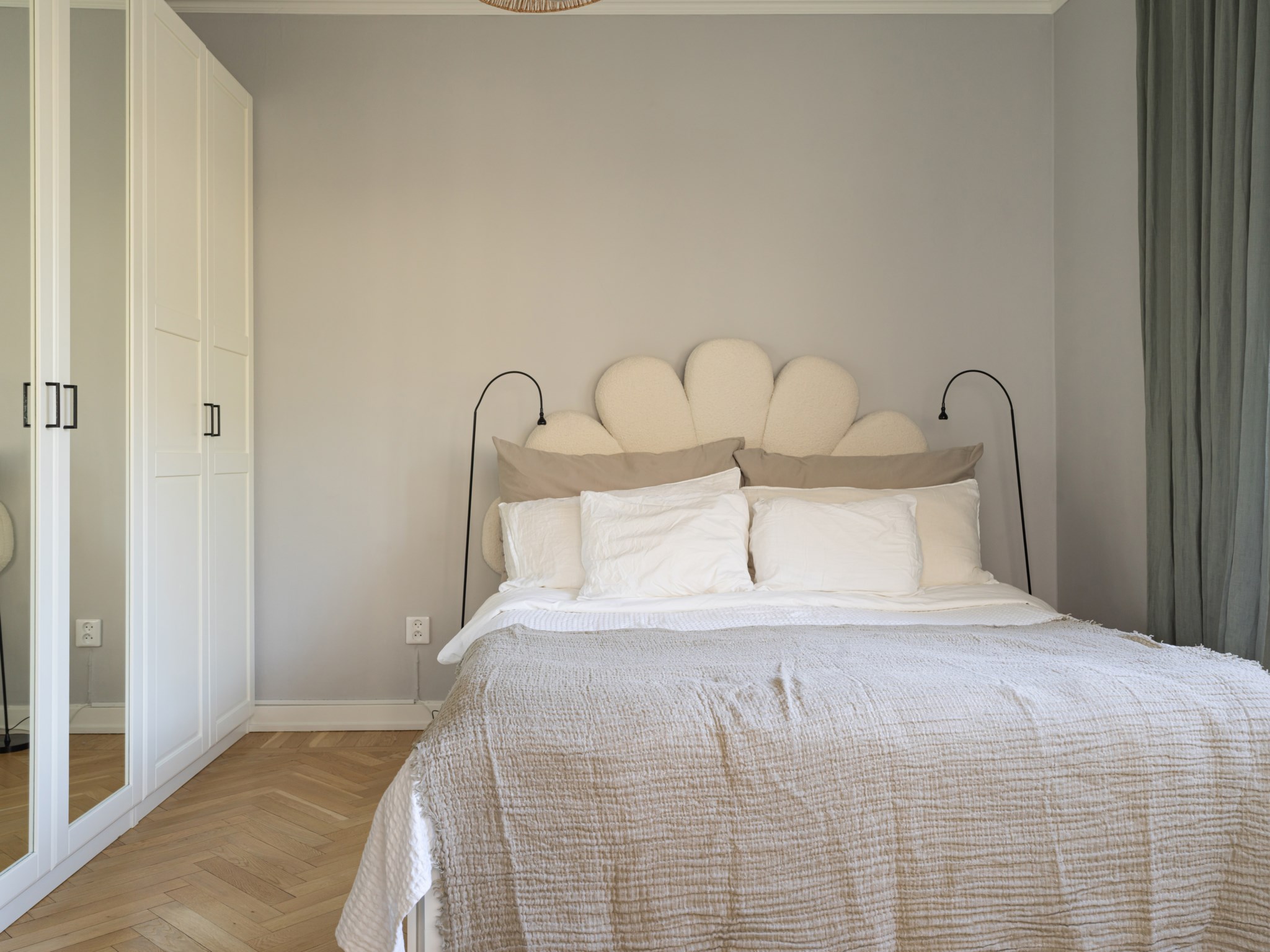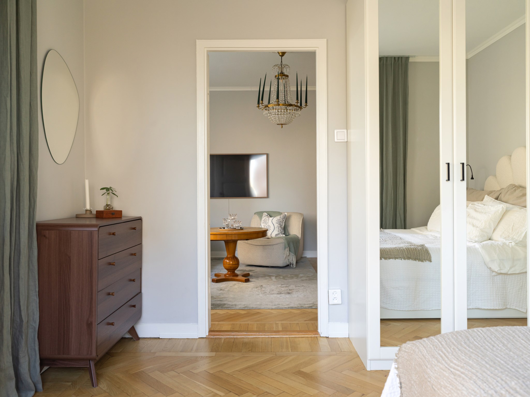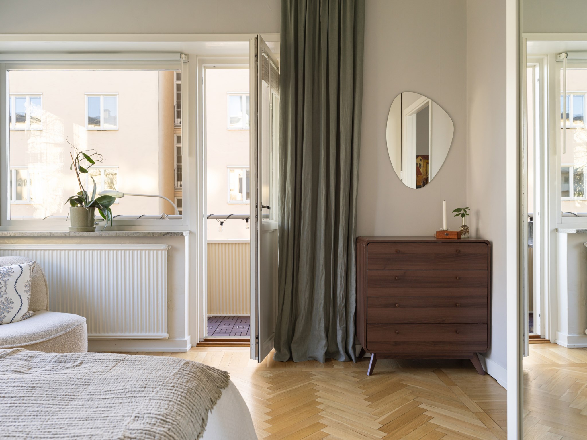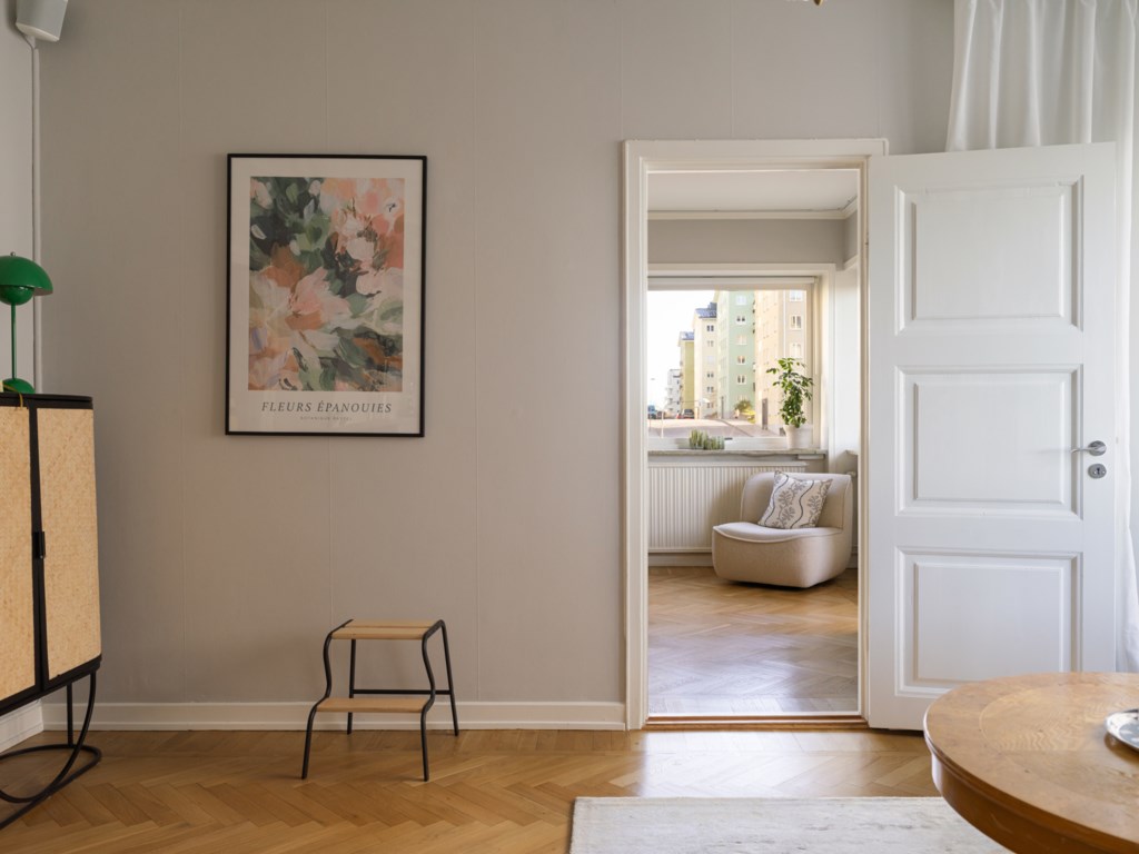 Rogivande sovrum med två stora fönsterpartier i vinkel som ger ett fantastiskt ljusinsläpp och en luftig känsla. Från rummet nås även bostadens trevliga balkong via en balkongöppning vilket binder samman ute och inne under de varmare månaderna. Här finns plats för dubbelsäng med tillhörande sängbord och förvaringen är väl tillgodosedd med garderober varav två är försedda med eleganta spegeldörrar. Ytskikten är målade i en ljus kulör och golvet belagt med vacker fiskbensparkett.