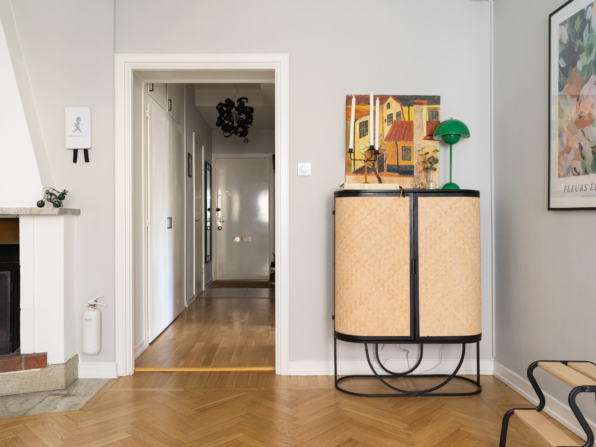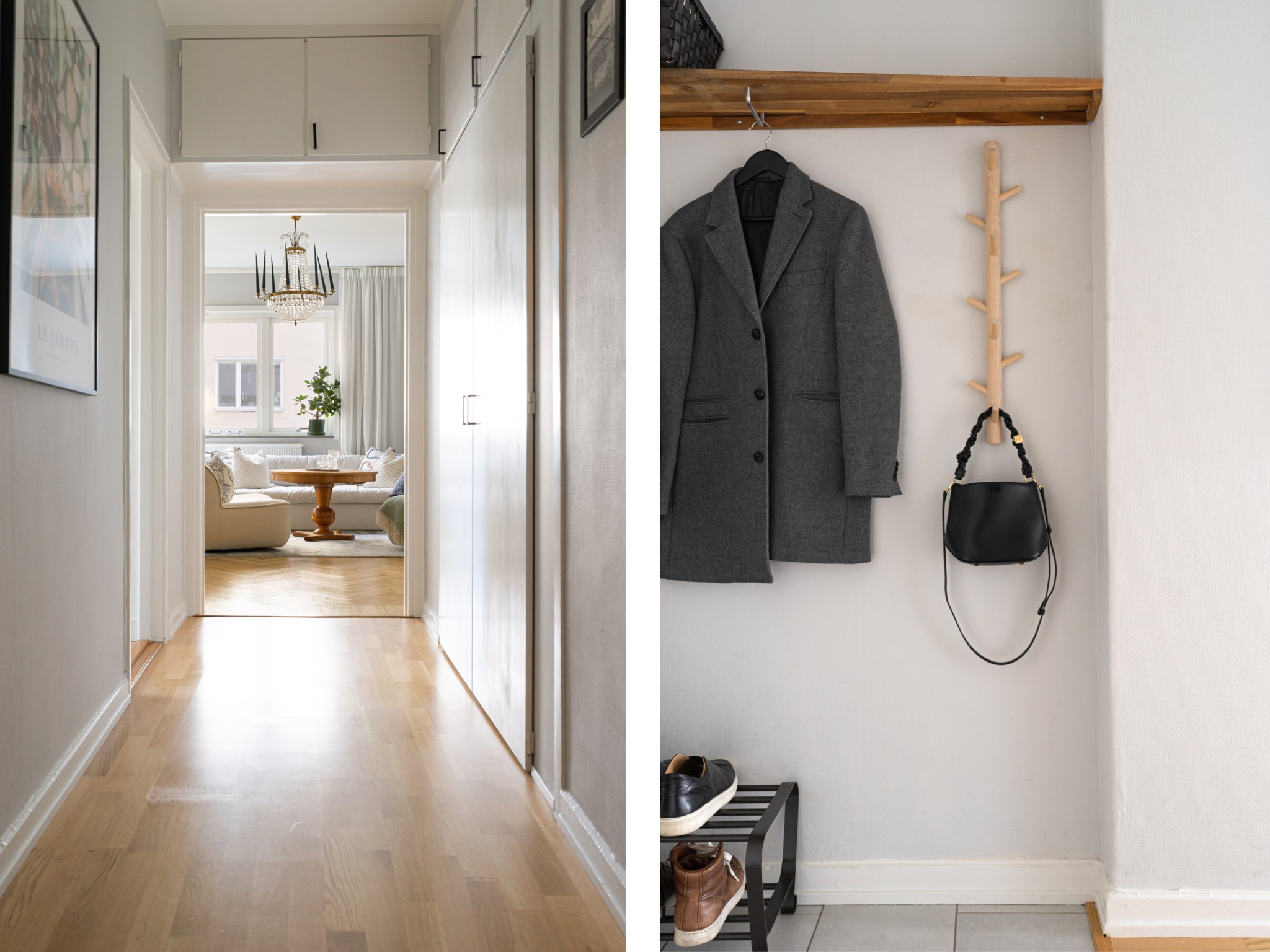 Välkomnande hall med ljusmålade ytskikt och grått klinkergolv som elegant övergår i ljust parkettgolv längre in i bostaden. Här finns praktisk plats för avhängning av ytterkläder direkt intill ytterdörren samt mycket goda förvaringsmöjligheter i flertalet överskåp.