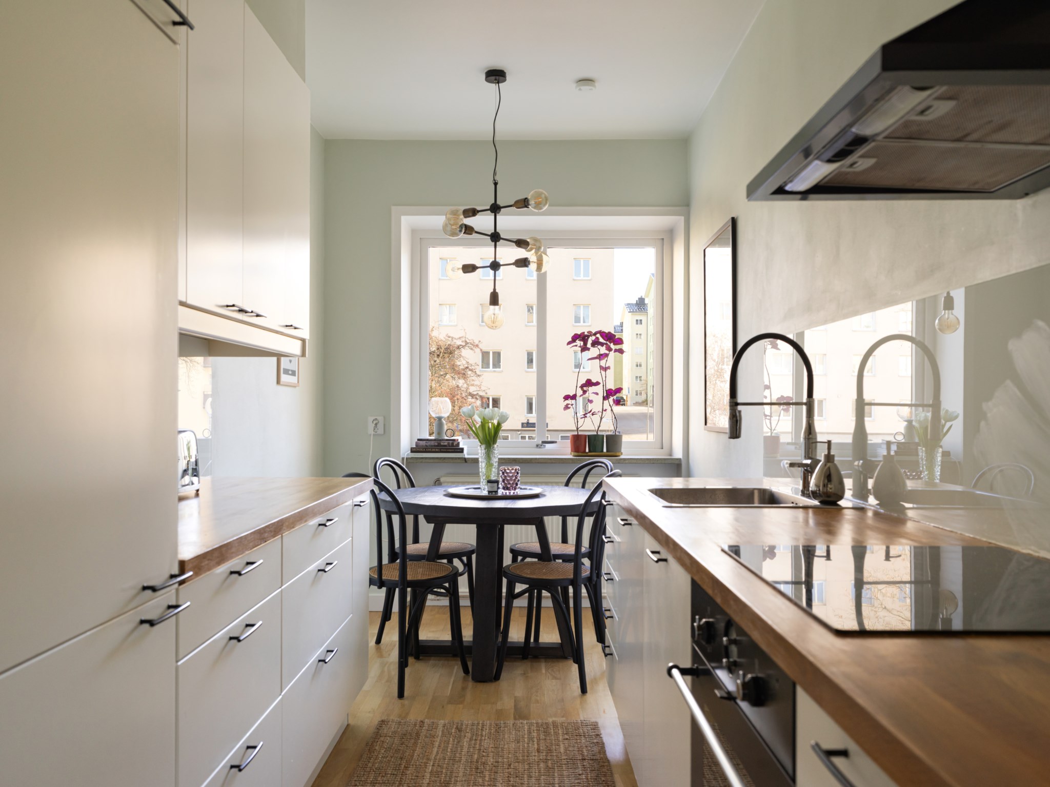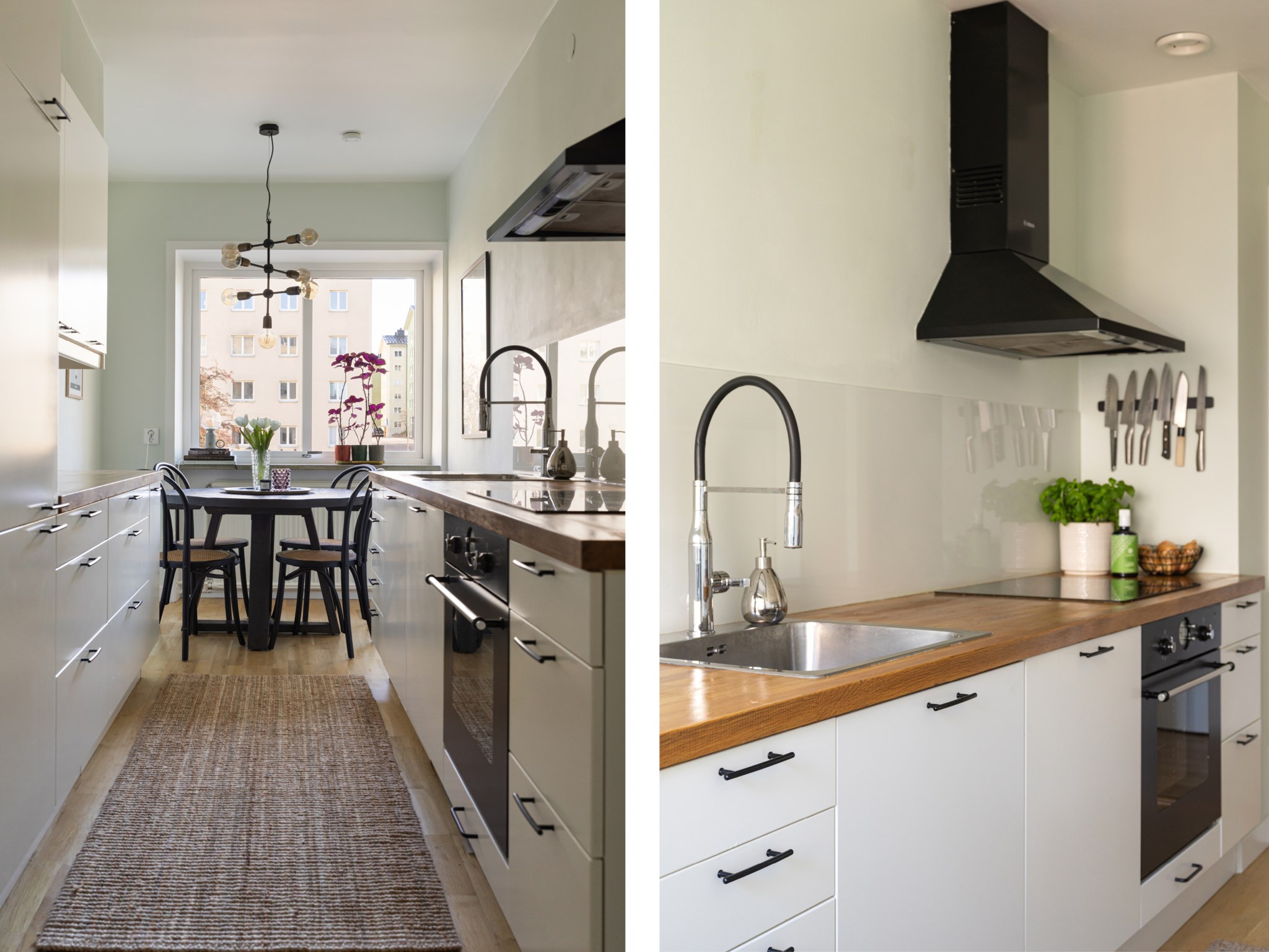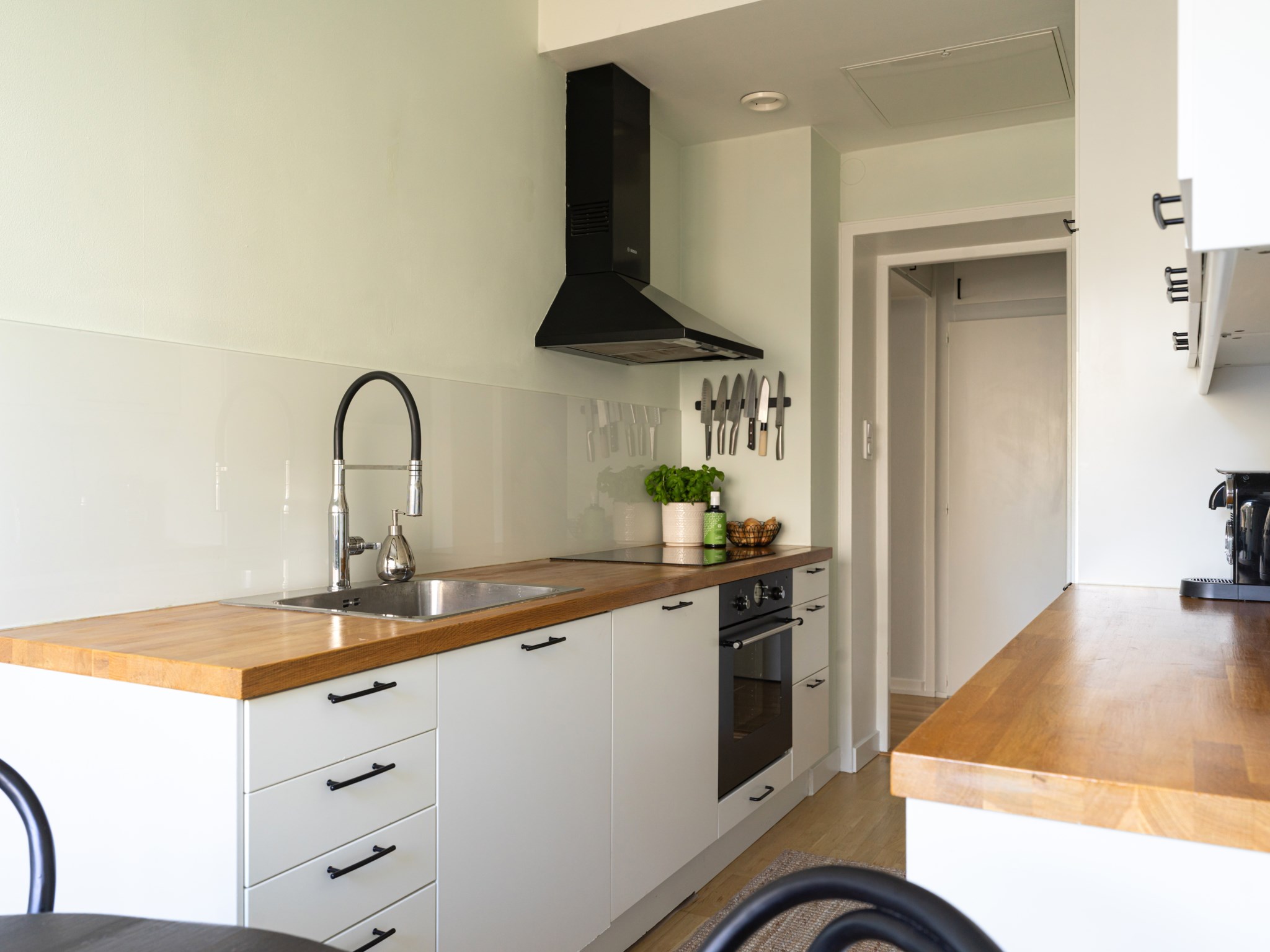 Stilrent kök med ljusa skåpsluckor och en matchande bänkskiva i trä som tillsammans skapar ett klassiskt och tidlöst uttryck. Här erbjuds goda arbetsytor och gott om förvaring i välplanerade köksskåp. Matplatsen är naturligt placerad intill fönstret och bjuder in till trevliga måltider. Den maskinella utrustningen består av kyl/frys, spishäll, ugn, takhängd fläkt samt diskmaskin. Ytskikten är målade i en ljus kulör och golvet belagt med ljus parkett.