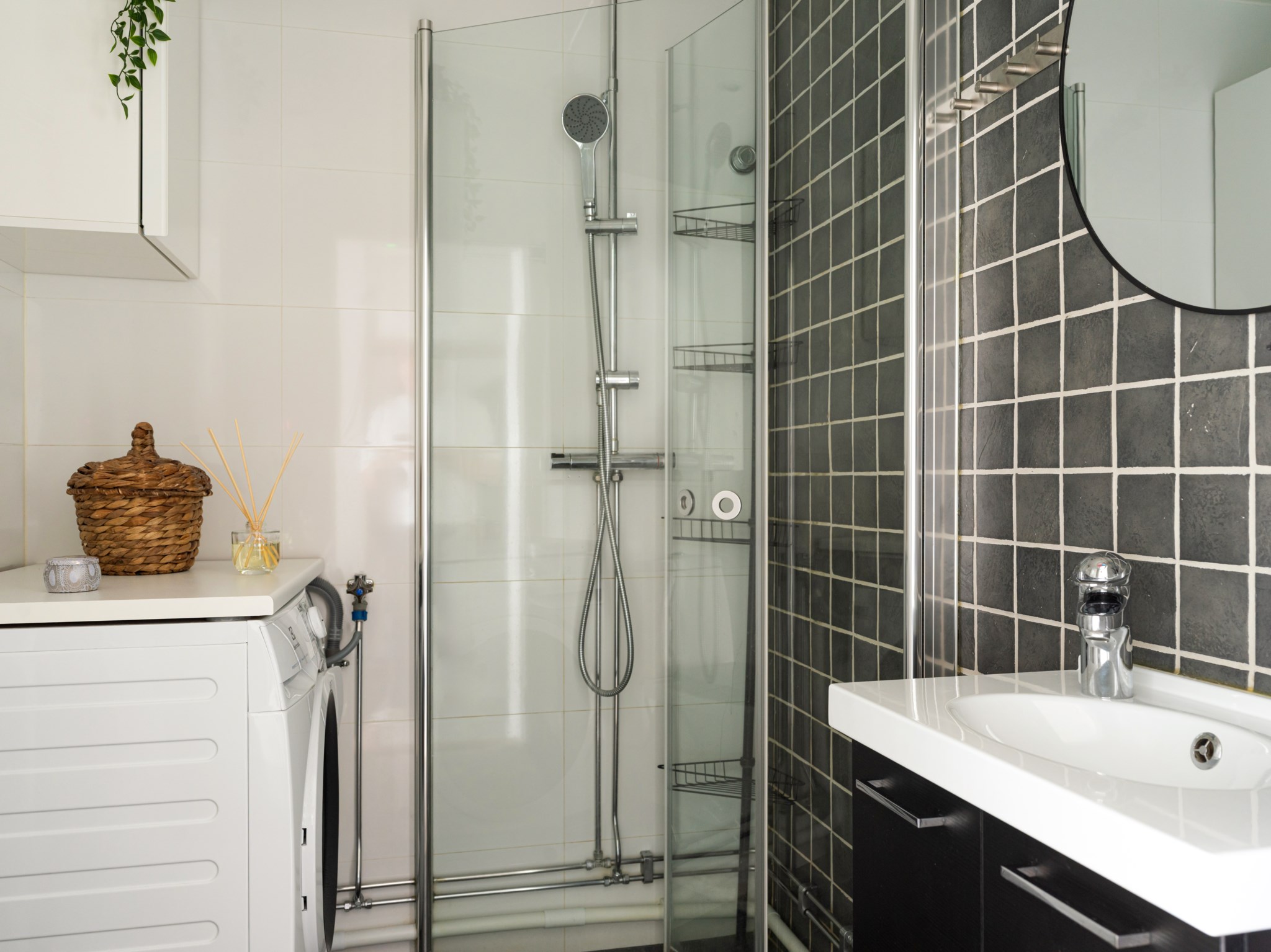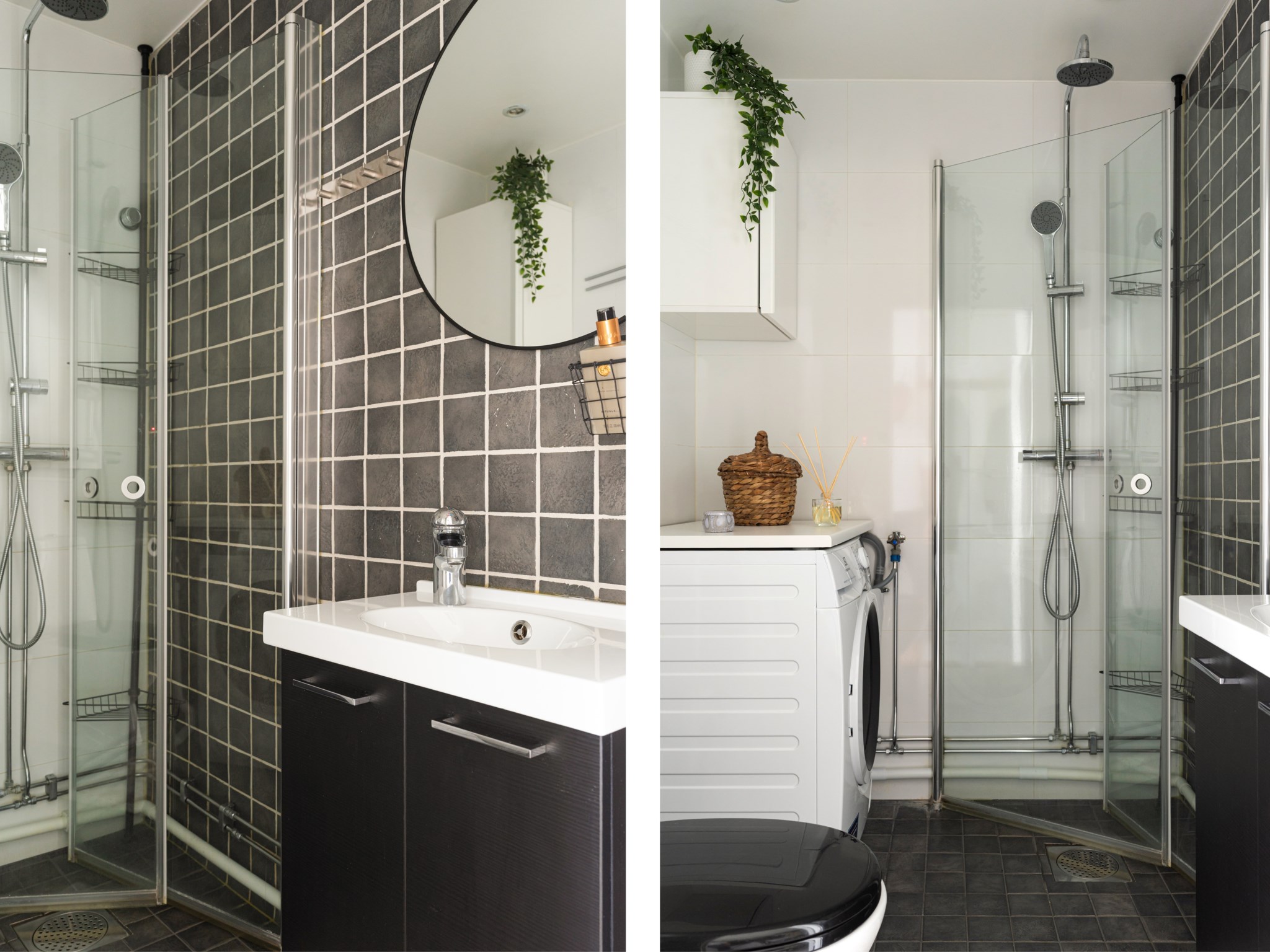Fräscht badrum med ljusmålade ytskikt i kontrast mot mörkt kakel och klinkergolv. Badrummet är inrett med WC, handfat med kommod, badrumsförvaring, tvättmaskin samt takdusch med infällbara duschväggar i klarglas.