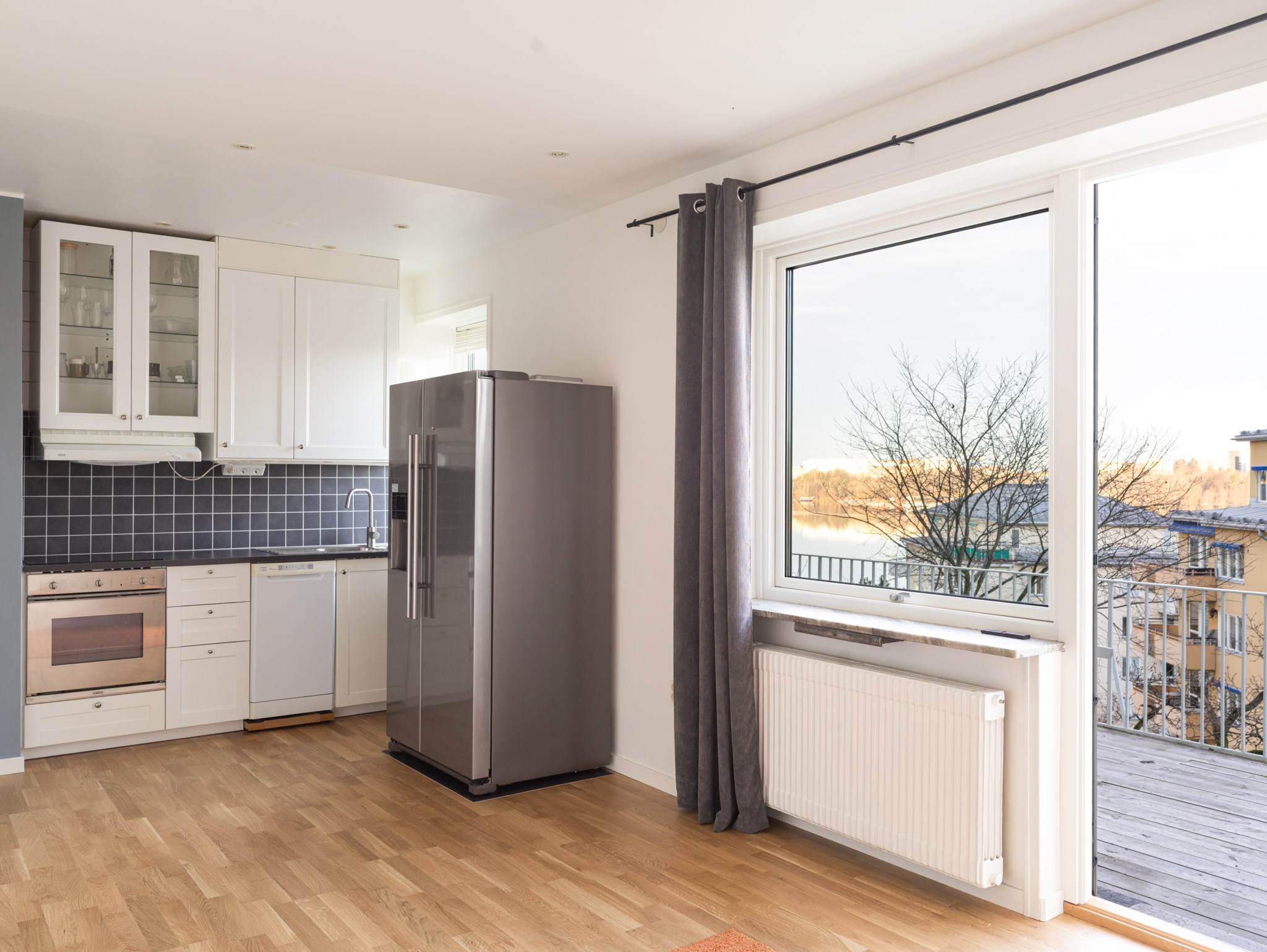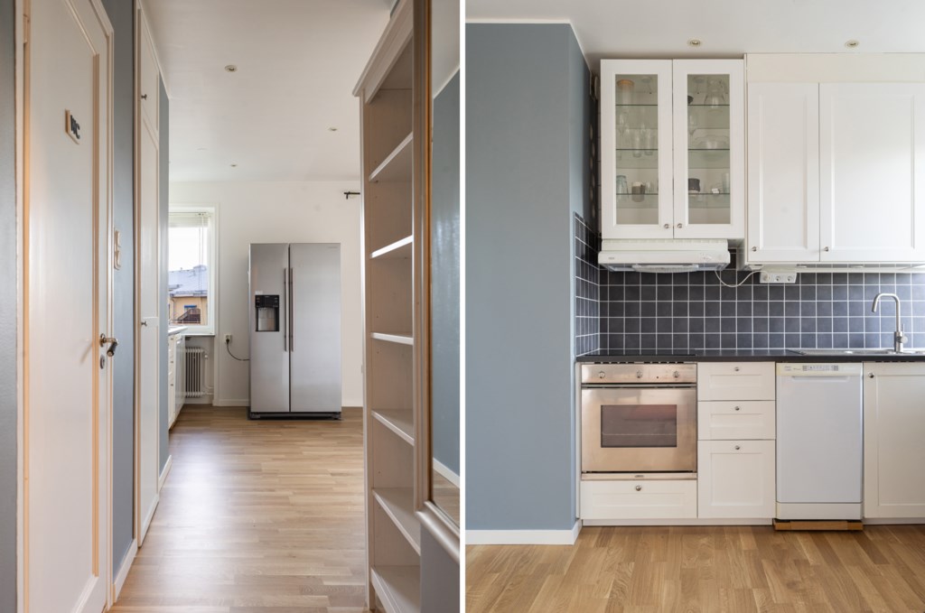 Välplanerat allrum med öppen planlösning mot köket vilket skapar en social och luftig känsla. Rummet erbjuder goda möjligheter att inreda efter behov och smak med ett generöst ljusinsläpp från fönsterpartier både i kök och vardagsrum. Direkt access till bostadens fantastiska terrass förlänger rummet utomhus under de varmare månaderna. Ljusmålade ytskikt och ljust golv.