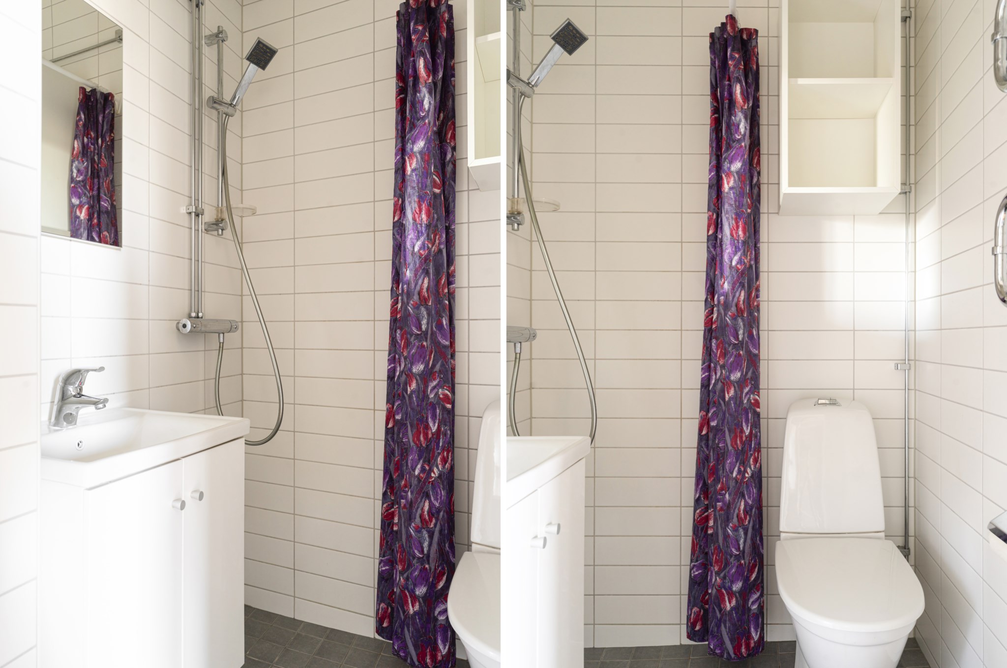 Helkaklat badrum med ljust kakel och mörkt klinkergolv. Badrummet är inrett med wc, handfat med kommod, spegel, handdukstork samt dusch.