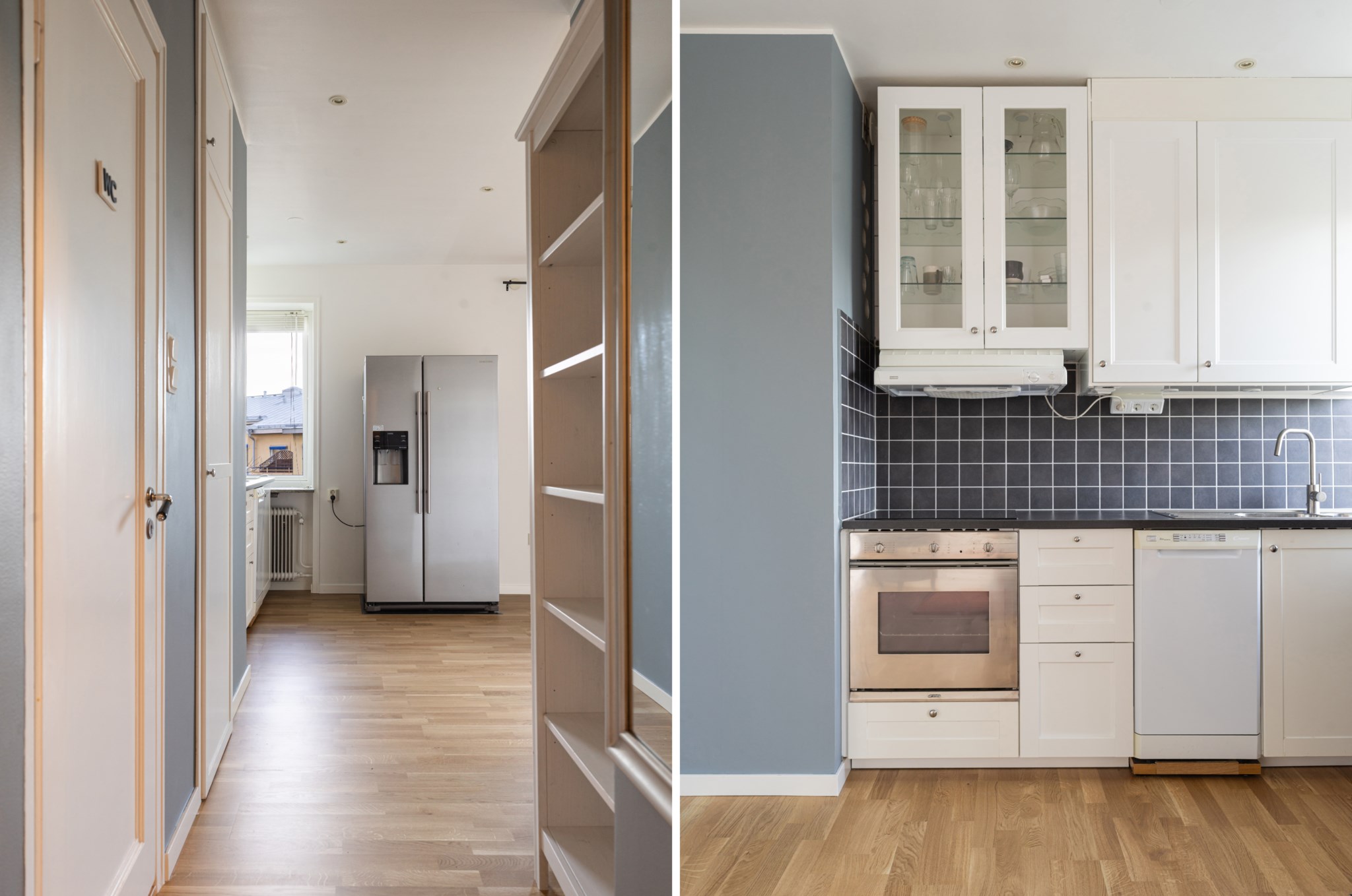 Kök med ljusa skåpsluckor, varav ett med vitrindörrar, kombinerat med mörk kaklad väggpanel och matchande mörk bänkskiva. Maskinell utrustning består av kyl/frys, spis, fläkt, ugn och diskmaskin.