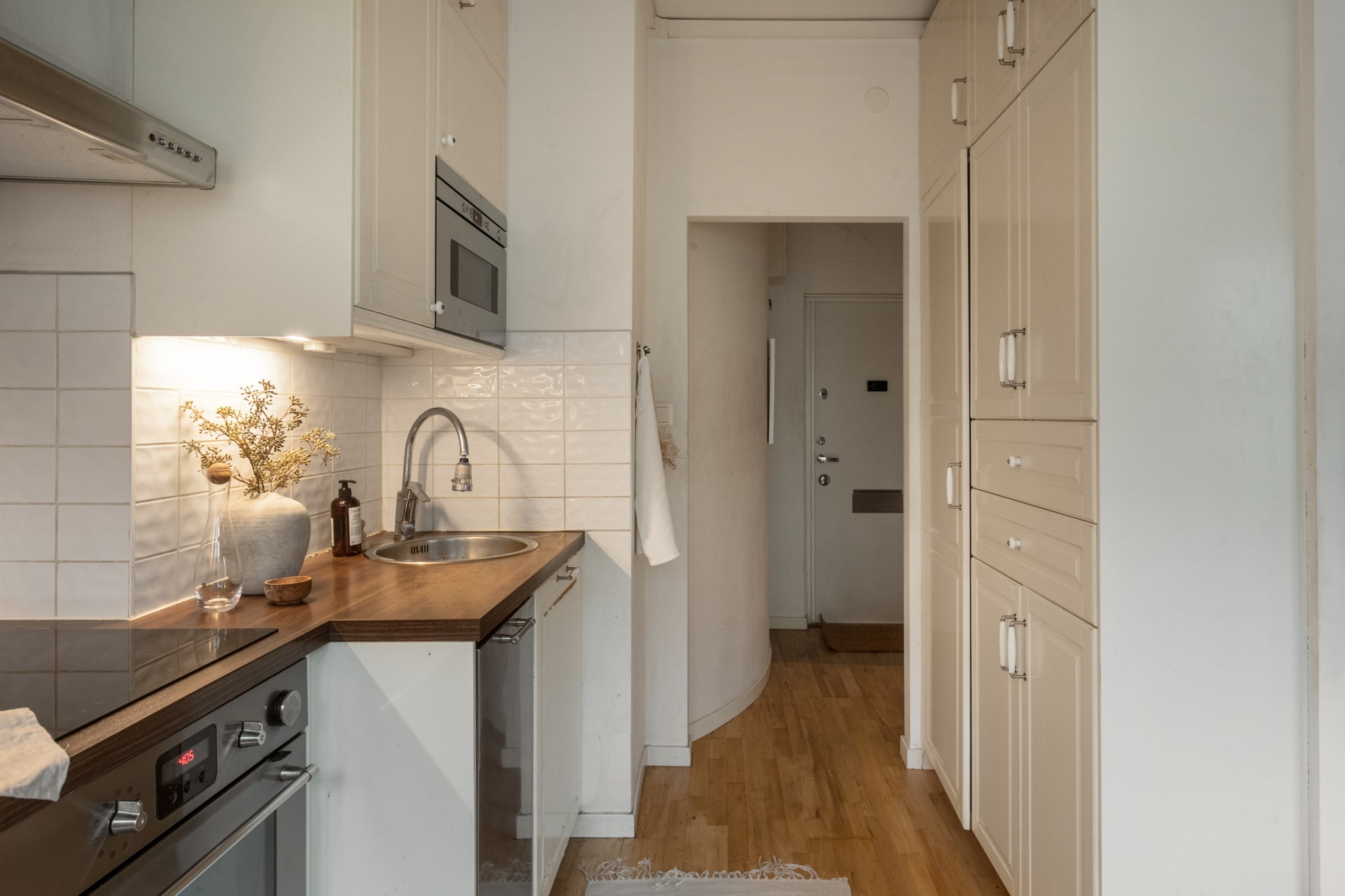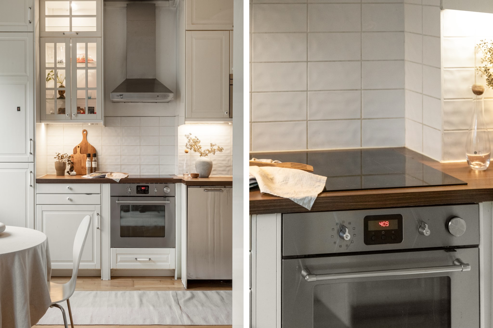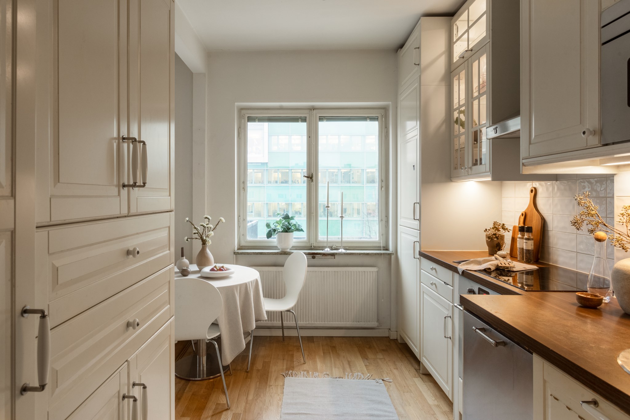 Klassiskt kök med ljusa skåpsluckor i ramprofil, där utvalda vitrinskåp med belysning tillför både karaktär och funktion. Den varma bänkskivan i trä möter en vit kaklad väggpanel och skapar en tidlös och ombonad helhet. Kökets maskinella utrustning består av kyl/frys, spishäll, fläkt, ugn och diskmaskin. Ljusa ytskikt och golv belagt med parkett.