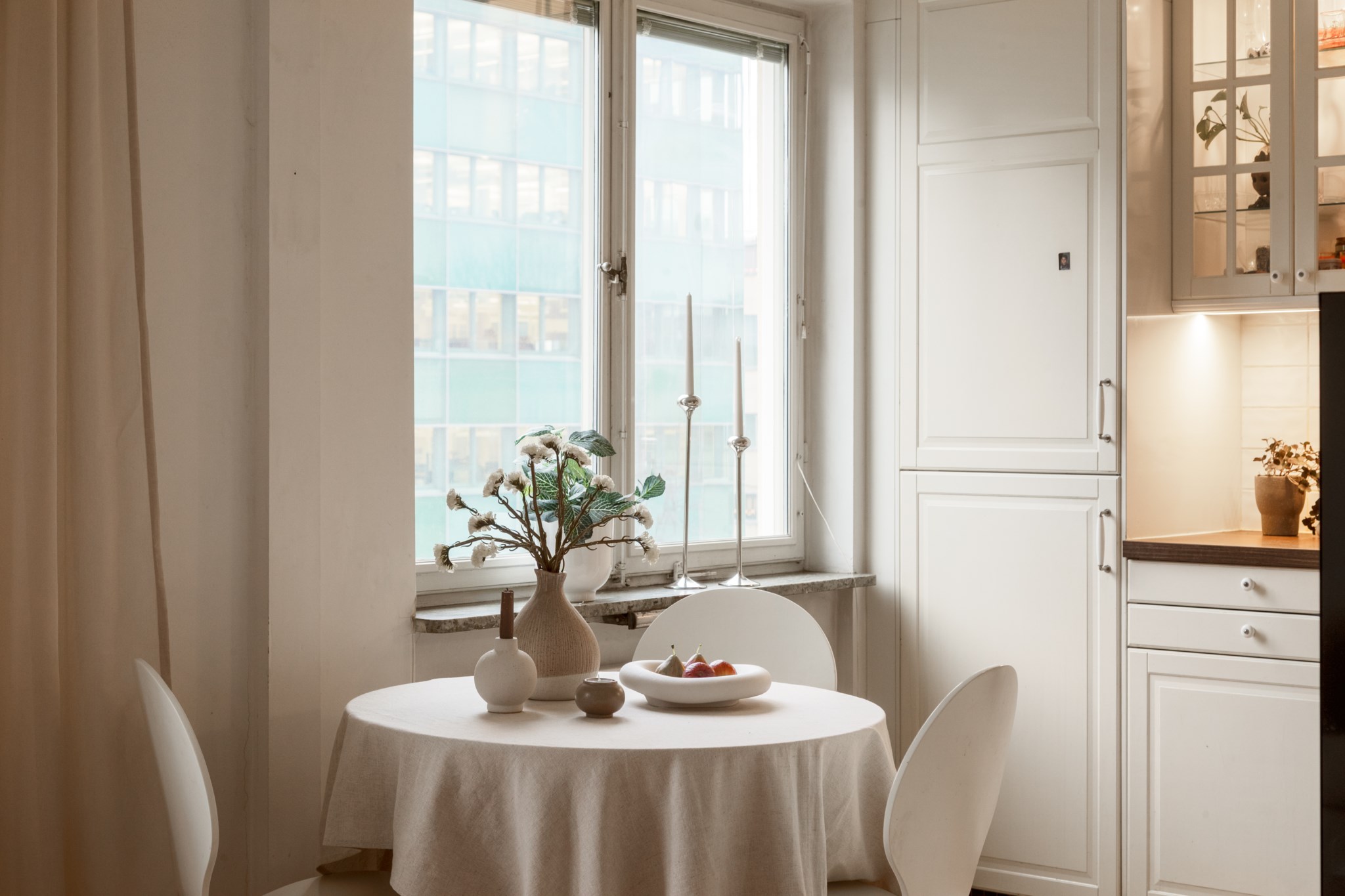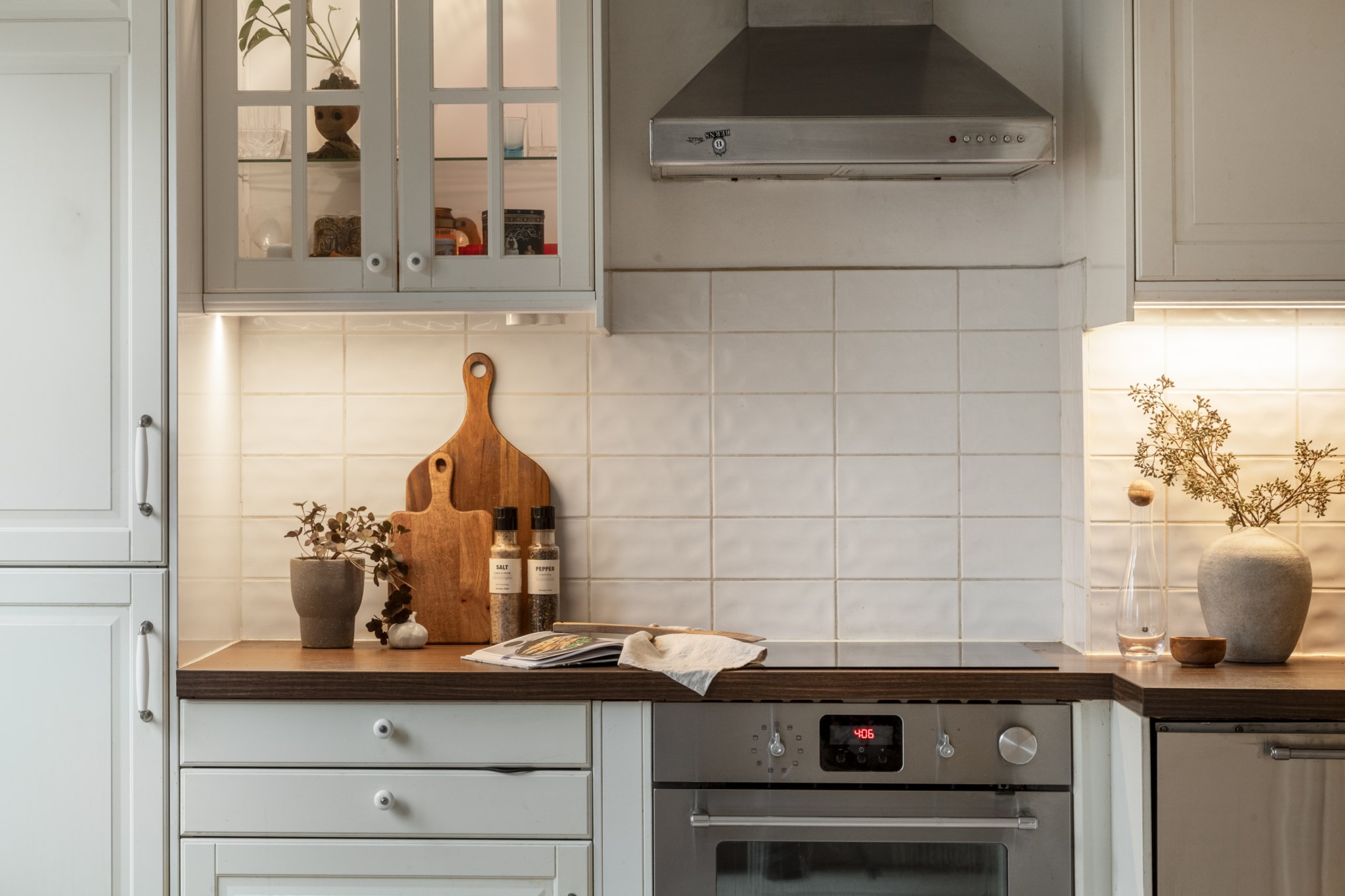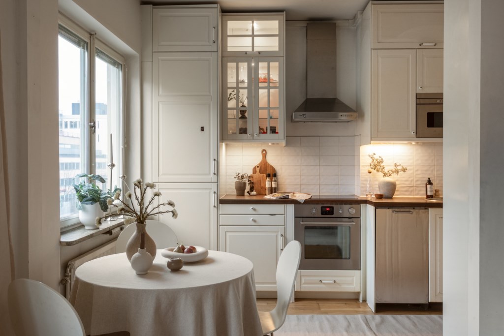 Klassiskt kök med ljusa skåpsluckor i ramprofil, där utvalda vitrinskåp med belysning tillför både karaktär och funktion. Den varma bänkskivan i trä möter en vit kaklad väggpanel och skapar en tidlös och ombonad helhet. Kökets maskinella utrustning består av kyl/frys, spishäll, fläkt, ugn och diskmaskin. Ljusa ytskikt och golv belagt med parkett.