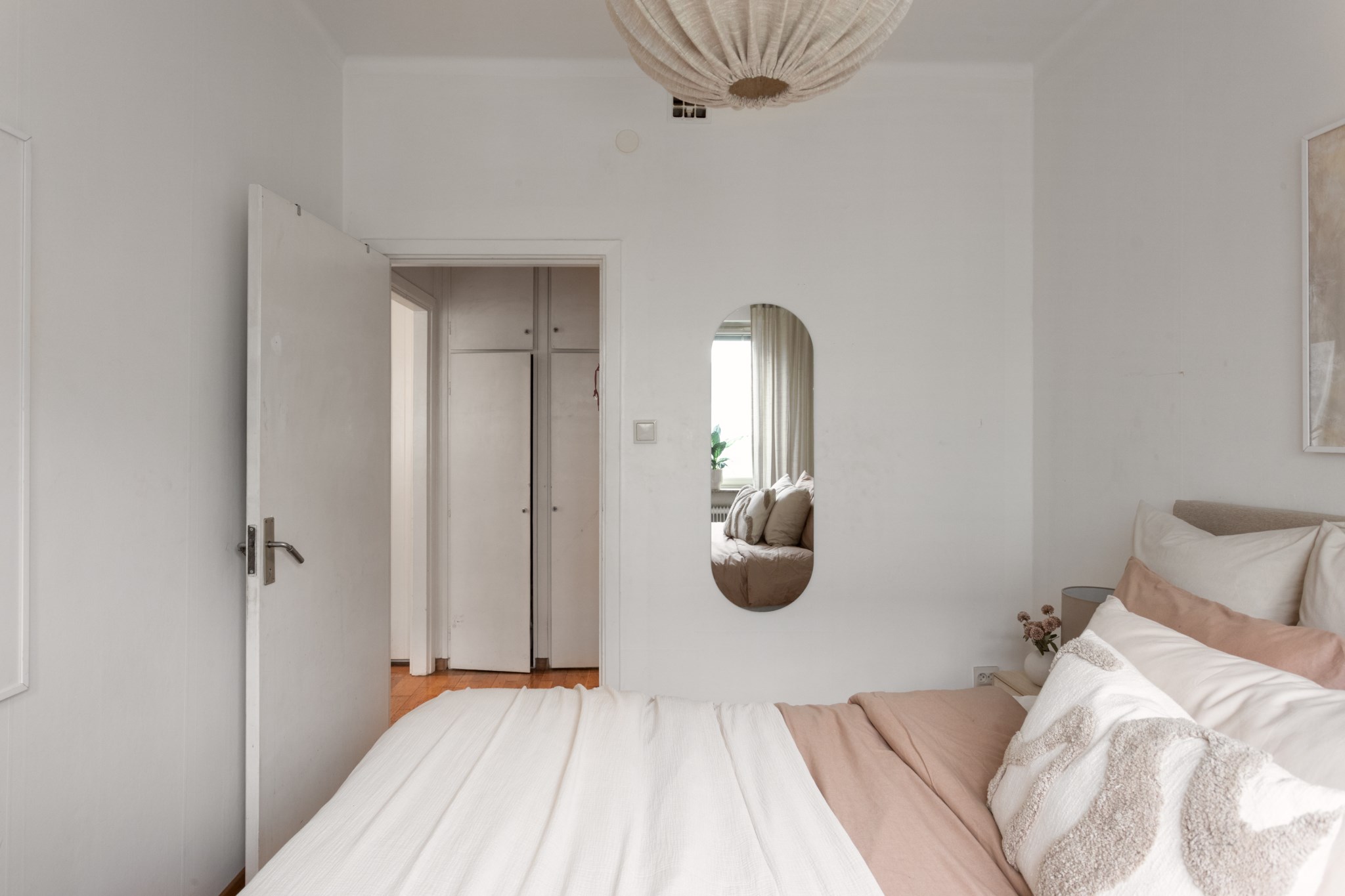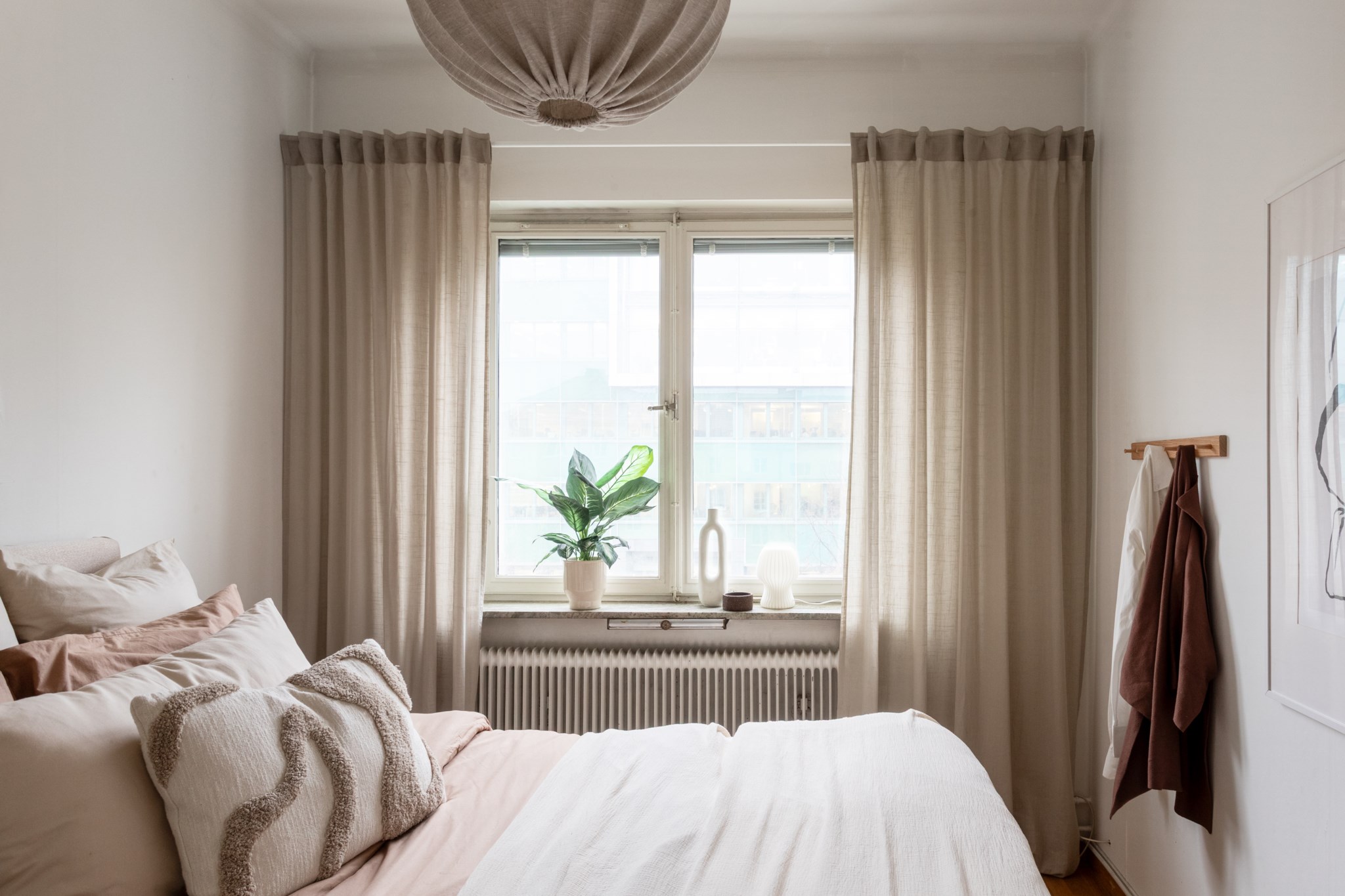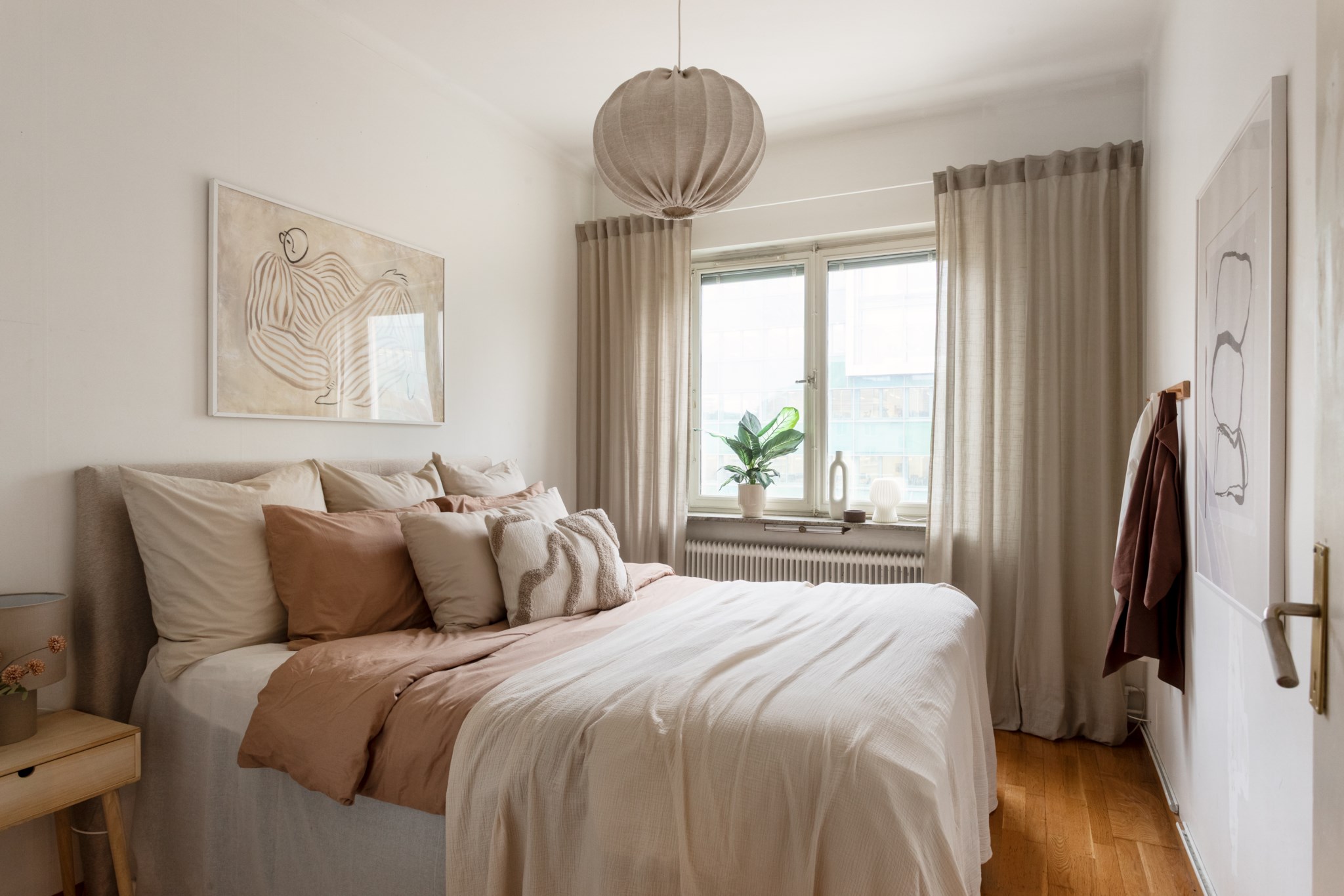 Mysigt sovrum med ljusmålade väggar och gott om plats för en dubbelsäng med tillhörande sängbord. Det generösa fönsterpartiet släpper in ett vackert ljus som lyser upp rummet och skapar en trivsam atmosfär. Här finns även möjlighet till bra förvaring genom garderober eller annan förvaringsmöbel efter behov.