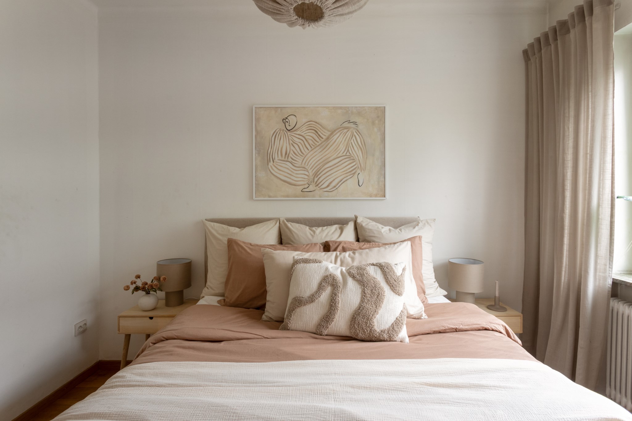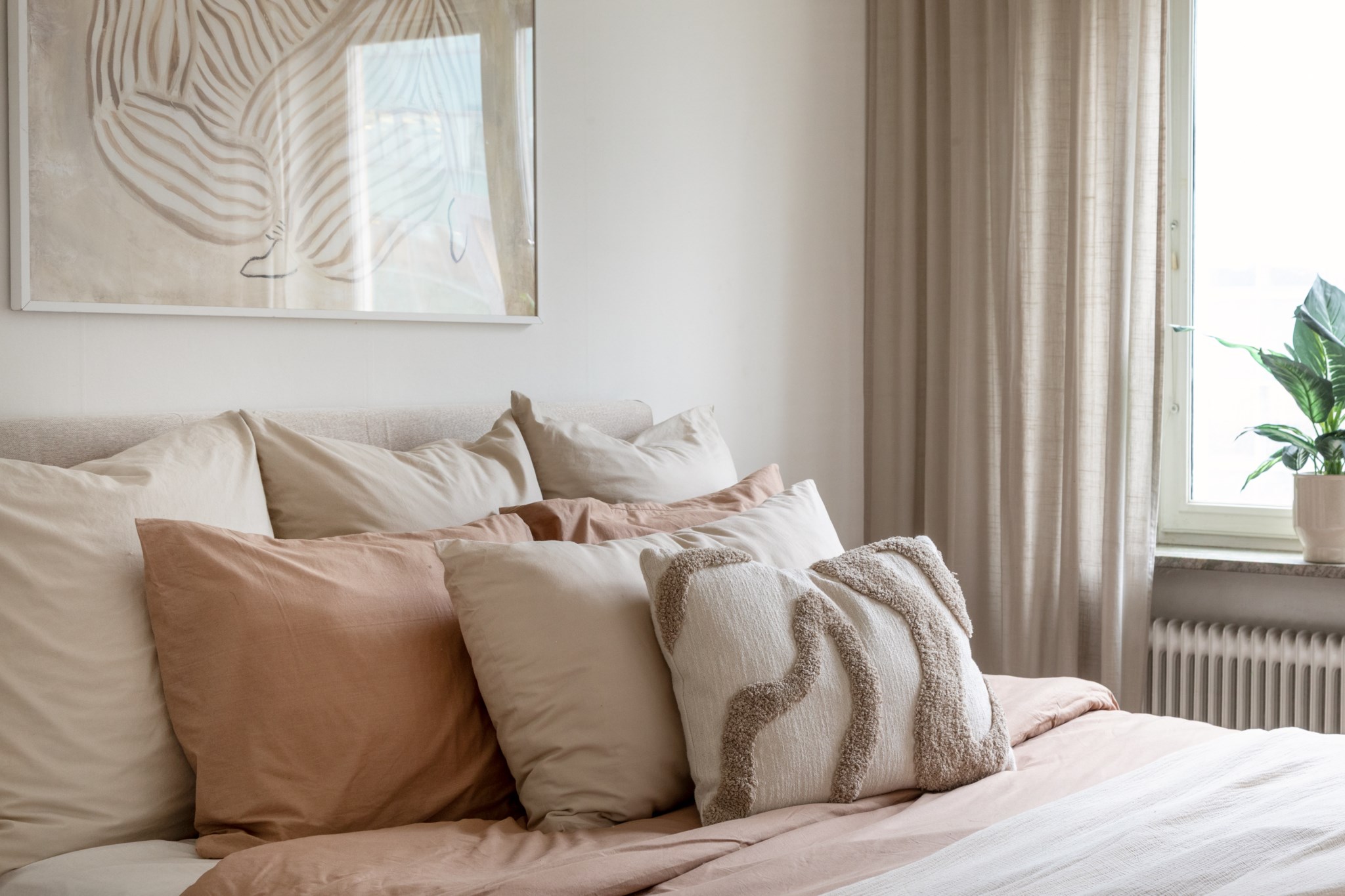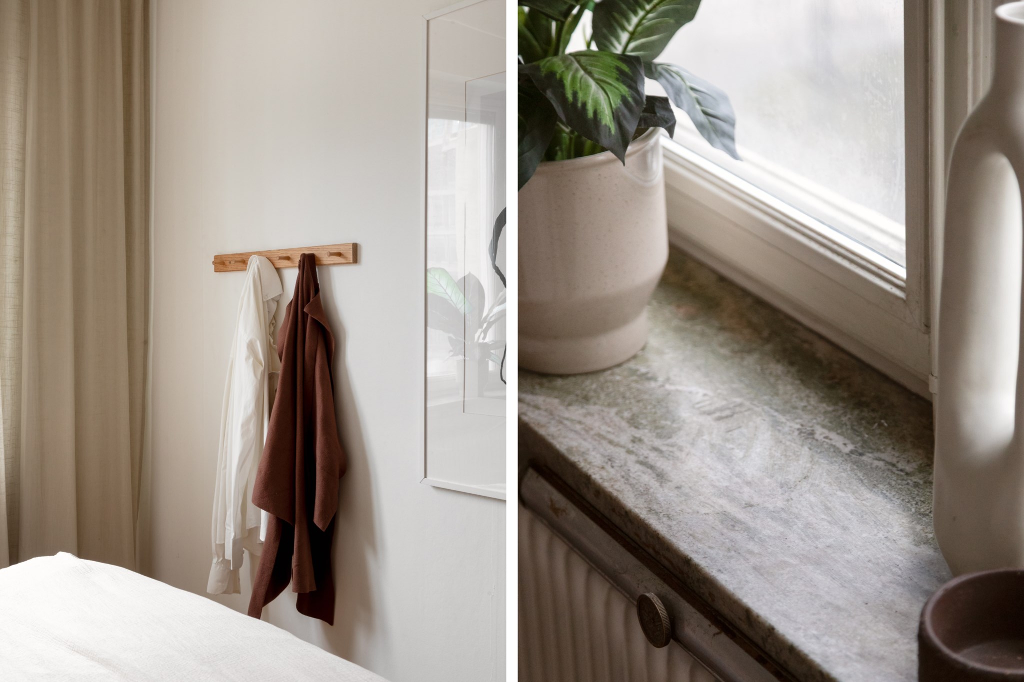 Mysigt sovrum med ljusmålade väggar och gott om plats för en dubbelsäng med tillhörande sängbord. Det generösa fönsterpartiet släpper in ett vackert ljus som lyser upp rummet och skapar en trivsam atmosfär. Här finns även möjlighet till bra förvaring genom garderober eller annan förvaringsmöbel efter behov.