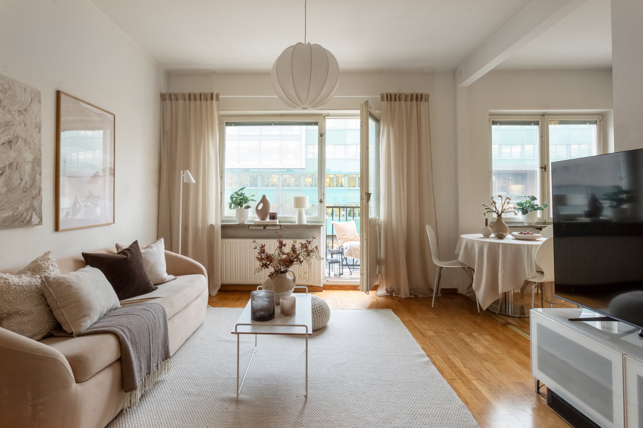 Bostaden är genomgående ljus med otroligt ljusinsläpp från stora fönster. Den öppna planlösningen mellan kök och vardagsrum skapar generösa sällskapsytor med plats för både matbord och soffmöblemang. Från vardagsrummet nås den härliga balkongen! Det ljusa och stilrena köket är välutrustat med bland annat diskmaskin. Sovrummet är rymligt och bostaden erbjuder goda förvaringsmöjligheter. Fräscht och modernt badrum!