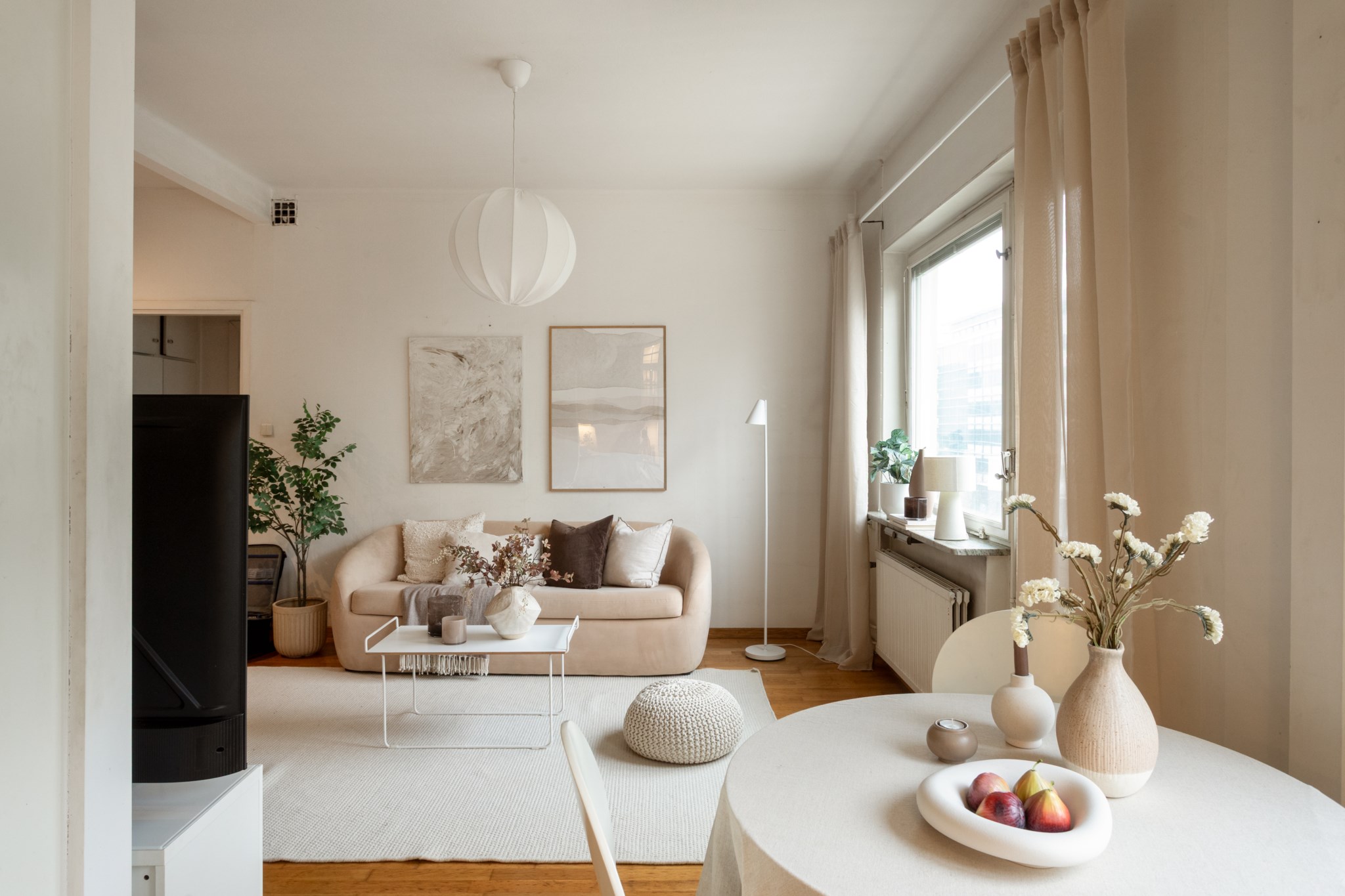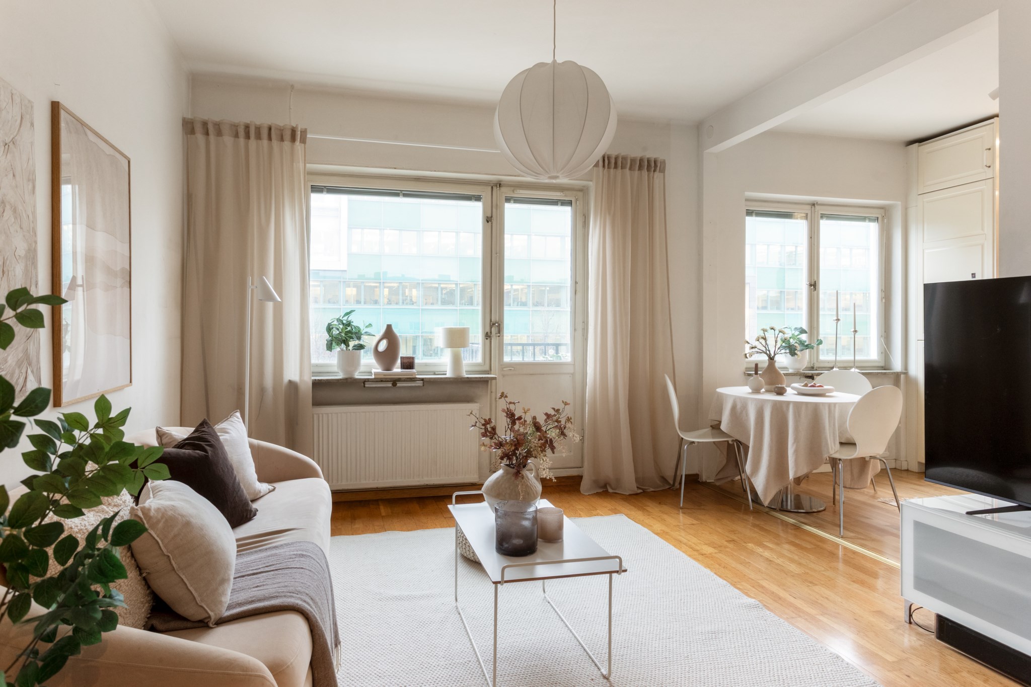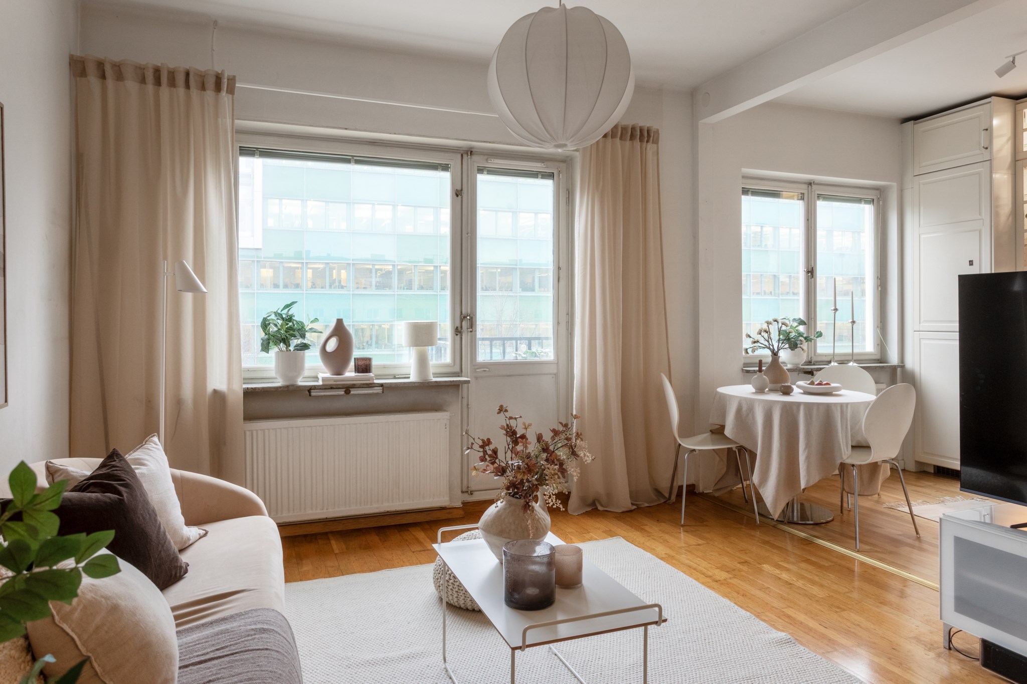 Trivsamt vardagsrum med en social, öppen planlösning mot köket som skapar en luftig och inbjudande helhet. De stora fönsterpartierna släpper in rikligt med naturligt ljus och ger rummet en ljus och behaglig atmosfär. Här finns gott om plats för både en bekväm soffgrupp och en matplats – perfekt för både vardag och sociala tillställningar. Ljusmålade ytskikt och golv belagt med parkett.