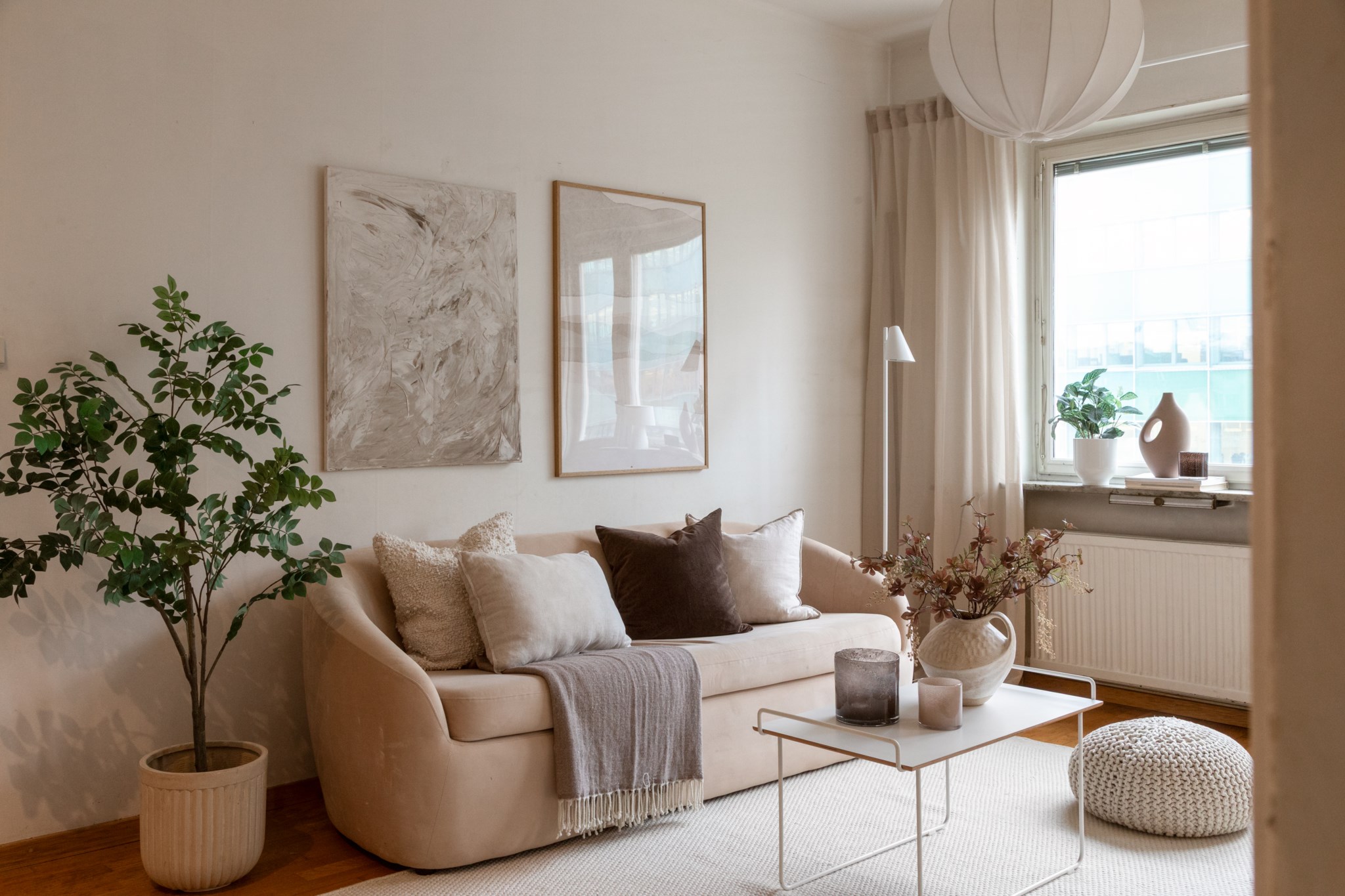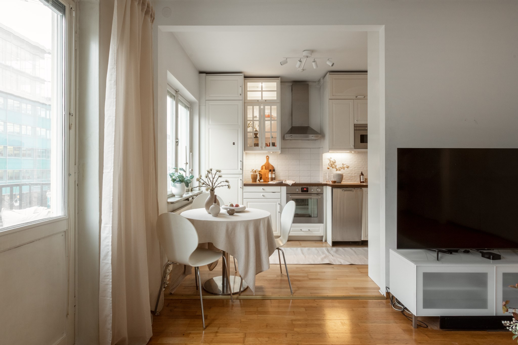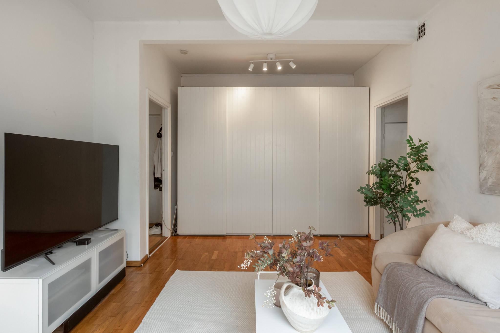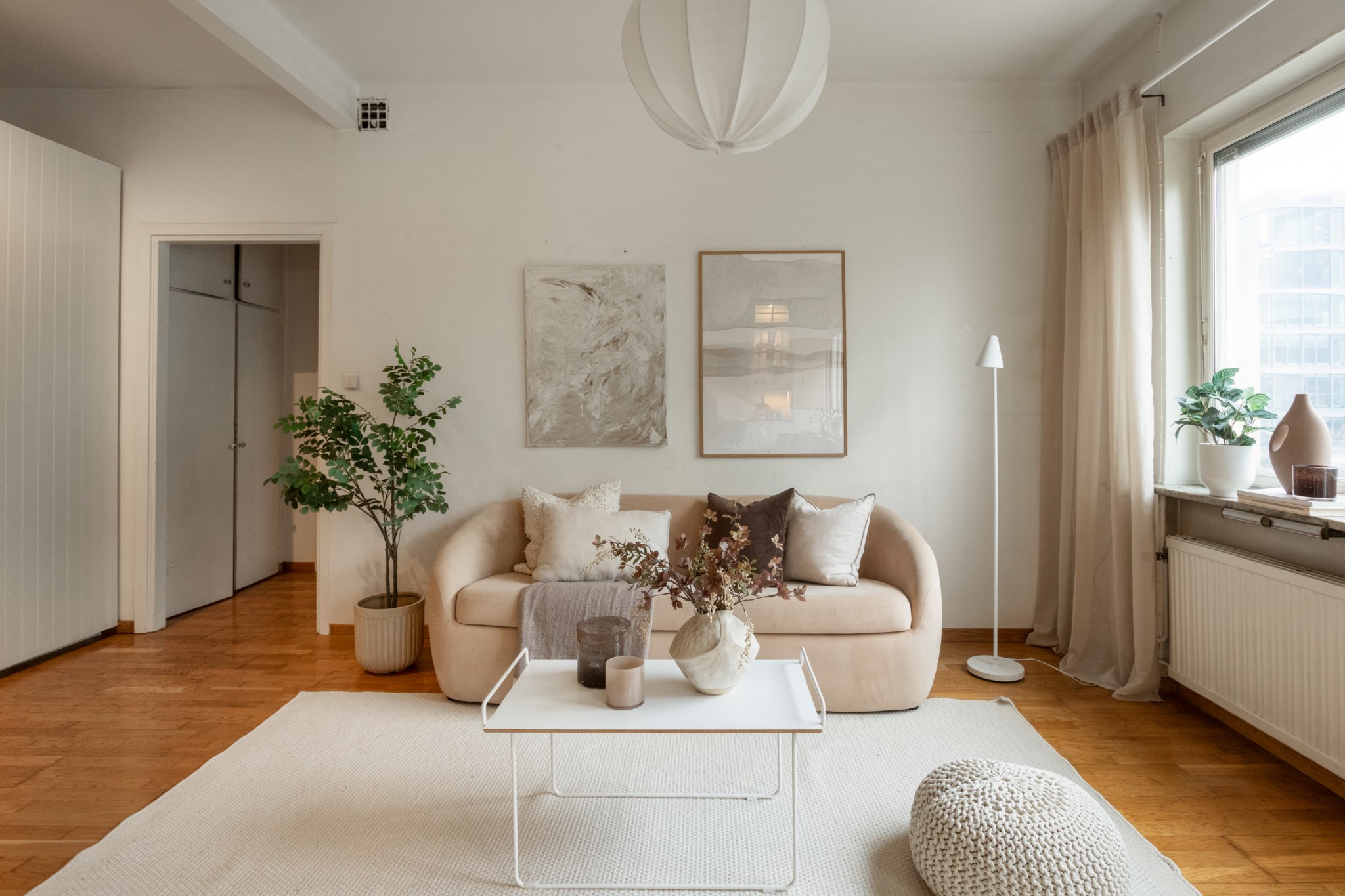 Trivsamt vardagsrum med en social, öppen planlösning mot köket som skapar en luftig och inbjudande helhet. De stora fönsterpartierna släpper in rikligt med naturligt ljus och ger rummet en ljus och behaglig atmosfär. Här finns gott om plats för både en bekväm soffgrupp och en matplats – perfekt för både vardag och sociala tillställningar. Ljusmålade ytskikt och golv belagt med parkett.