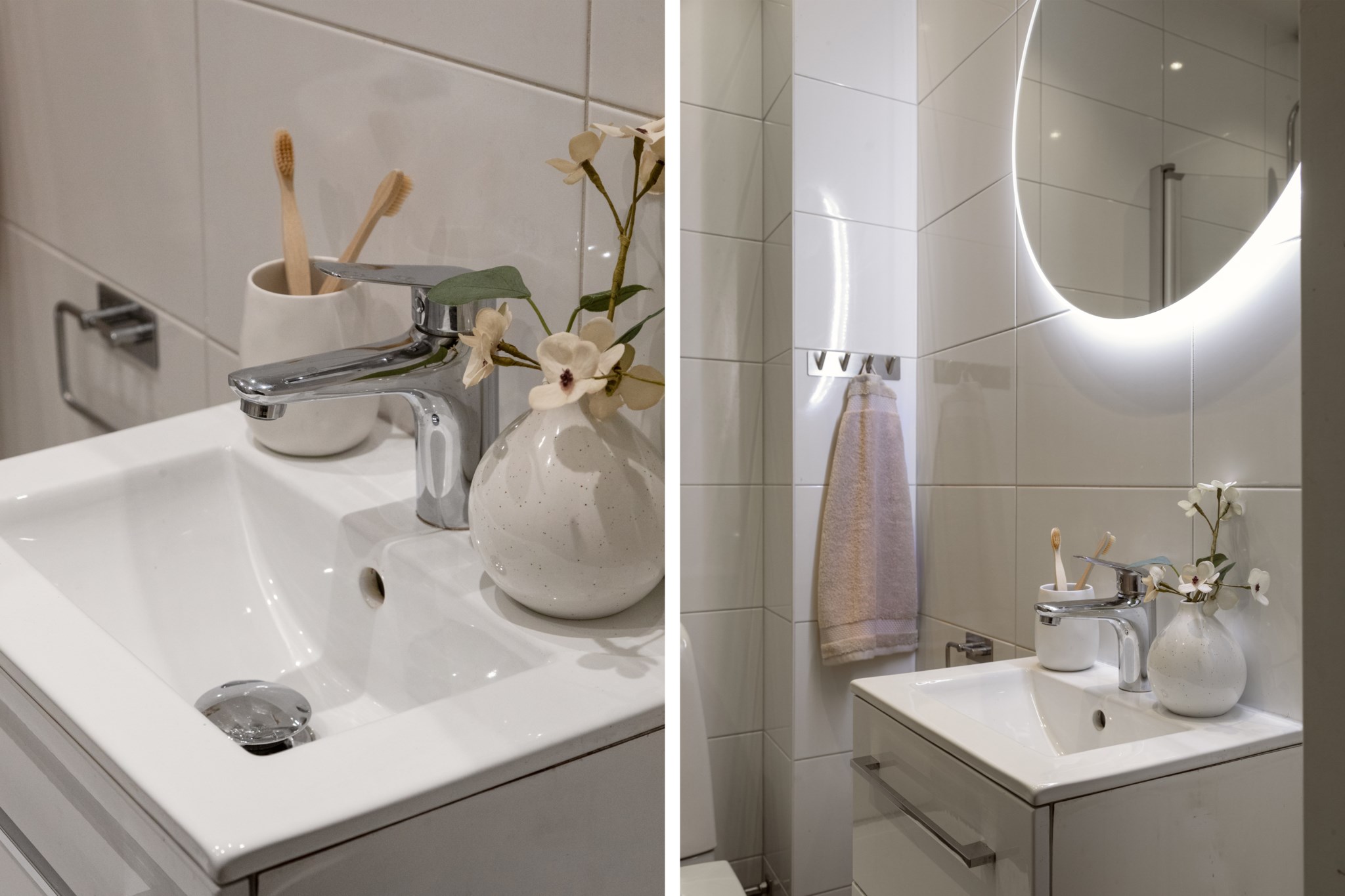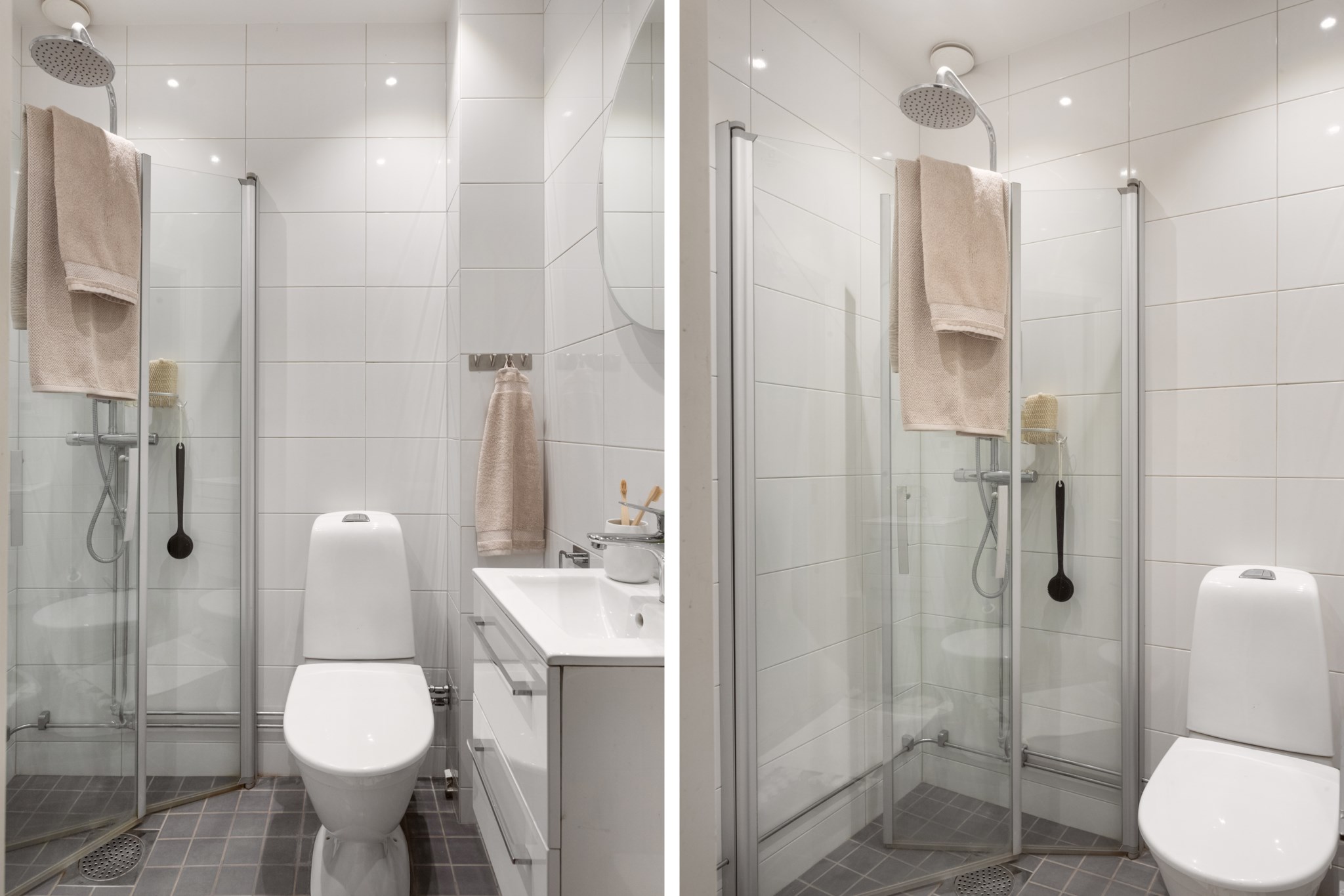 Ljust badrum inrett med WC, handfat med kommod, spegel med belysning samt dusch.