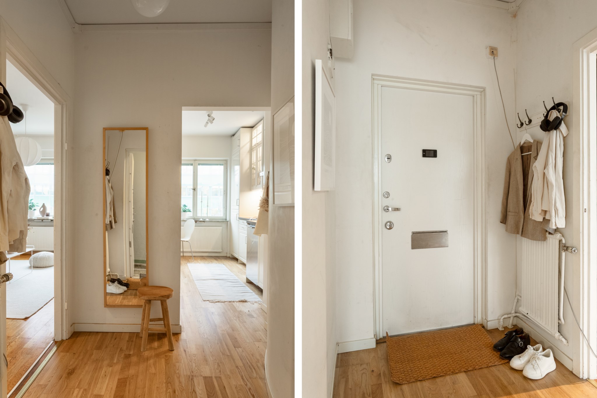 Välkomnande hall med goda möjligheter till avhängning direkt intill ytterdörren, alternativt i de flertalet garderober för den som föredrar mer dold förvaring. Ljusmålade ytskikt och golv belagt med parkett.
