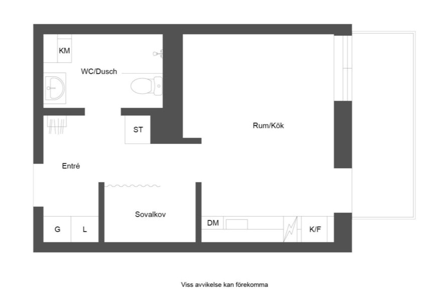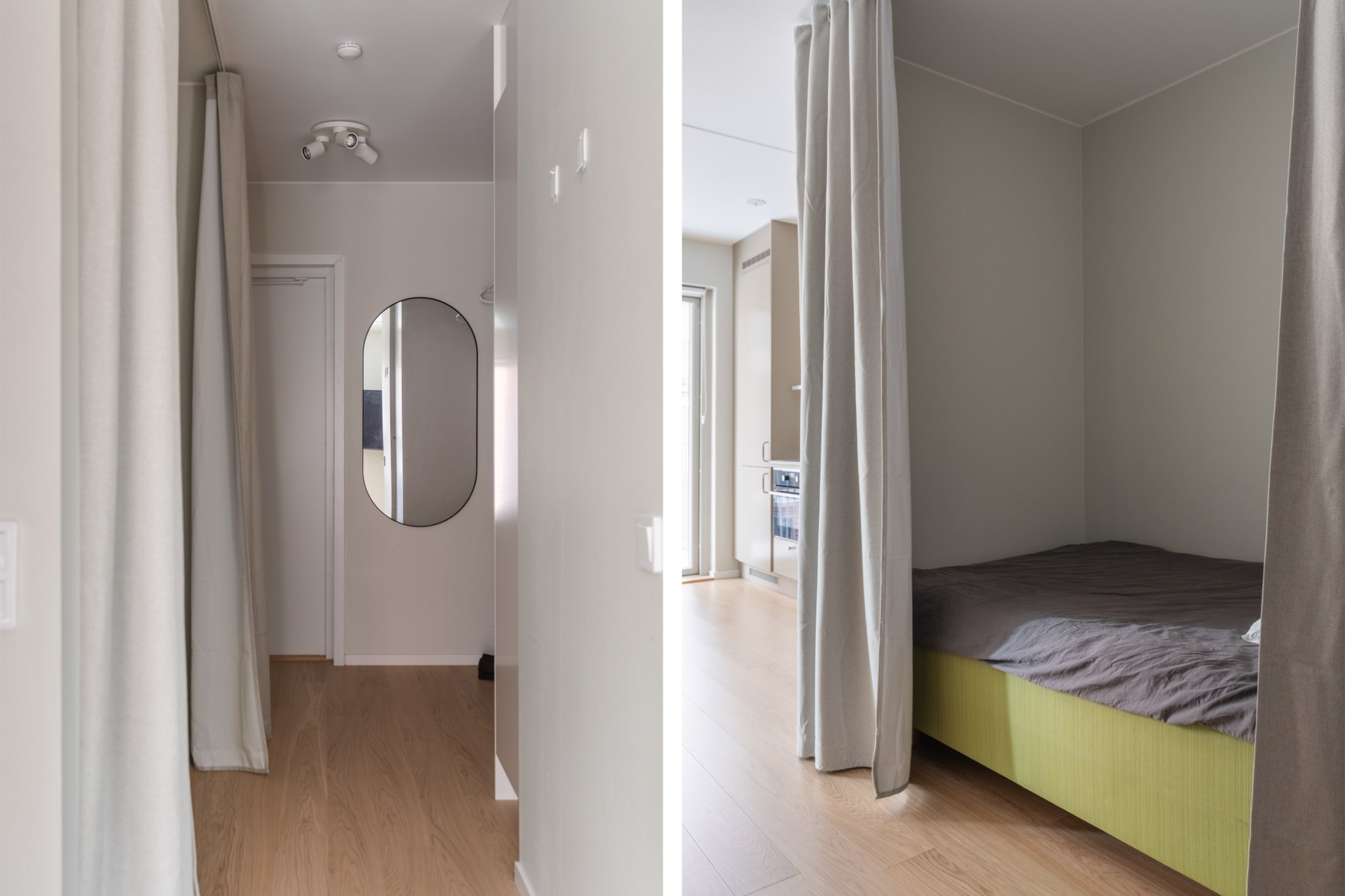 Den avskilda sovalkoven ger hemmet en tydlig och privat sovdel som enkelt kan ramas in med gardiner eller skärmvägg – perfekt för att skapa en mysig, rofylld atmosfär.