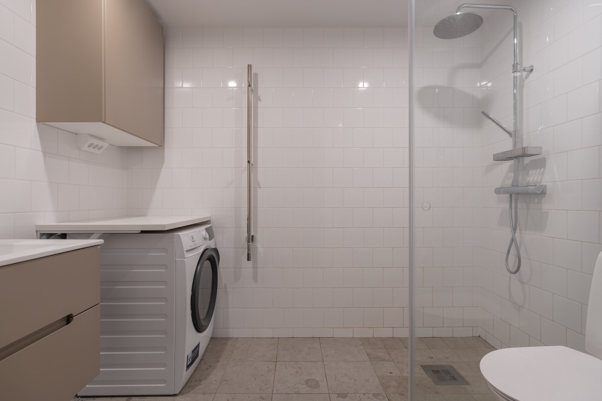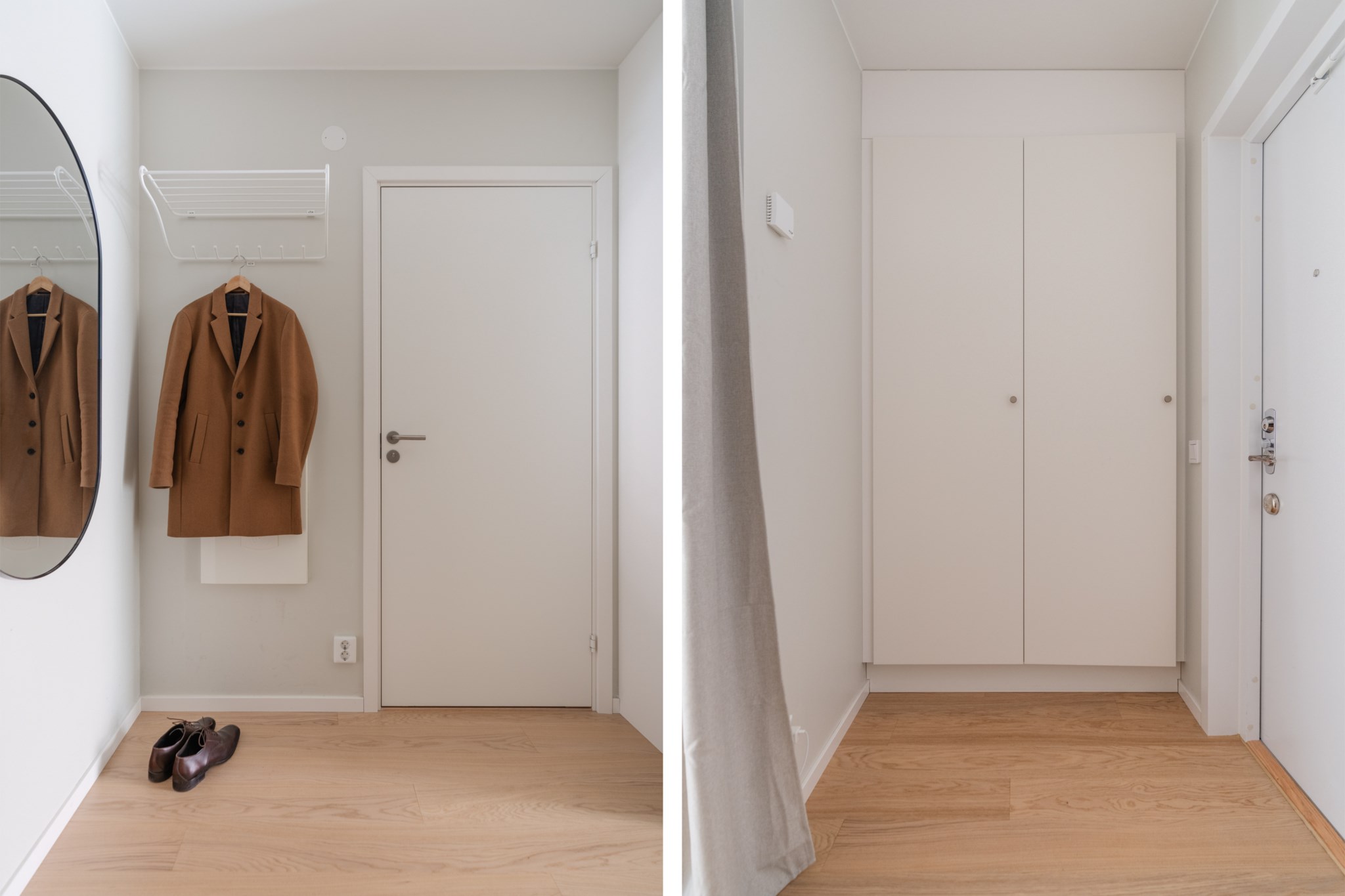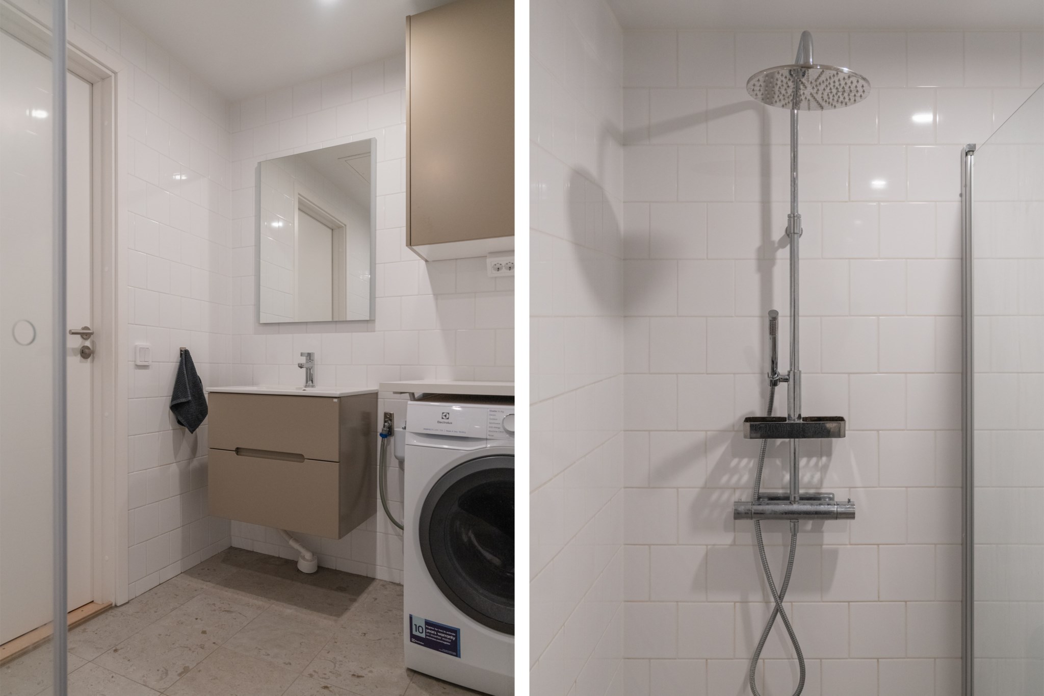 Redan i hallen möts du av god förvaring med både garderob och praktiskt städskåp. Intill ligger det rymliga och fräscha badrummet, utrustat med moderna materialval och smart placerad tvättdel för optimal bekvämlighet.