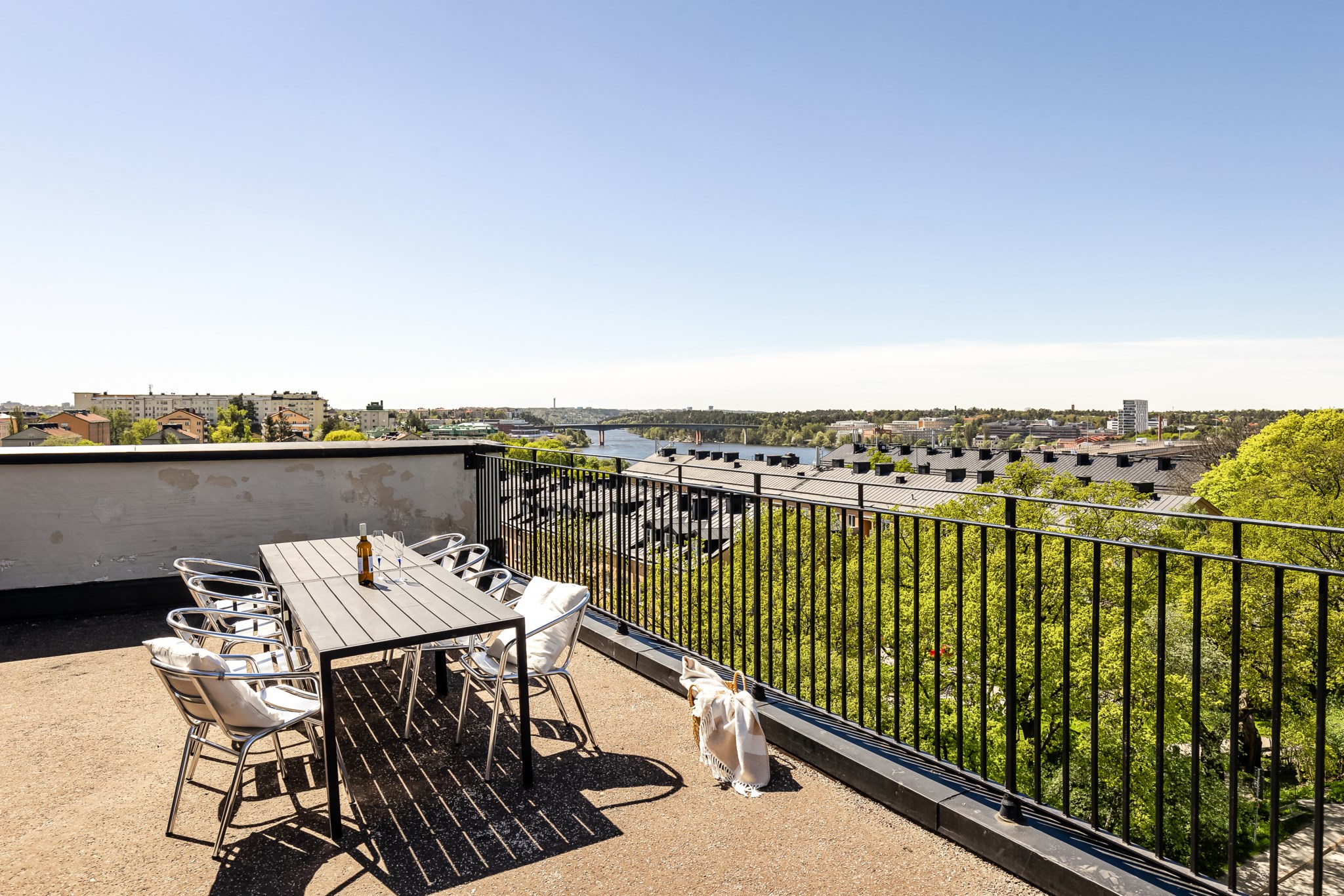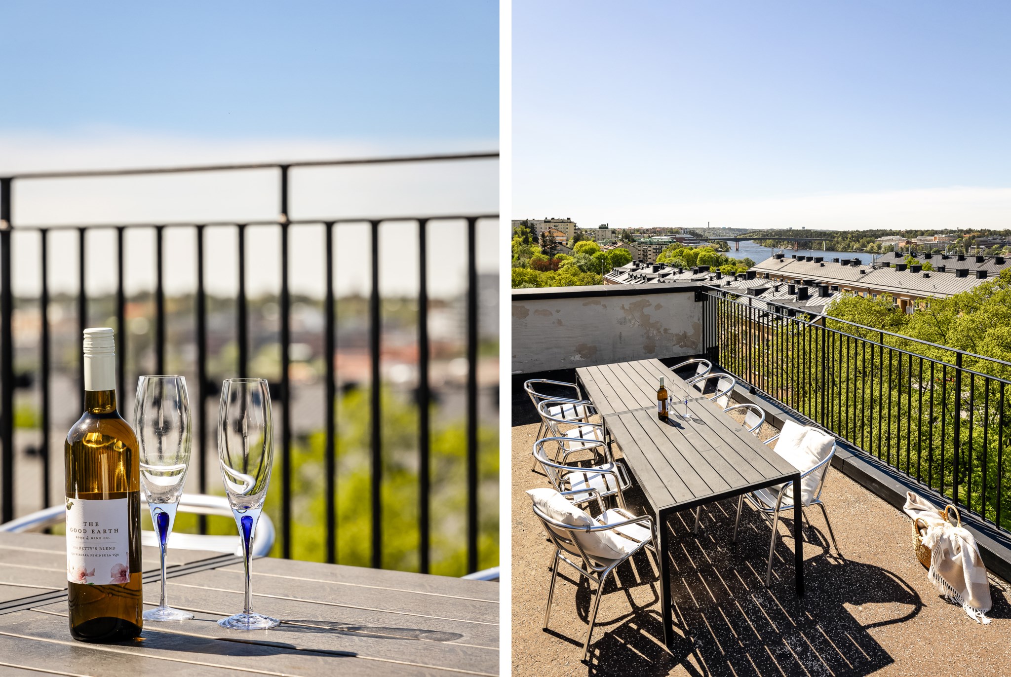Rymligt balkong med plats för både loungegrupp och sittmöbel.