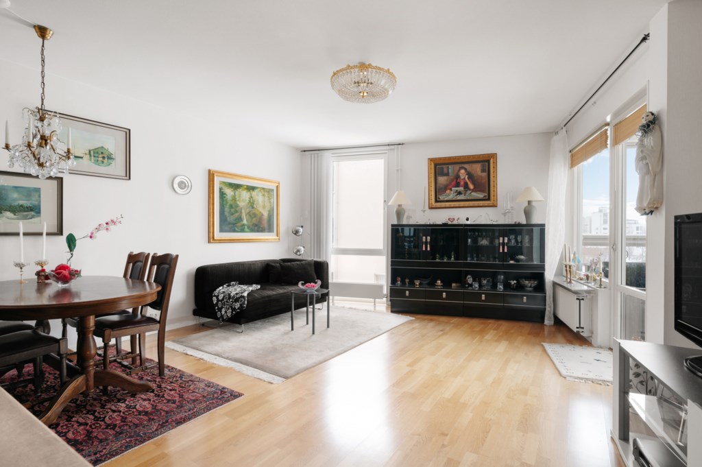 Öppen planlösning mot köket med gott om plats till matplats och soffgrupp. Här finns fönster i två väderstreck och utgång till bostadens balkong.