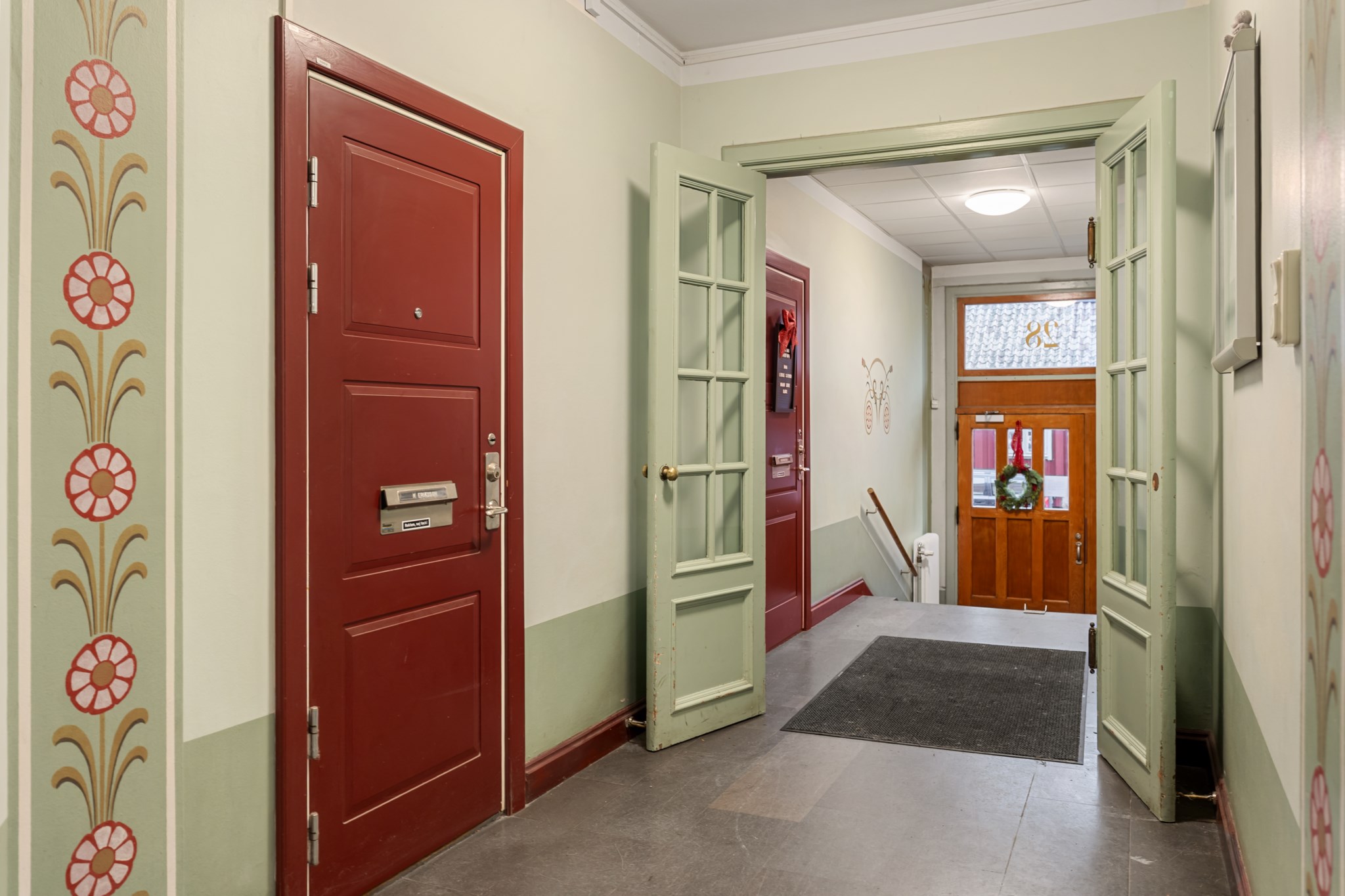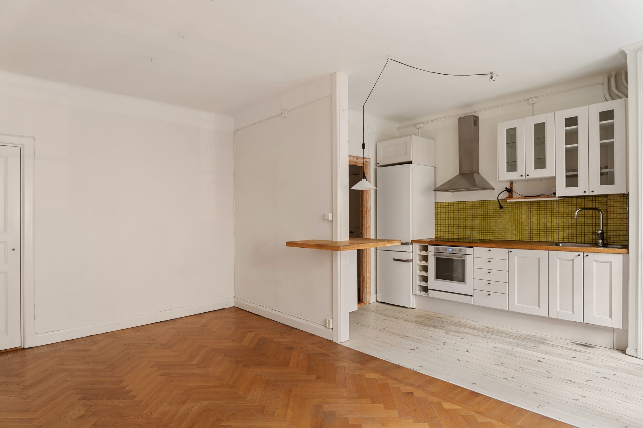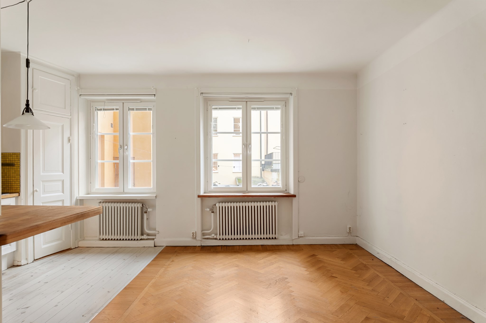 Här möts du av tydlig karaktär och vackra tidstypiska detaljer såsom stora spröjsade fönster, speglade dörrar, generös takhöjd och klassisk fiskbensparkett. Planlösningen är yteffektiv och trivsam med goda möjligheter för både umgänge och avkoppling, och det finns även möjlighet att bygga om bostaden till en tvåa.