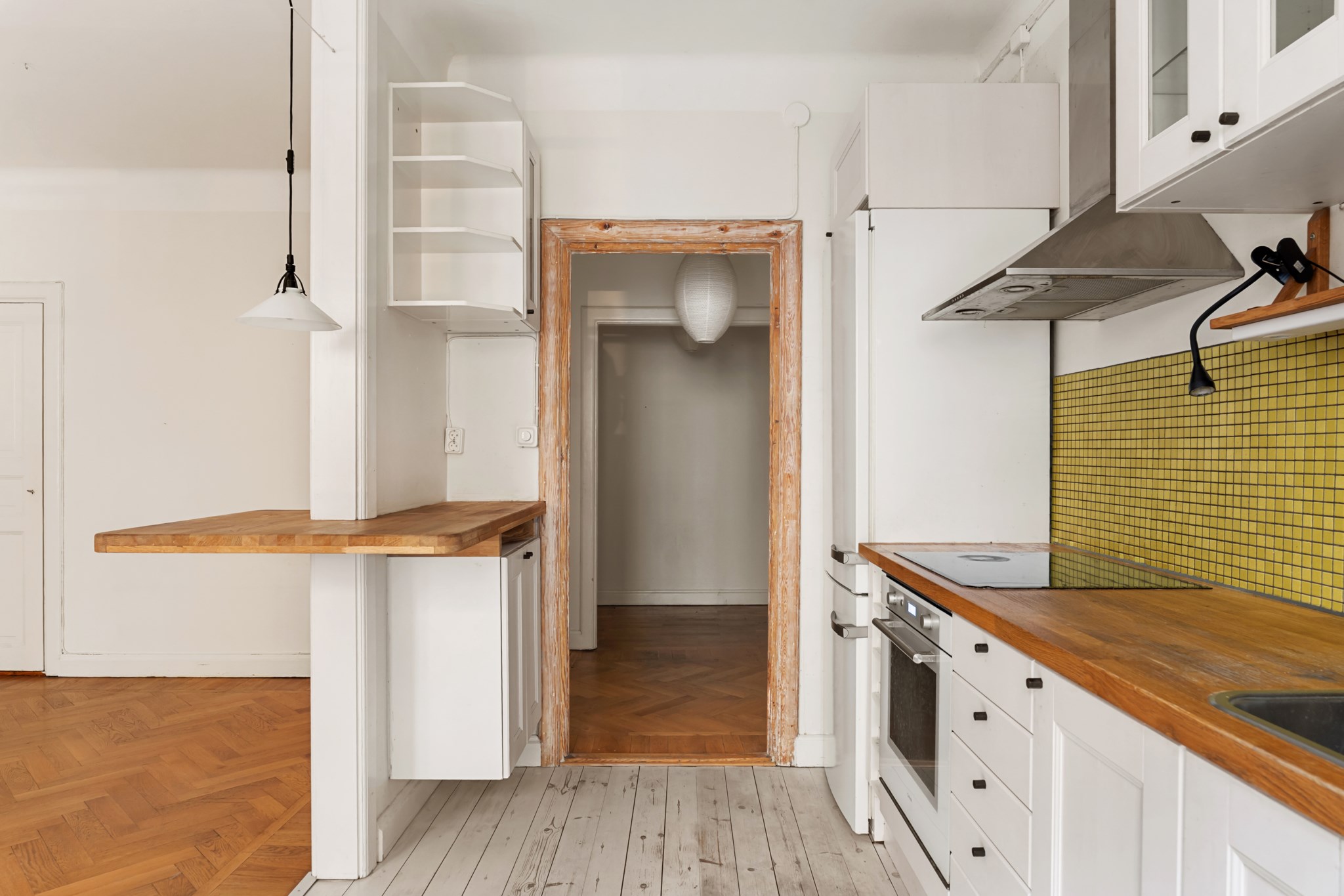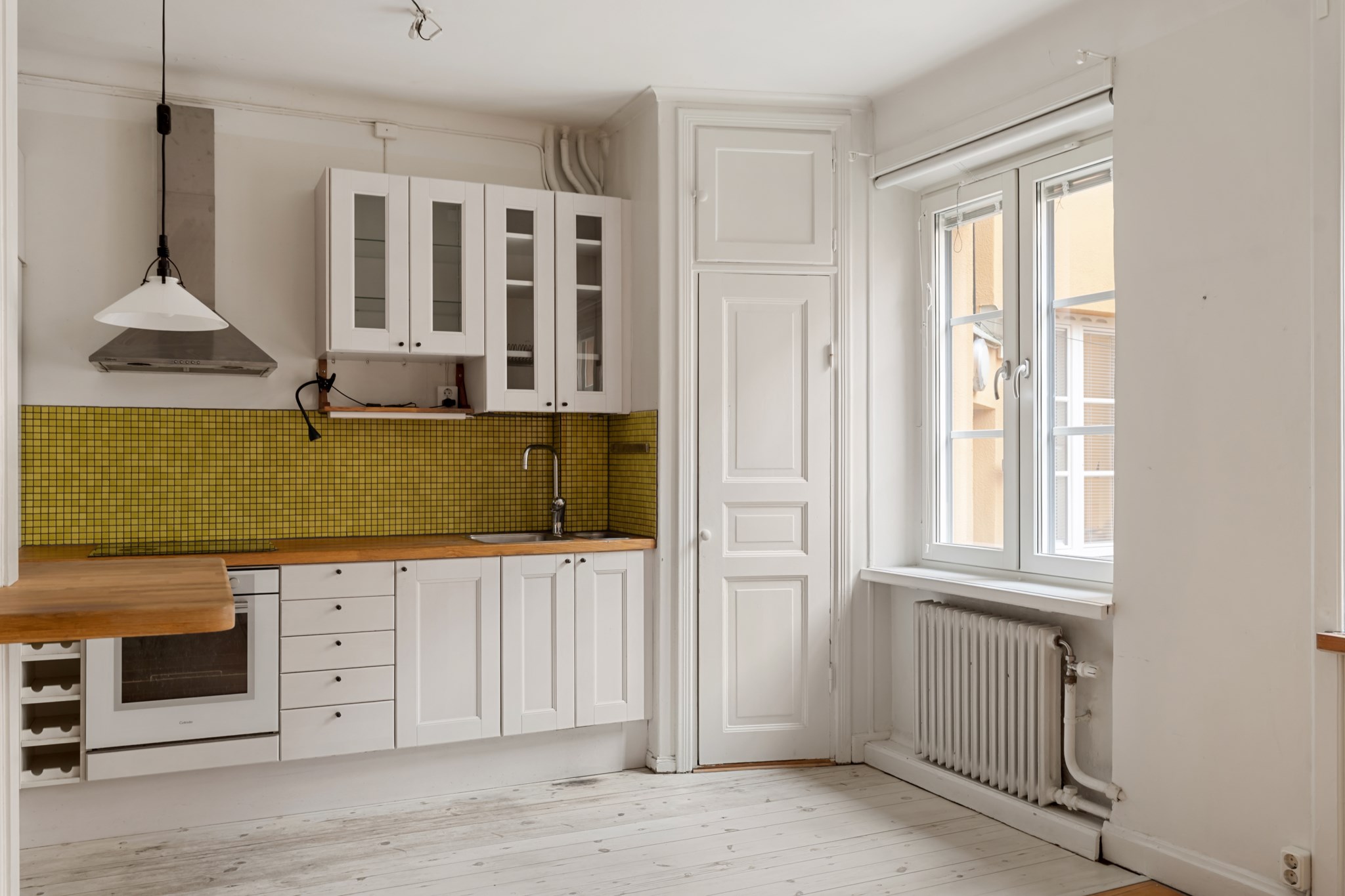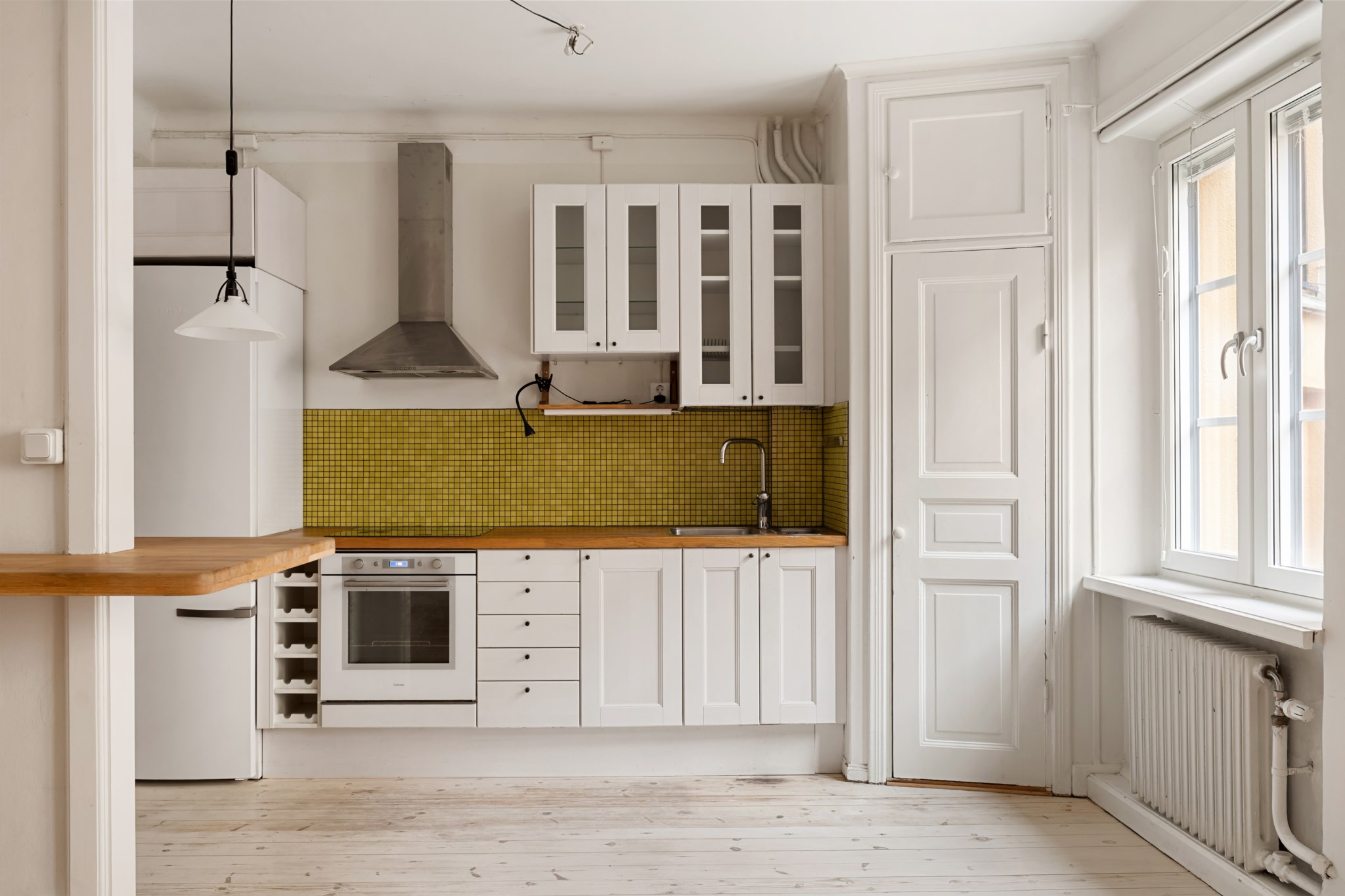 Kök med köksinredning i vita skåpsluckor och lådor. Bänkskiva i trä och grön mosaik som stänkskydd. Köket är utrustat med spis/ugn, köksfläkt samt kyl/frys i vit kulör. Vitlaserat trägolv med väggar målade i ljus kulör. Plats för mindre matbord. I samband med det kommande stambytet kommer köksstammarna att renoveras och förberedas för installation av diskmaskin.