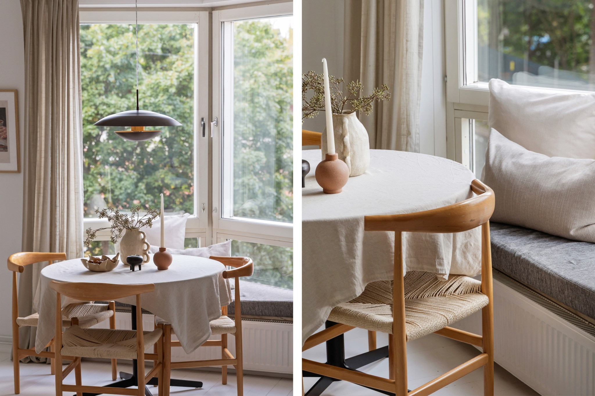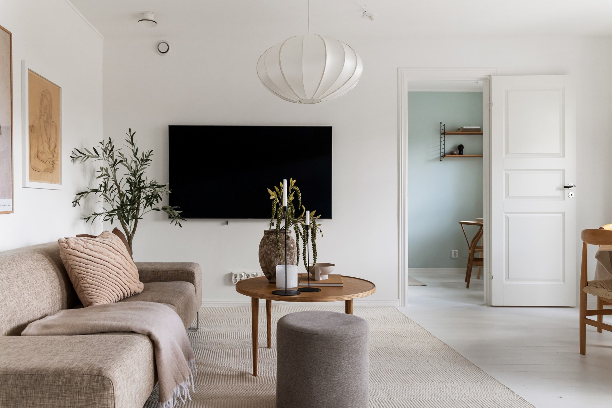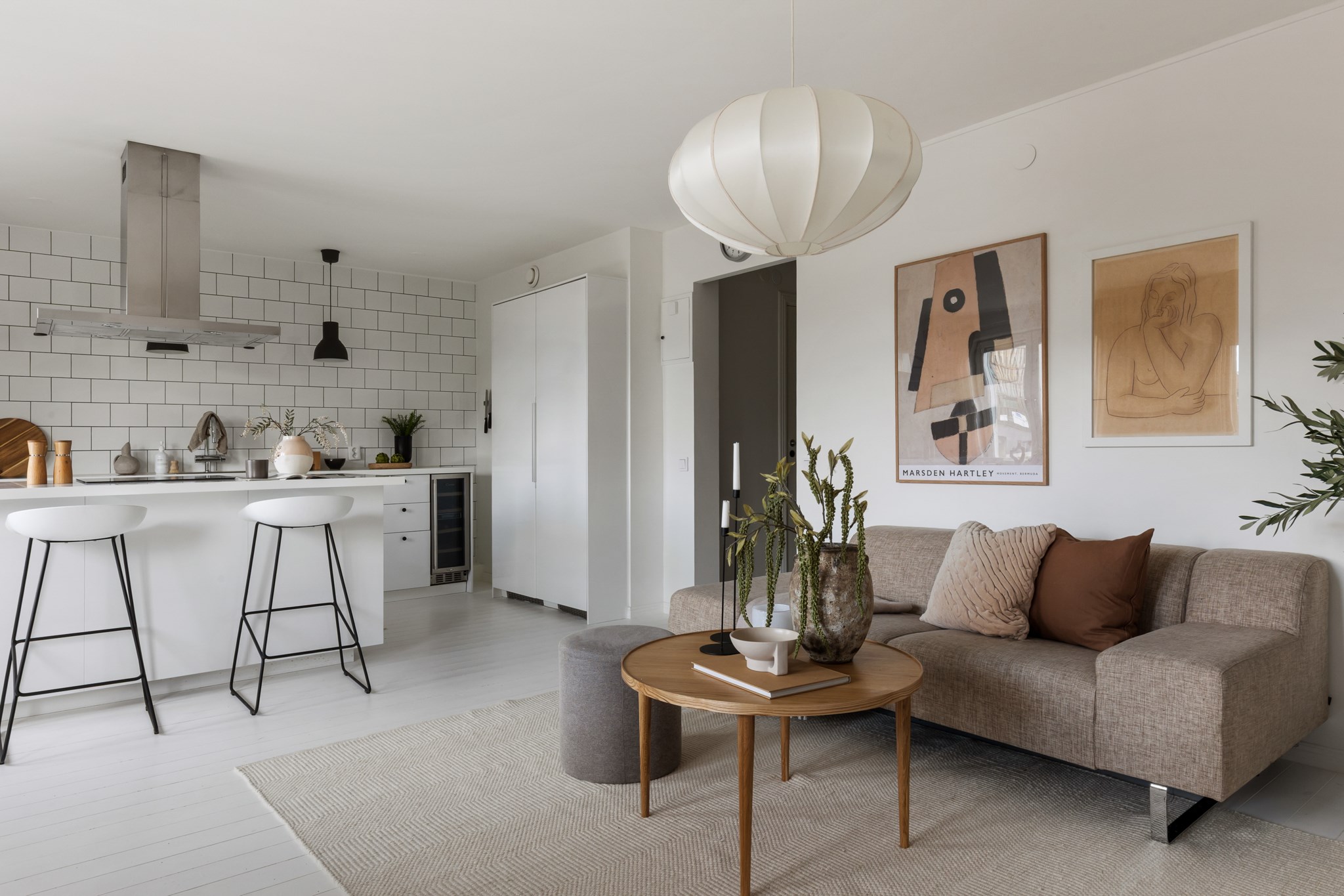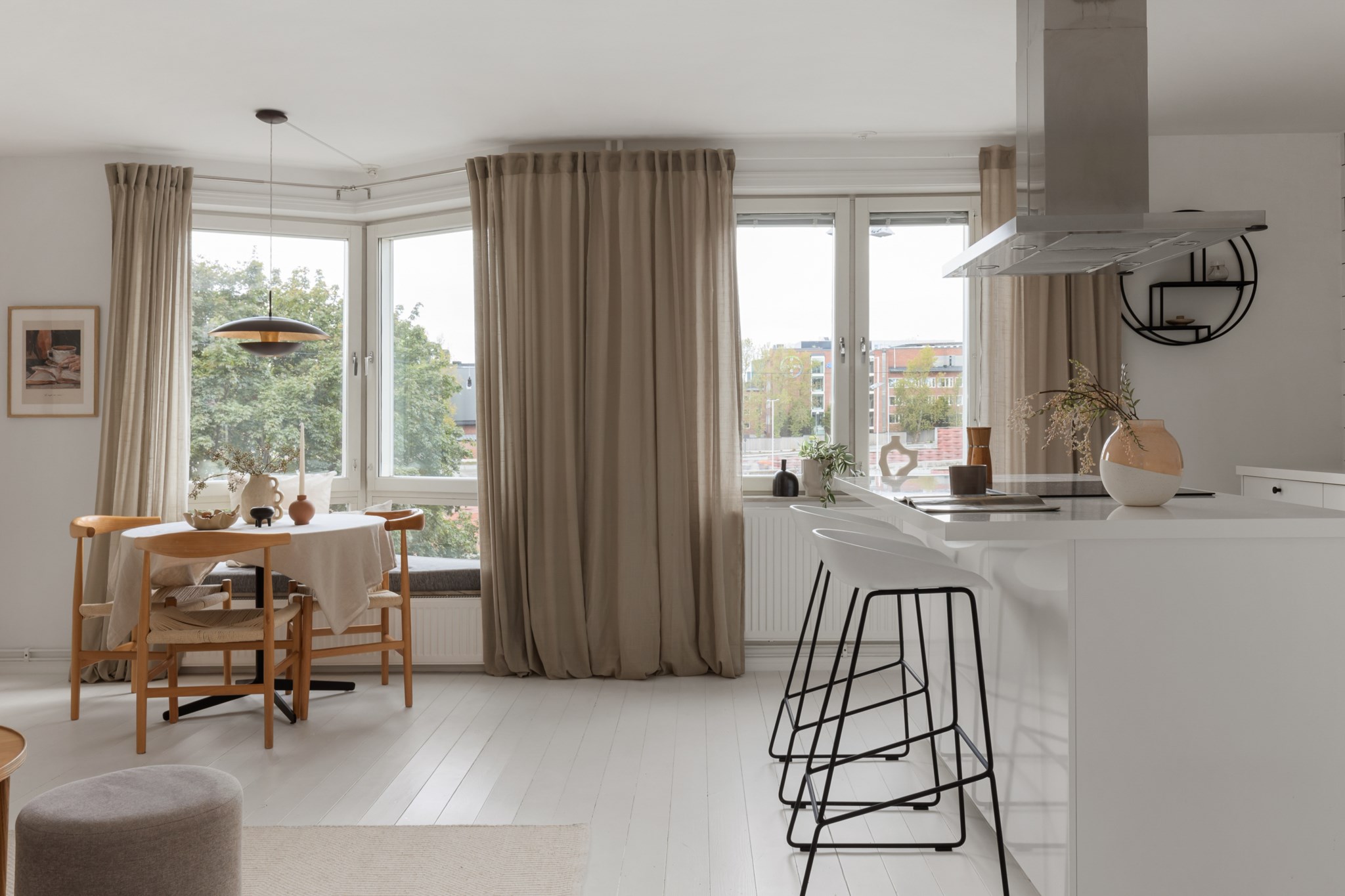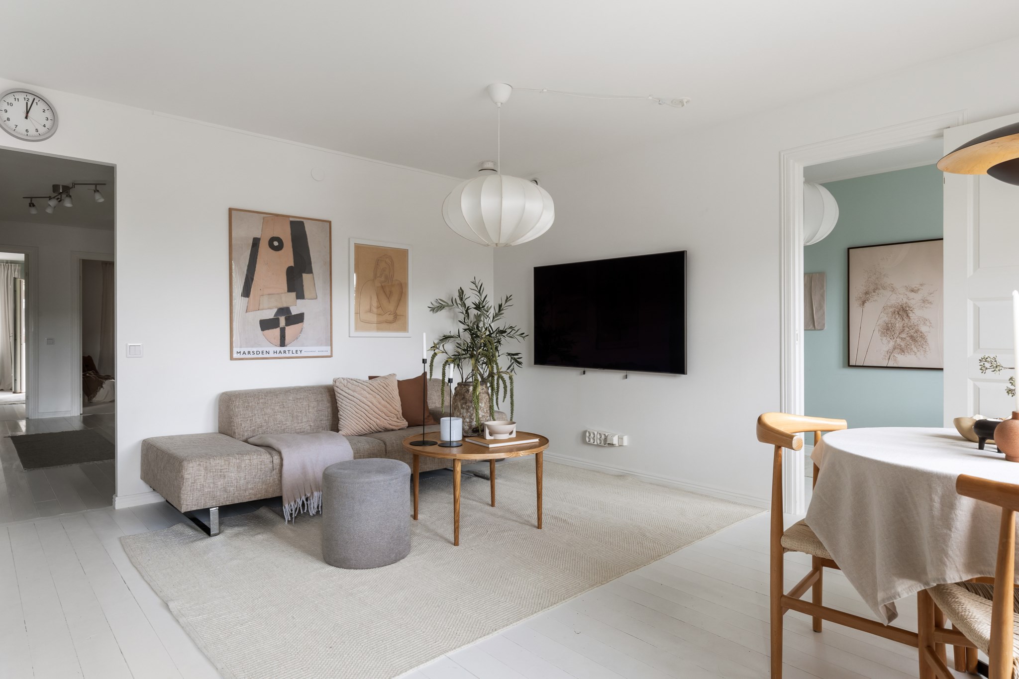 Trevligt vardagsrum med öppen planlösning mot köket som skapar en social och inbjudande yta. Generöst ljusinsläpp från flera fönster, varav ett charmigt burspråk som även kan nyttjas som sittplats. Här finns gott om plats för både soffa och matbord, vilket gör rummet till en naturlig samlingspunkt. Ljusmålade ytskikt och ljust golv.