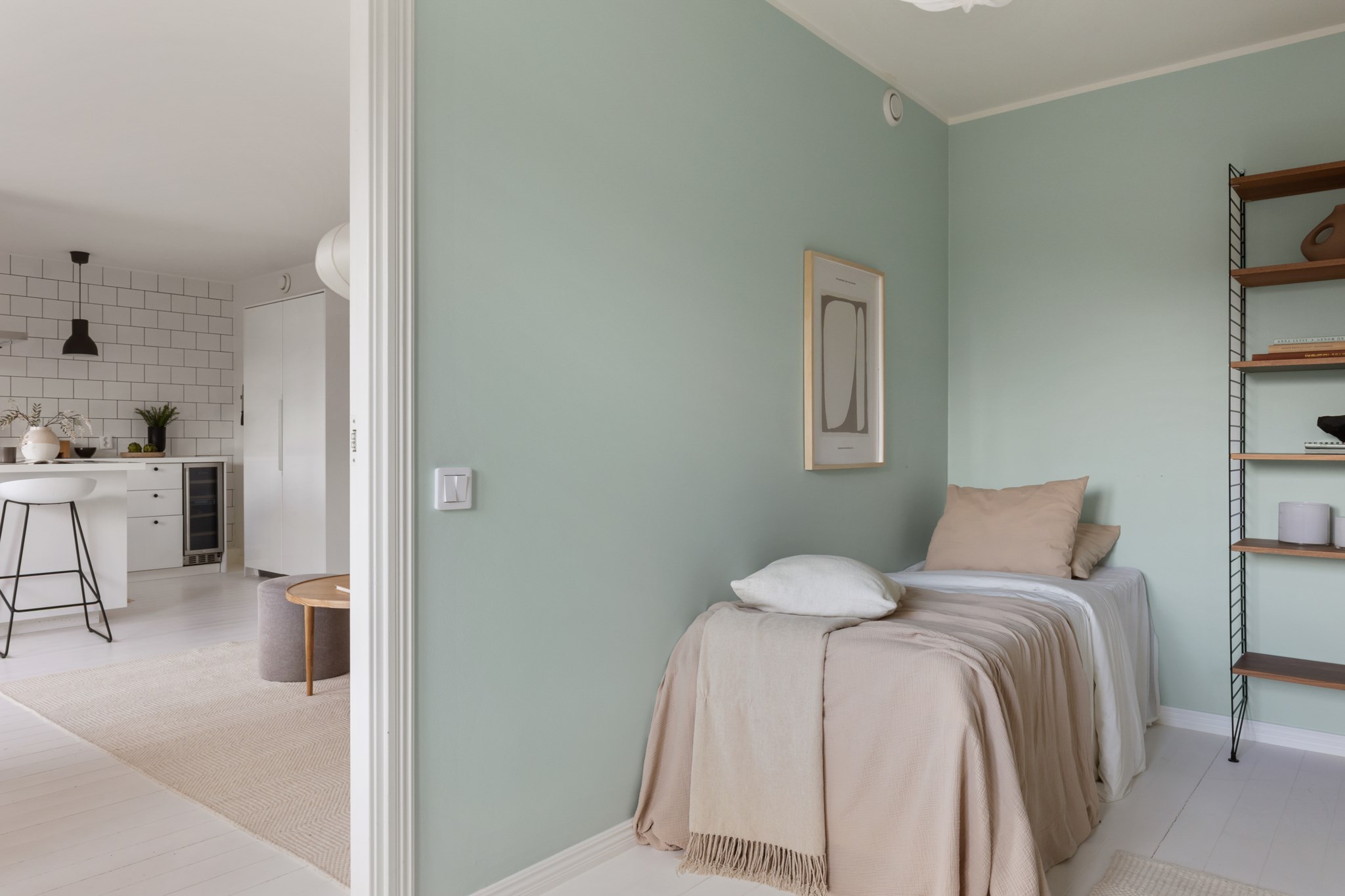 Mysigt sovrum med ingång från vardagsrummet. Här finns plats för säng samt skrivbord eller annan möblering efter behov. Ett fönster utan insyn släpper in fint ljus och väggar målade i en behaglig kulör tillsammans med ljust golv skapar en rogivande atmosfär.