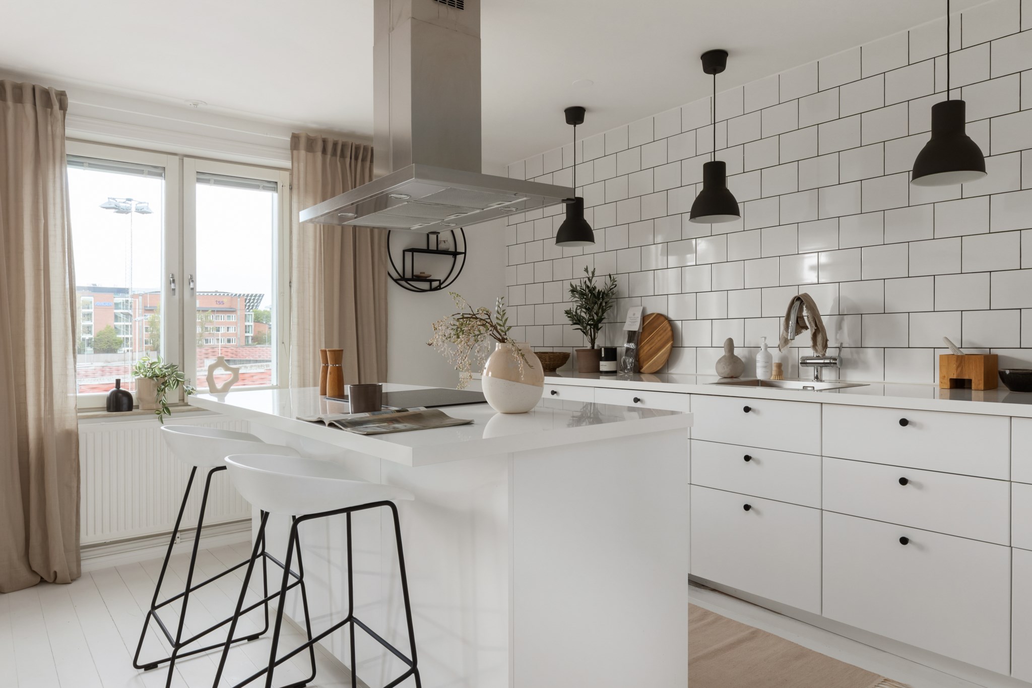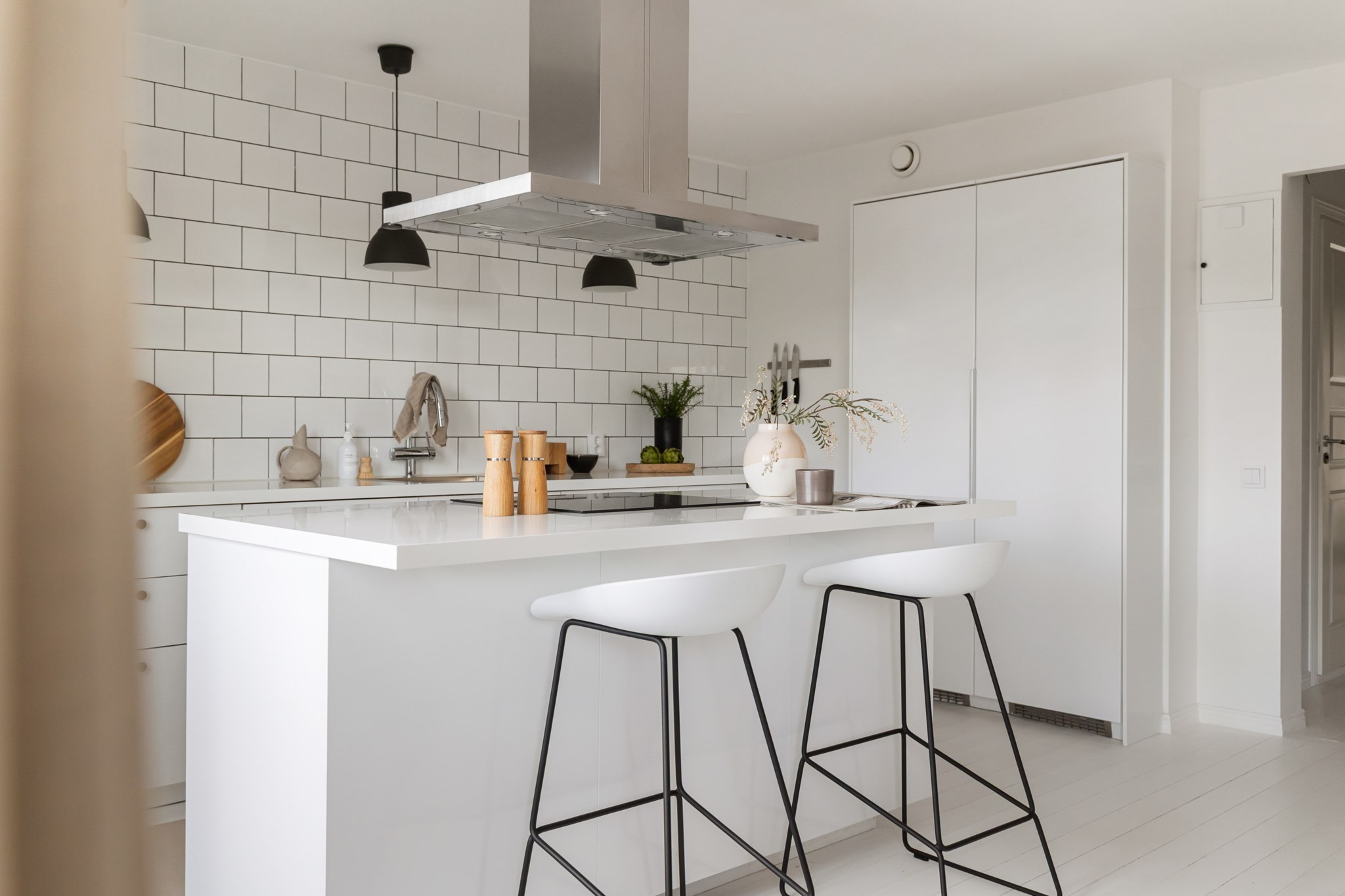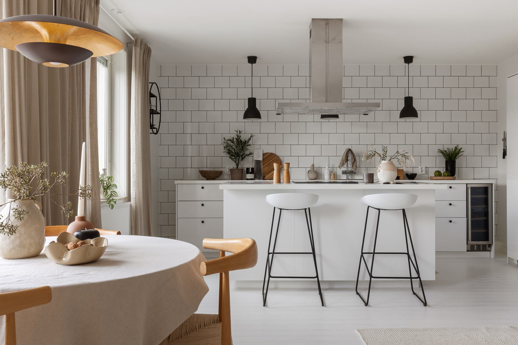 Stilrent kök inrett med högkvalitativa material och genomtänkt design. En köksö med sittplatser, spishäll, ugn och takhängd fläkt skapar en social yta för matlagning och umgänge. Inredningen består av ljusa, släta köksluckor, ljus bänkskiva och vit kaklad väggpanel som sträcker sig från bänkskiva upp till tak. Övrig maskinell utrustning utgörs av kyl/frys och diskmaskin. Ljusmålade ytskikt och ljust golv.