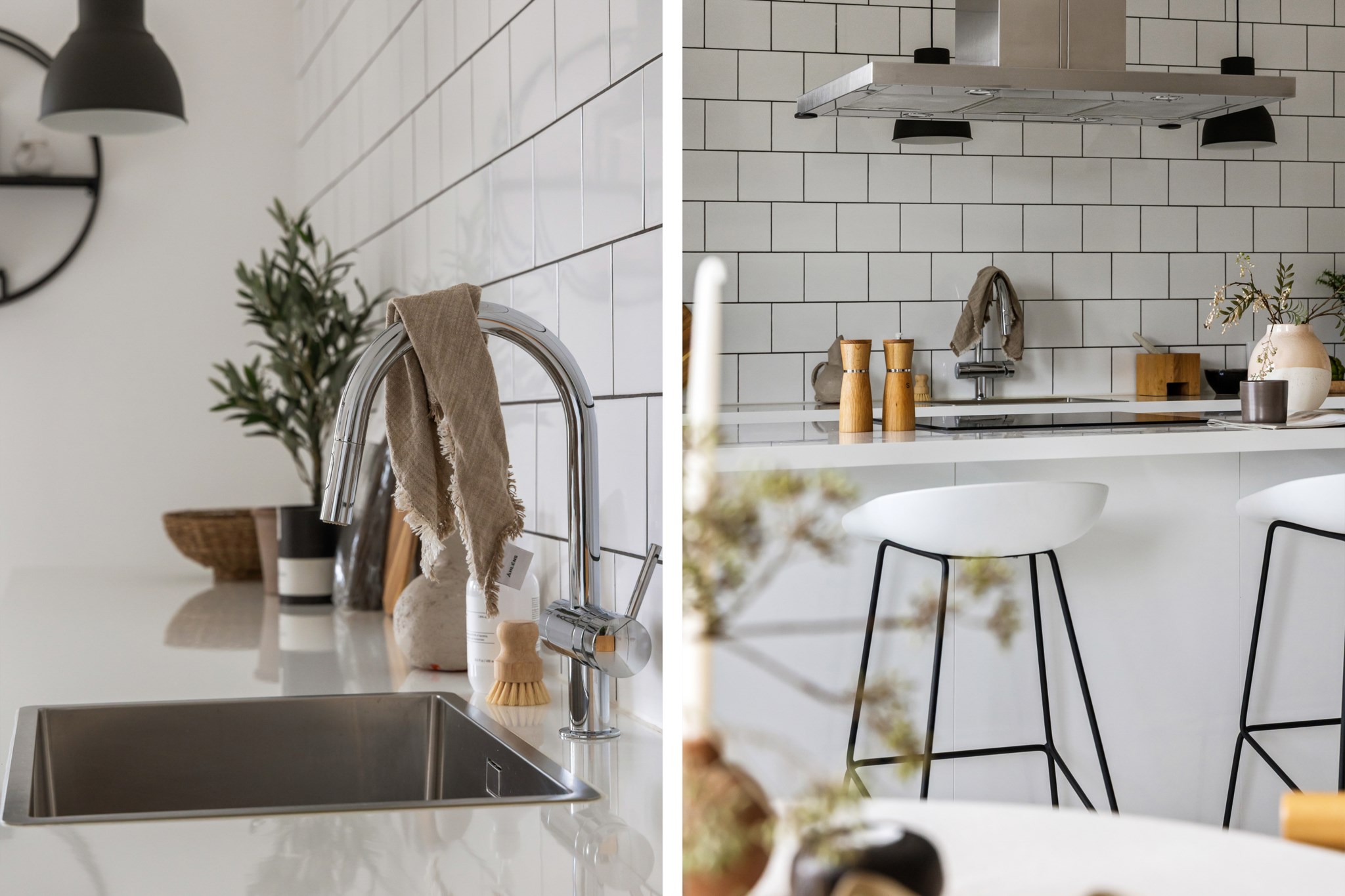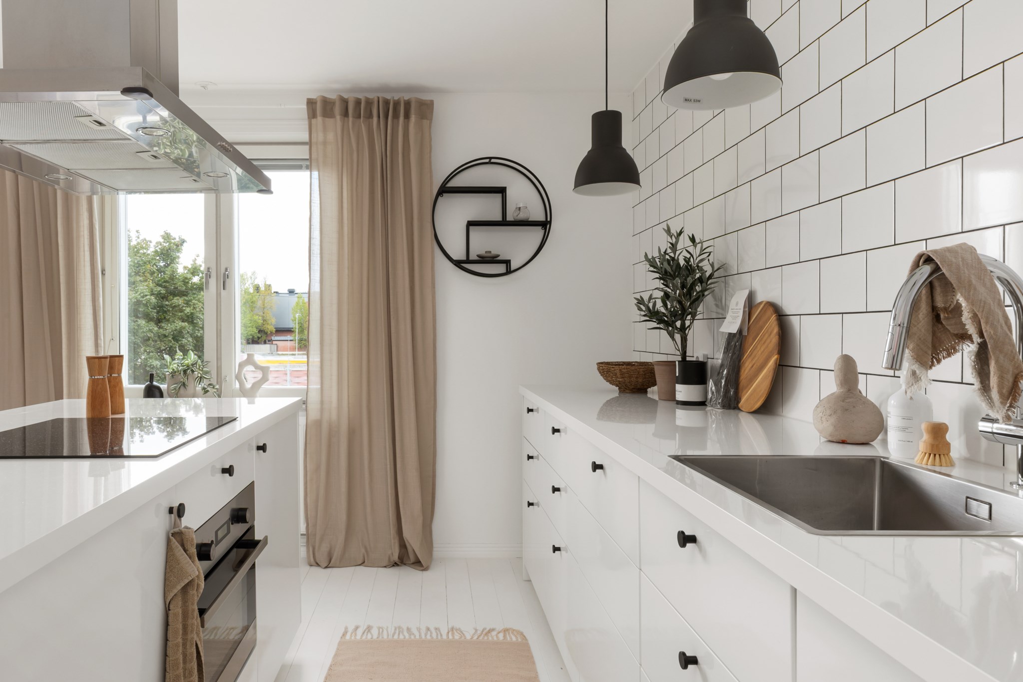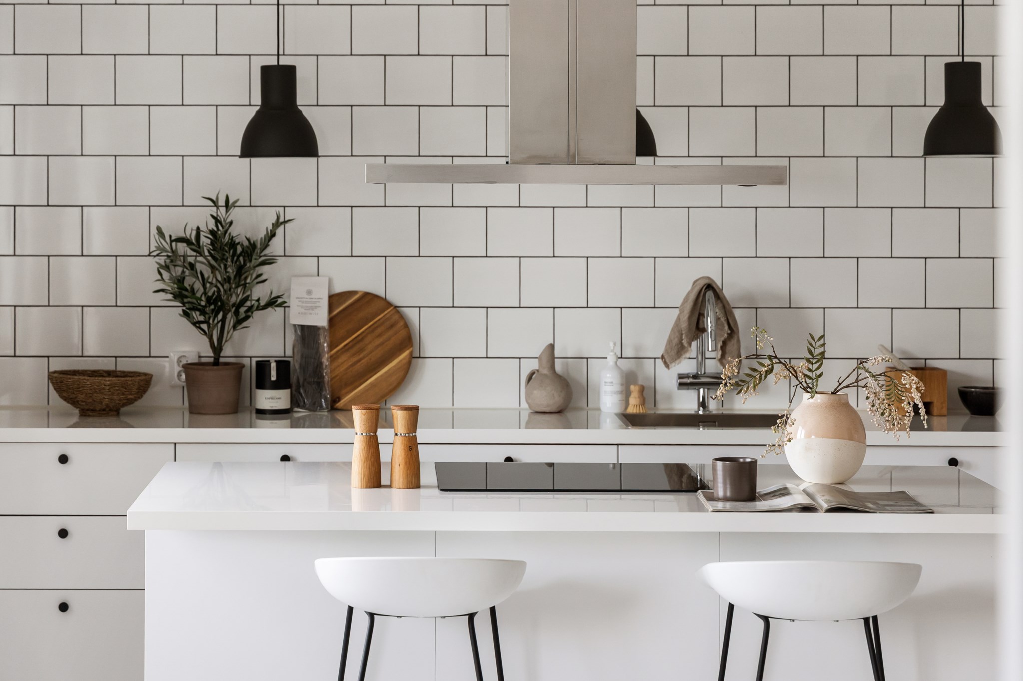 Stilrent kök inrett med högkvalitativa material och genomtänkt design. En köksö med sittplatser, spishäll, ugn och takhängd fläkt skapar en social yta för matlagning och umgänge. Inredningen består av ljusa, släta köksluckor, ljus bänkskiva och vit kaklad väggpanel som sträcker sig från bänkskiva upp till tak. Övrig maskinell utrustning utgörs av kyl/frys och diskmaskin. Ljusmålade ytskikt och ljust golv.