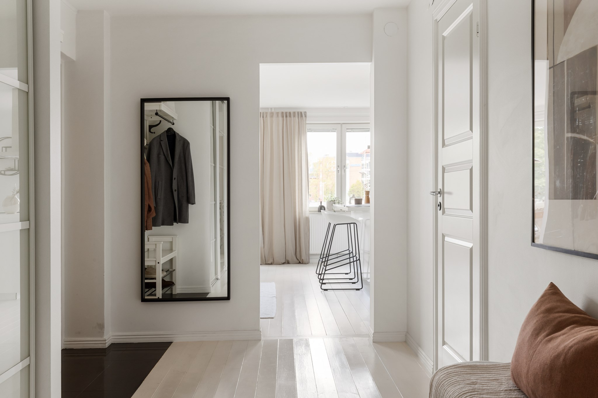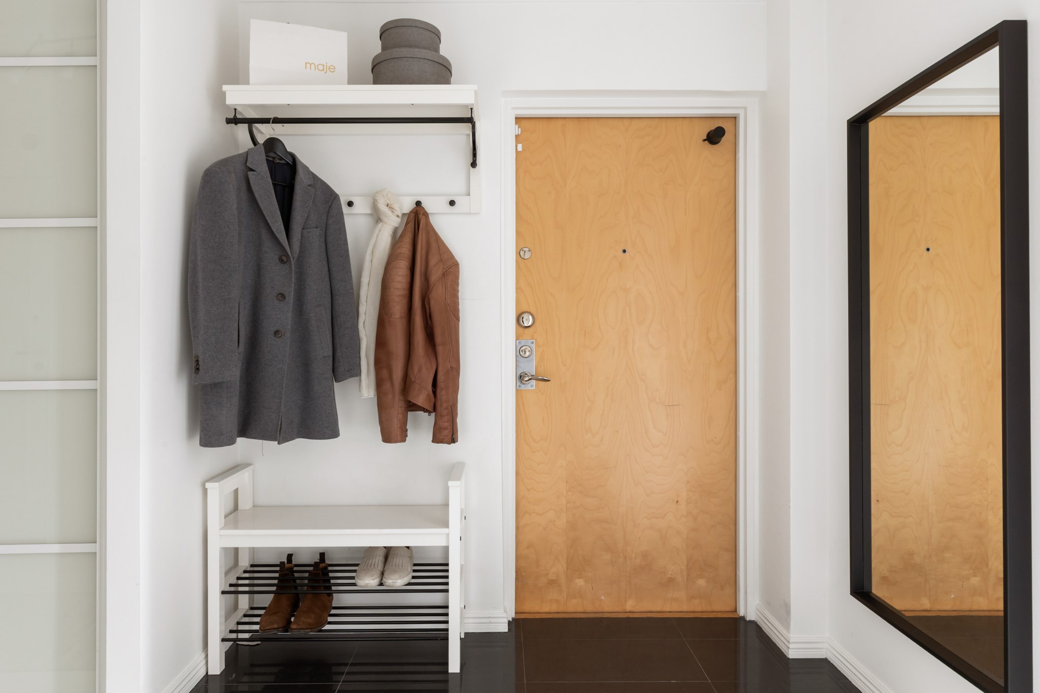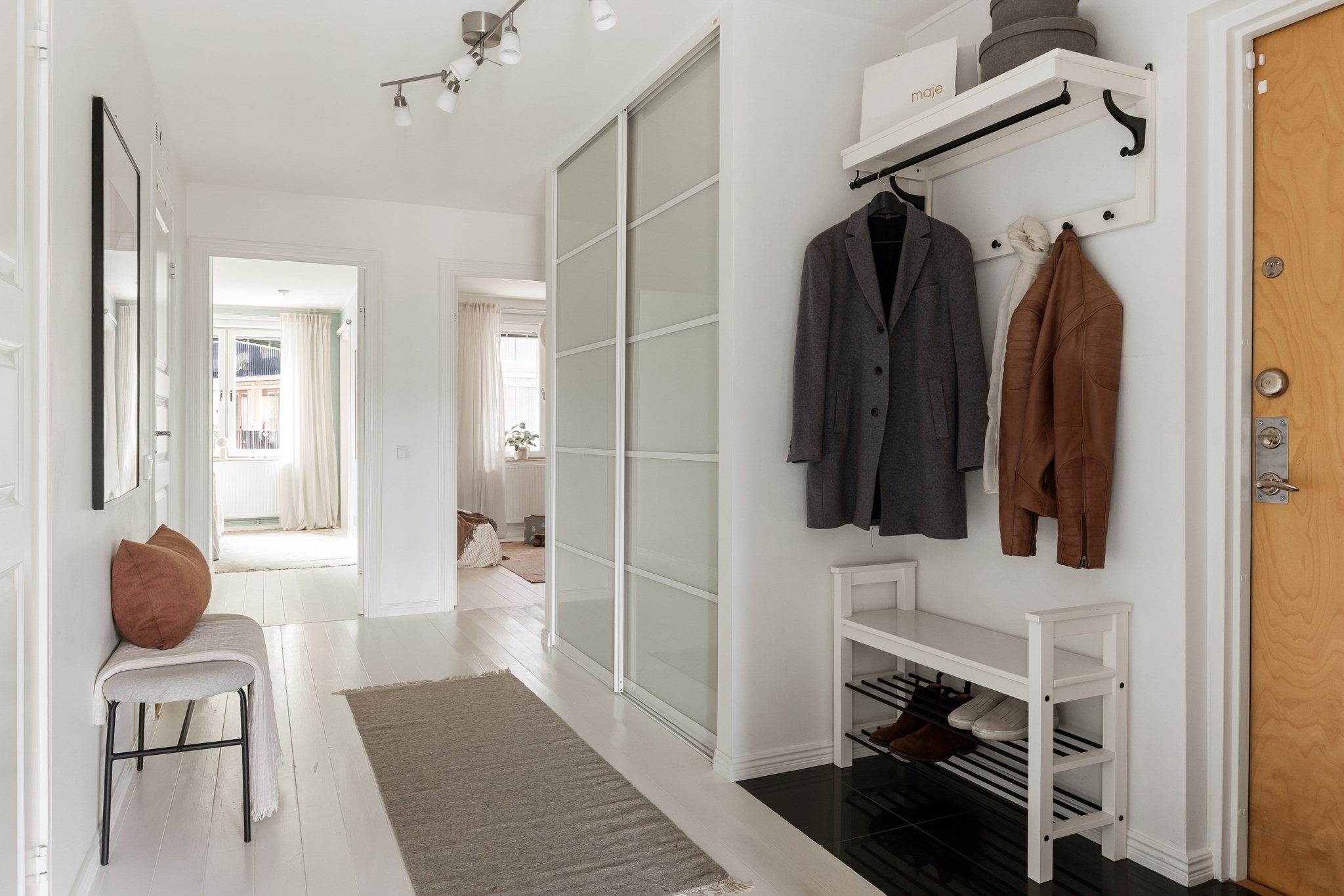 Ljus och välkomnande hall med mörkt golv direkt intill ytterdörren som smidigt övergår i ett ljust golv vidare in i bostaden. Här finns plats för avhängning av ytterkläder och skor på hatthylla i direkt anslutning till ytterdörren samt goda förvaringsmöjligheter i en rymlig garderob försedd med skjutdörrar.