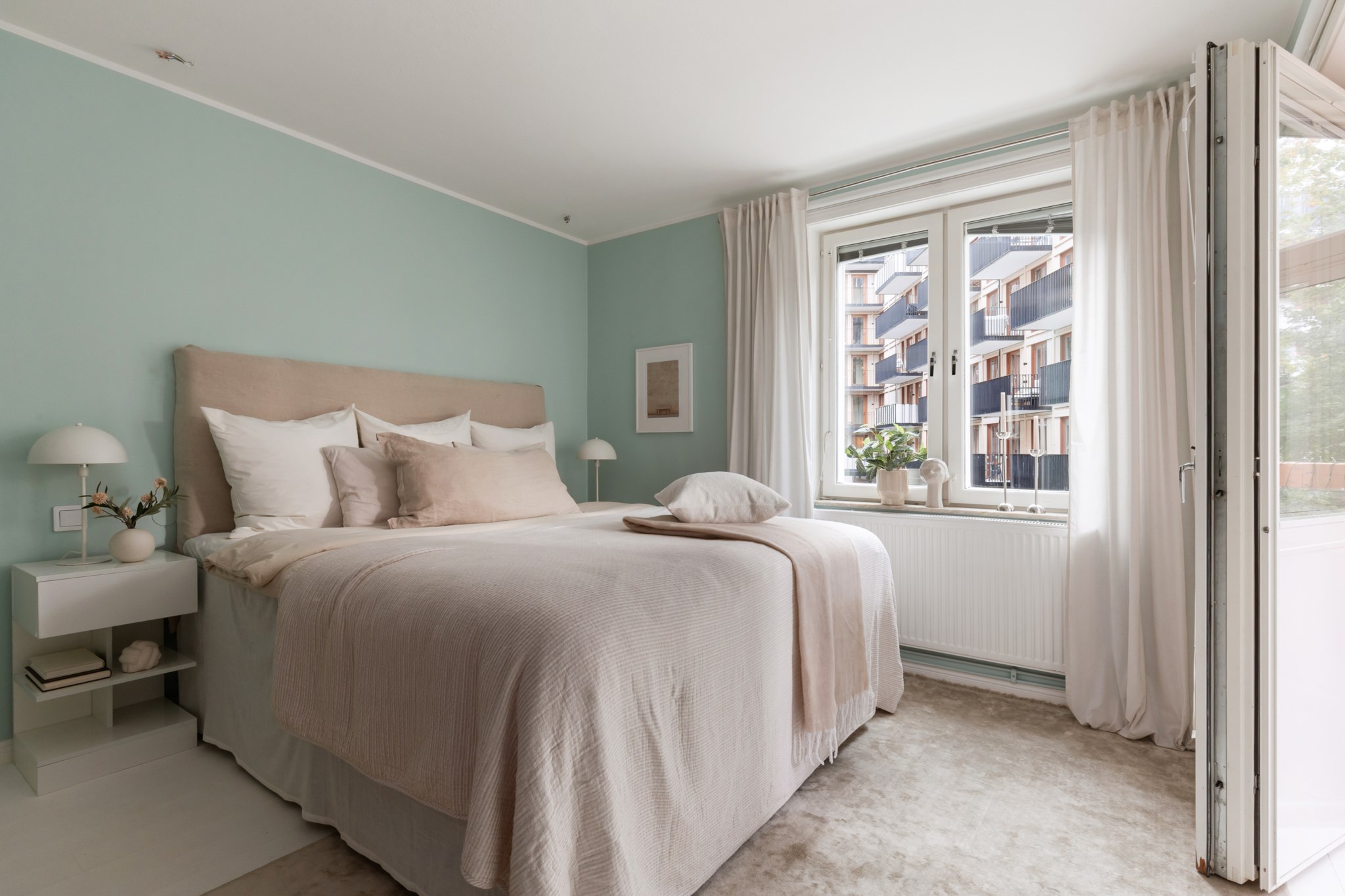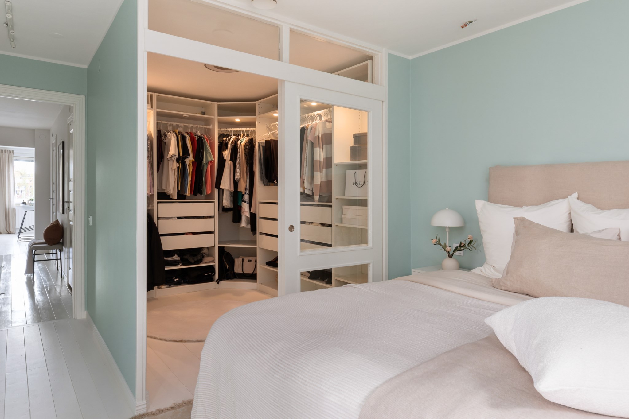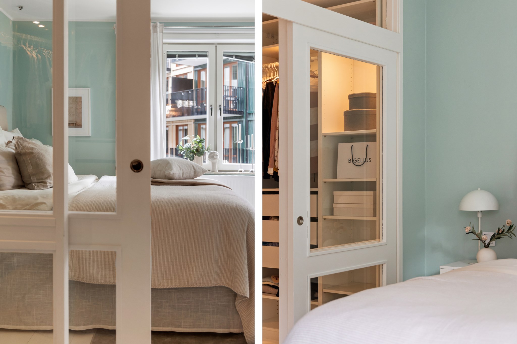 Rogivande Master Bedroom med tillhörande lyxig klädkammare, omsluten av glaspartier och skjutdörr. Här finns gott om plats för dubbelsäng med sängbord på vardera sida. Ett generöst fönster tillsammans med utgången till bostadens balkong ger ett härligt ljusinsläpp, medan de mjukt kulörsatta väggarna och det ljusa golvet ramar in rummet på ett elegant sätt.