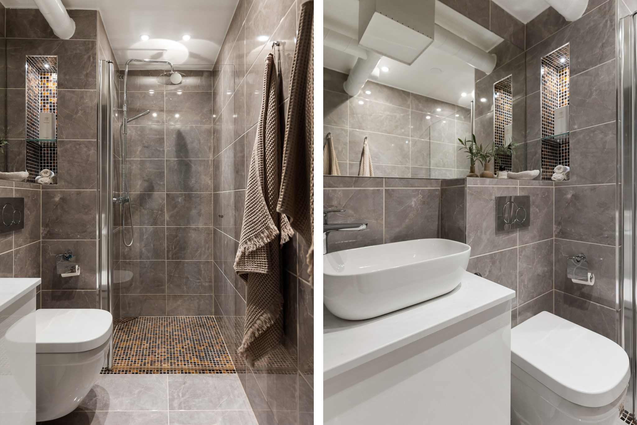 Helkaklad WC/dusch inredd WC, handfat med kommod, spegel och en lyxig takdusch med duschvägg i klarglas.