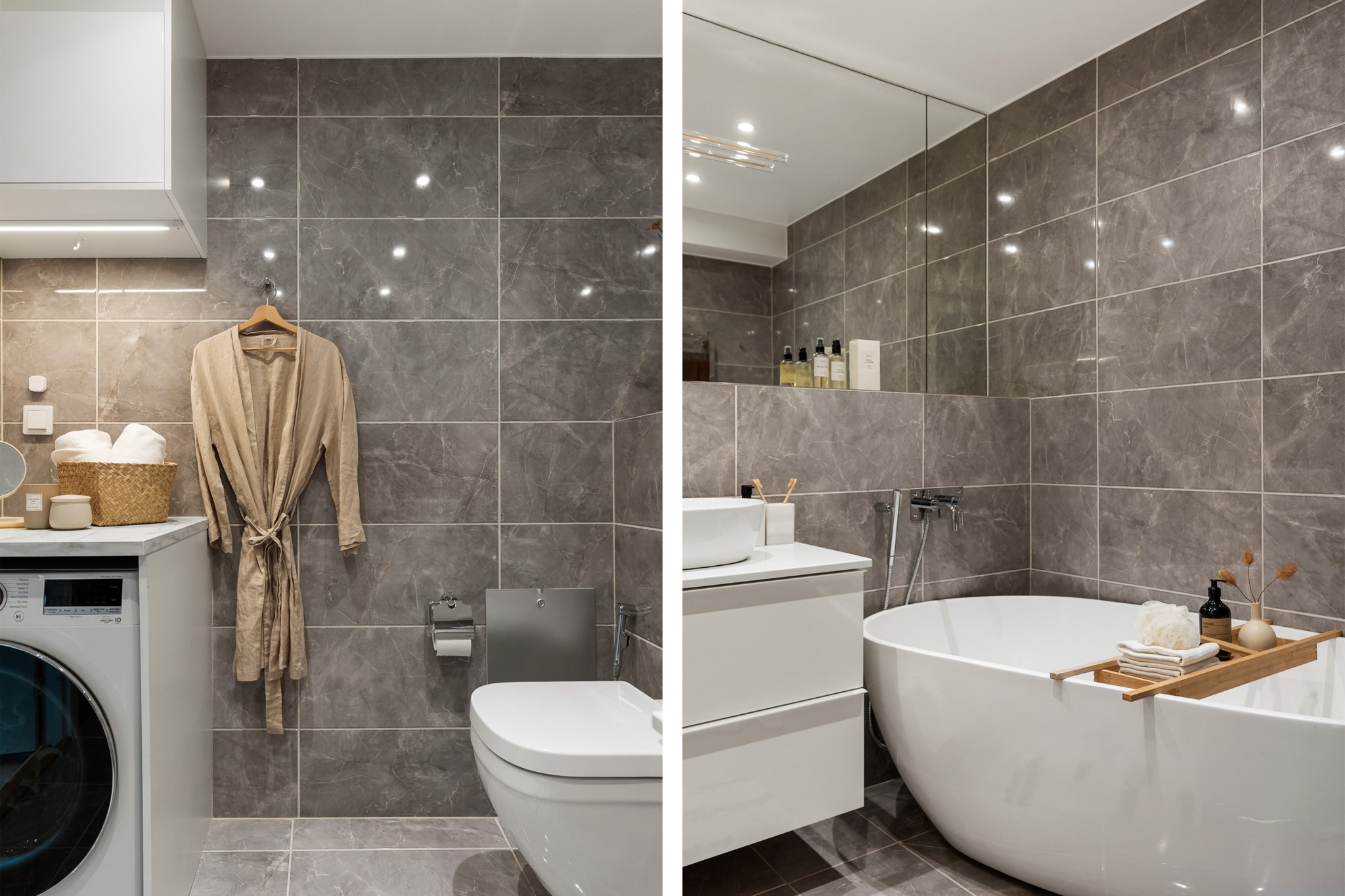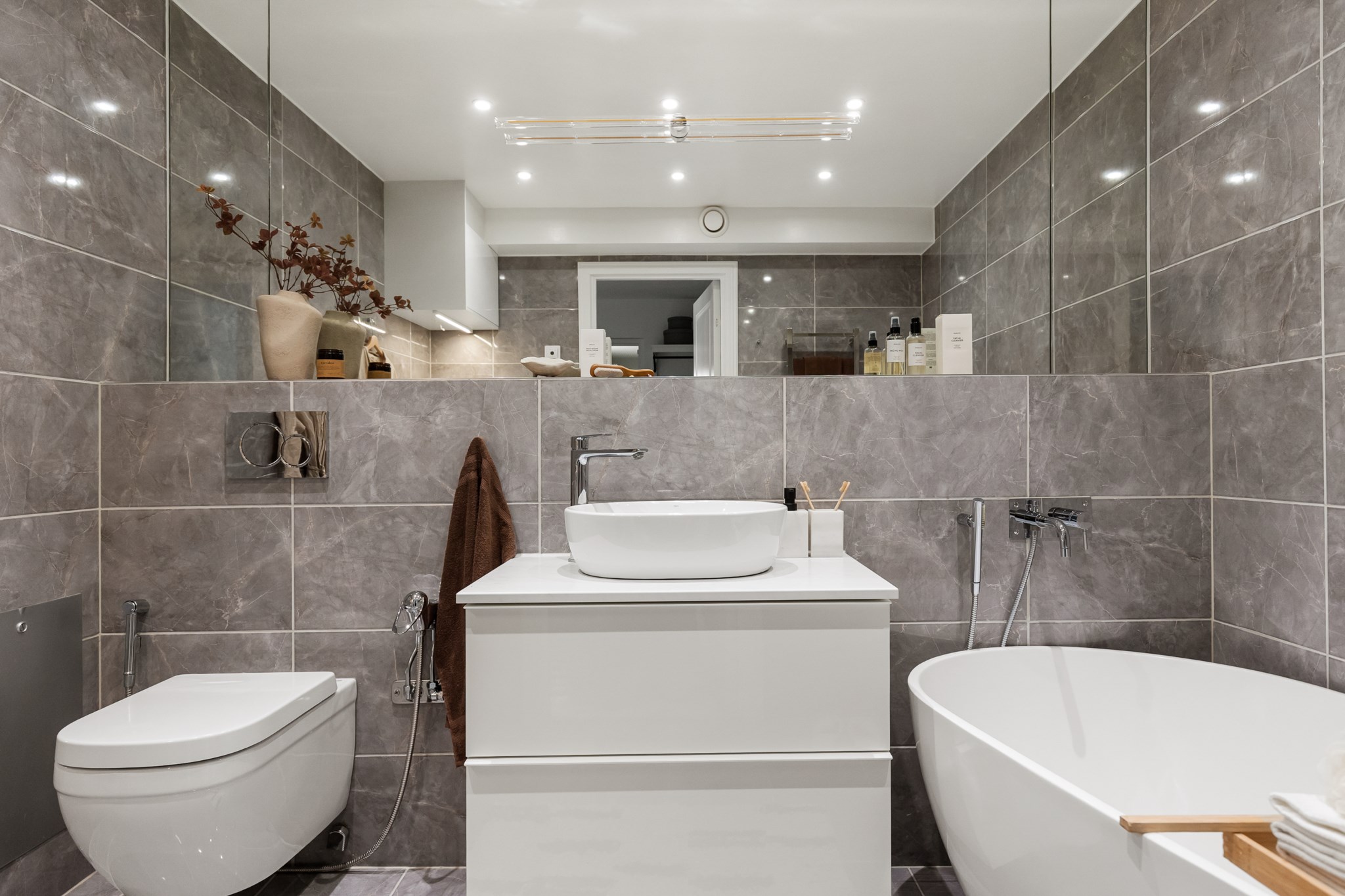 Modernt badrum med kaklade väggar och golv samt stilrena detaljer. Här finns WC, handfat med kommod, stor spegel och badkar samt praktisk förvaring och tvättmaskin.
