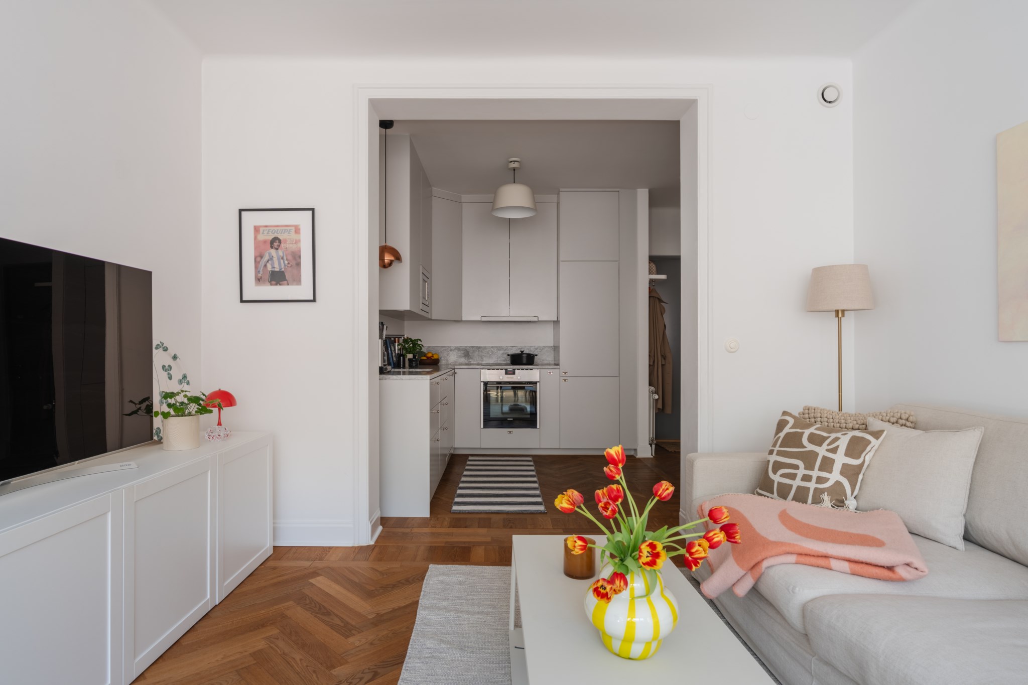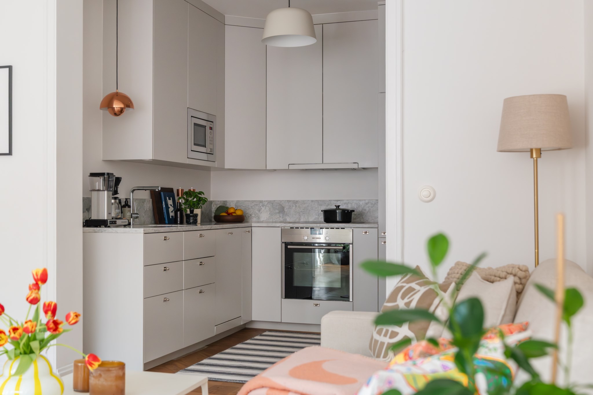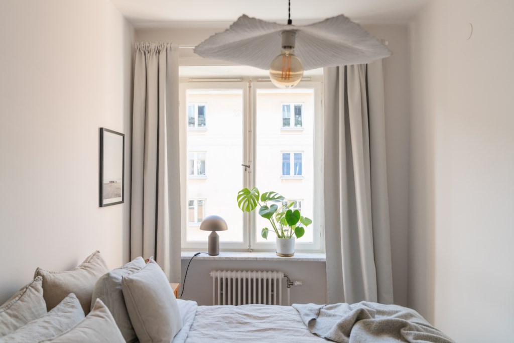 Lägenheten präglas av en ljus och inbjudande atmosfär. Det rymliga vardagsrummet erbjuder gott om plats för både en bekväm soffgrupp och en trivsam matplats, perfekt för såväl avkoppling som umgänge. De stora fönstren ger ett generöst ljusinsläpp från tre väderstreck. Köket ligger i social anslutning till vardagsrummet och är modernt utformat med rymliga arbetsytor och gott om förvaring, vilket gör det både praktiskt och inspirerande att laga mat. Sovrummet är rofyllt och väl tilltaget med plats för dubbelsäng samt förvaring. Här finns även garderobslösningar som gör rummet både funktionellt och lättmöblerat. Badrummet är stilrent helkaklat med marmorgolv och funktionellt planerat med både tvättmaskin och torktumlare, en uppskattad och lyxig bekvämlighet i en bostad av denna storlek.
