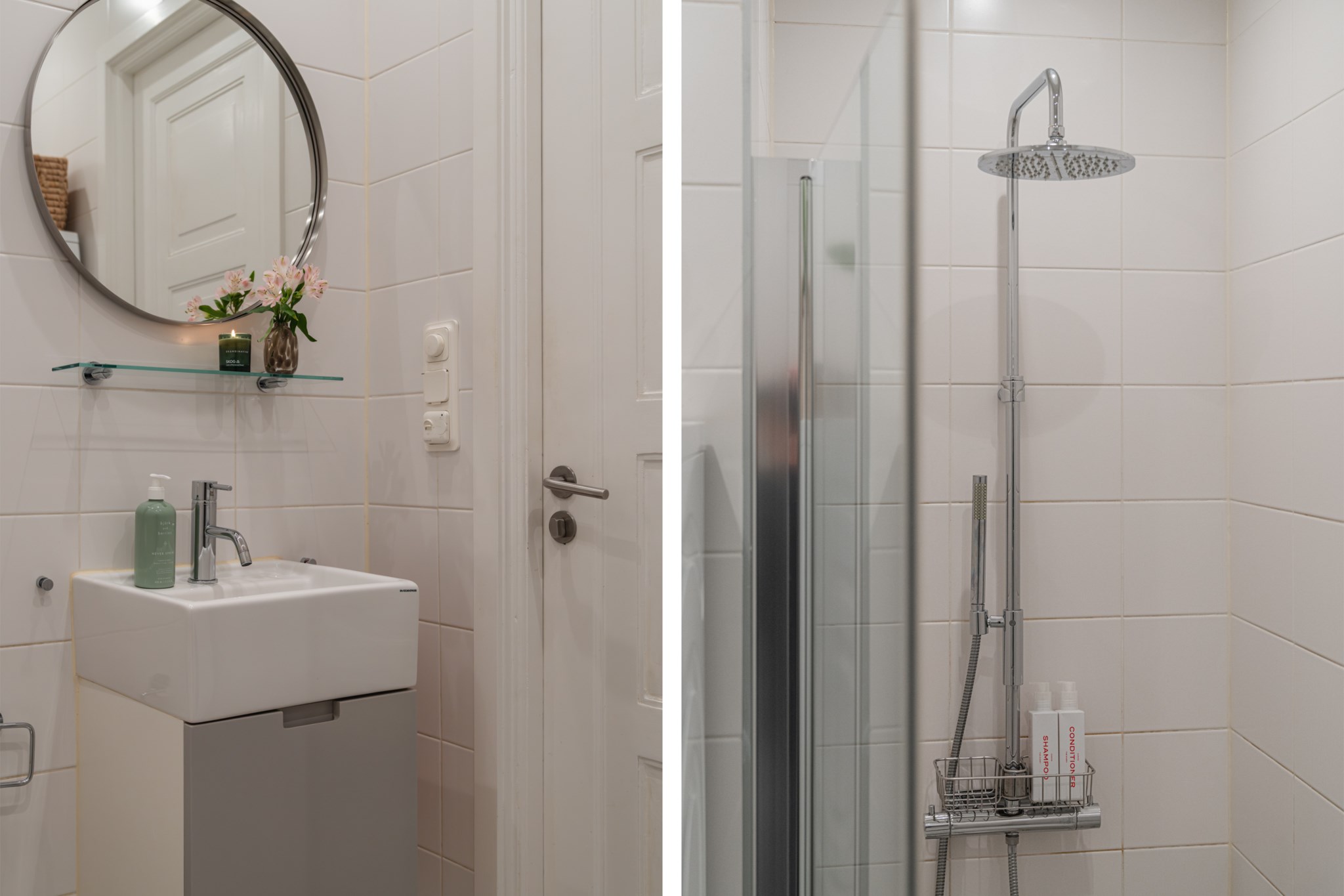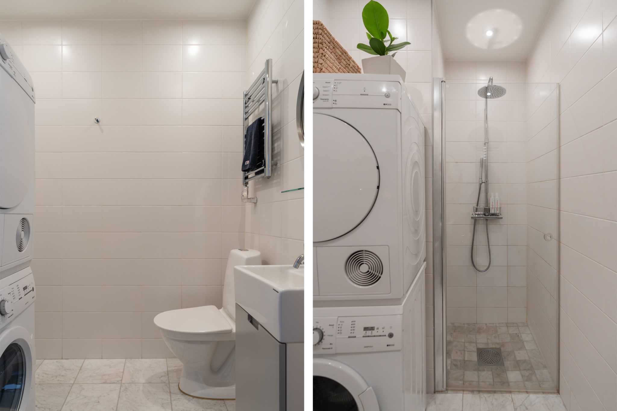 Rymligt badrum med ljust kakel och klinker. Badrummet är utrustat med WC, handfat ovan kommod, handdukstork, spegel, samt dusch. Extra bekvämligheter genom golvvärme samt tvättmaskin och torktumlare från Siemens.