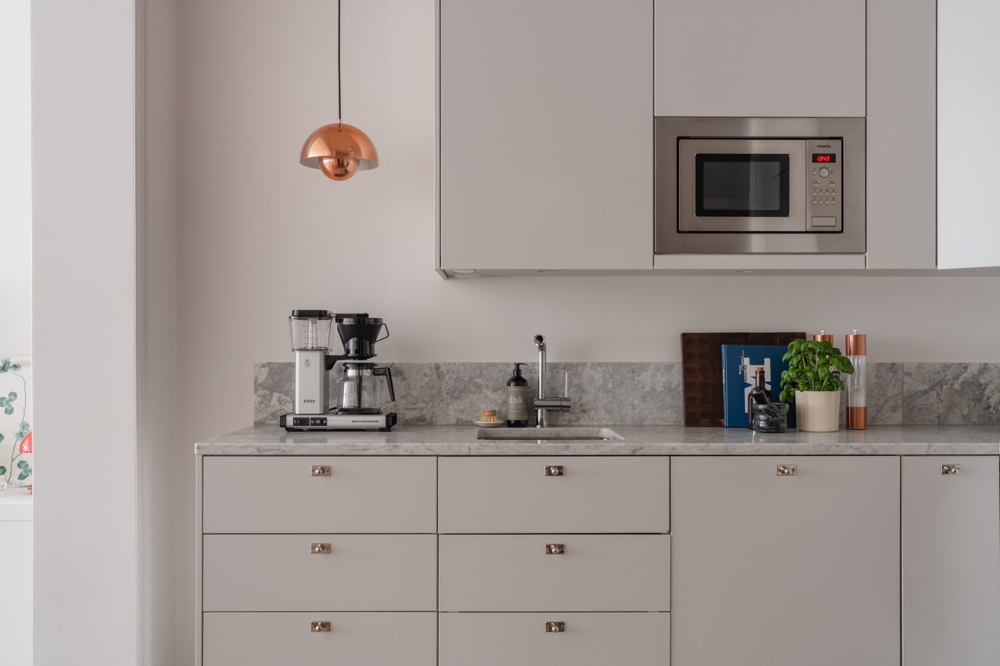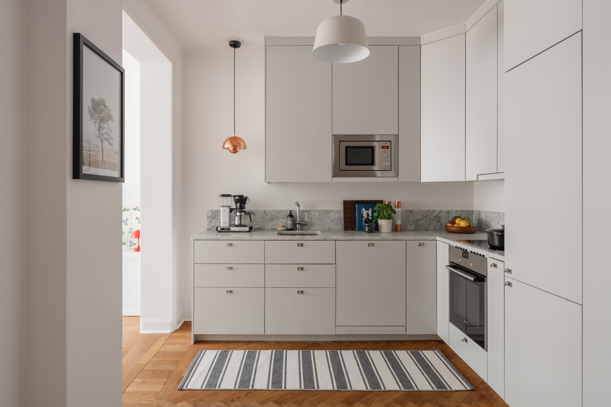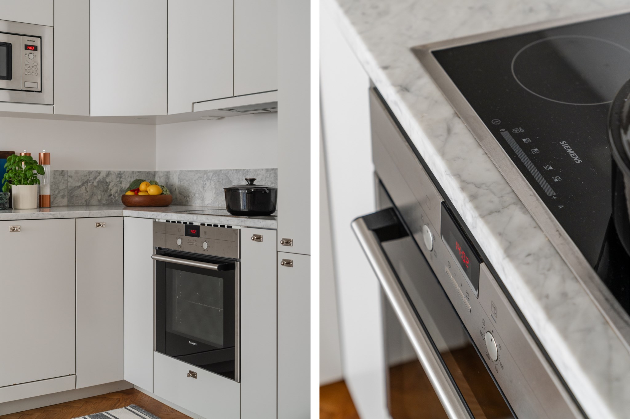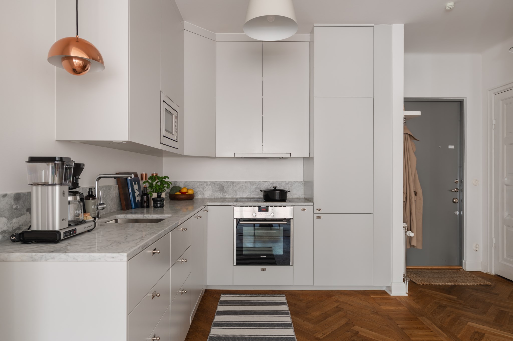 Modernt kök med smakfulla materialval bestående av ljusa köksluckor och ljus bänkskiva med stänkskydd ovan. Den maskinella utrustningen består av diskho, spis, ugn, micro, diskmaskin samt kyl och frys från Siemens. Tidlösa ytskikt bestående av ljusa väggar och ljus fiskbensparkett.